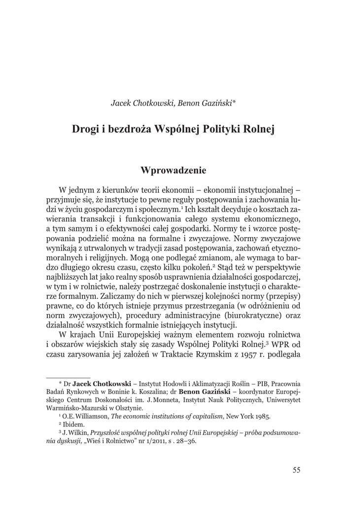 Jacek Chotkowski, Benon Gaziński* Drogi i bezdroża Wspólnej Polityki Rolnej Wprowadzenie W jednym z kierunków teorii ekonomii – ekonomii instytucjonalnej – przyjmuje się, że instytucje to pewne reguły postępowania i zachowania ludzi w życiu gospodarczym i społecznym.1 Ich kształt decyduje o kosztach zawierania transakcji i funkcjonowania całego systemu ekonomicznego, a tym samym i o efektywności całej gospodarki. Normy te i wzorce postępowania podzielić można na formalne i zwyczajowe. Normy zwyczajowe wynikają z utrwalonych w tradycji zasad postępowania, zachowań etycznomoralnych i religijnych. Mogą one podlegać zmianom, ale wymaga to bardzo długiego okresu czasu, często kilku pokoleń.2 Stąd też w perspektywie najbliższych lat jako realny sposób usprawnienia działalności gospodarczej, w tym i w rolnictwie, należy postrzegać doskonalenie instytucji o charakterze formalnym. Zaliczamy do nich w pierwszej kolejności normy (przepisy) prawne, co do których istnieje przymus przestrzegania (w odróżnieniu od norm zwyczajowych), procedury administracyjne (biurokratyczne) oraz działalność wszystkich formalnie istniejących instytucji. W krajach Unii Europejskiej ważnym elementem rozwoju rolnictwa i obszarów wiejskich stały się zasady Wspólnej Polityki Rolnej.3 WPR od czasu zarysowania jej założeń w Traktacie Rzymskim z 1957 r. podlegała * Dr Jacek Chotkowski – Instytut Hodowli i Aklimatyzacji Roślin – PIB, Pracownia Badań Rynkowych w Boninie k. Koszalina; dr Benon Gaziński – koordynator Europejskiego Centrum Doskonałości im. J. Monneta, Instytut Nauk Politycznych, Uniwersytet Warmińsko-Mazurski w Olsztynie. 1 O.E. Williamson, The economic institutions of capitalism, New York 1985. 2 Ibidem. 3 J. Wilkin, Przyszłość wspólnej polityki rolnej Unii Europejskiej – próba podsumowania dyskusji, „Wieś i Rolnictwo” nr 1/2011, s . 28–36. 55 Studia Europejskie, 4/2011 wielu zmianom. Istotne jej reformy były skutkiem postanowień GATT liberalizujących politykę handlową.4 Dotychczasowa ewolucja WPR polegała na stopniowej eliminacji instrumentów zarządzania rynkiem, w tym kształtowania cen artykułów rolnych na rzecz bezpośredniego wsparcia dochodów rolniczych.5 Realizowano to za pomocą płatności bezpośrednich związanych z produkcją, a następnie oddzielonych od niej (decoupling). Politykę tę uzupełniano, przeznaczając coraz większe środki na instrumenty rozwoju obszarów wiejskich, czyli tzw. II filaru WPR. Jednocześnie od 1992 r. sukcesywnie wprowadzano całą gamę rozwiązań mających na celu zmniejszanie zagrożeń związanych z rozwojem intensywnego rolnictwa. Zmiany WPR zmierzały do zwiększenia efektywności wydatkowanych na ten cel znacznych środków finansowych z budżetu Unii Europejskiej.6 Chociaż obecnie efektywność ta oceniana jest jako raczej zadowalająca,7 nadal nie udało się przezwyciężyć wielu znaczących braków. Są to m.in.: słabe zorientowanie na formalnie przyjęte cele, premiowanie bogatszych, mocniejsze wspieranie rolnictwa intensywnego niż form środowisku bardziej przyjaznych, nadmierne absorbowanie zasobów naturalnych i naruszanie zasad konkurencji. WPR jest ponadto zbyt skomplikowana i przez to mało zrozumiała, za bardzo zbiurokratyzowana – wymaga kosztownego systemu zarządzania i kontroli.8 Dlatego w dyskusjach nad założeniami Wspólnej Polityki Rolnej na kolejną perspektywę finansową 2014–2020 akcentuje się potrzebę jej znaczącego uproszczenia. Celem artykułu jest analiza dotychczasowych reform oraz stanu dyskusji nad trudnym problemem upraszczania zasad WPR. Na tle jej historii oraz wcześniejszych reform scharakteryzowano wady dotychczasowego systemu prawno-administracyjnego, uzasadniono konieczność zmiany filozofii w tym zakresie oraz zarysowano kierunki dalszych reform. Analizę rozpoczęto rozważaniami zaczerpniętymi z teorii ekonomii instytucjonalnej, zakładającej wspieranie mechanizmów rynkowych efektywnymi rozwiązaniami instytucjonalnymi. 4 A. Czyżewski, A. Poczta-Wajda, Polityka rolna w warunkach globalizacji. Doświadczenia GATT/WTO, Poznań 2010. 5 R. Grochowska, Koncepcja „zazieleniania” wspólnej polityki rolnej w strategii rozwoju rolnictwa unijnego, „Roczniki Naukowe SERiA” z. 1/2011, t. XIII, s. 131–134. 6 F.A. Van der Zee, Political economy models and agricultural Policy formation: empirical applicability and revelance for the CAP, Wageningen Agricultural University, Wageningen 1997. 7 Stanowisko uczestników II Kongresu Nauk Rolniczych wobec Reformy WPR w latach 2014–2020, http://www.cdr.gov.pl/kongres2/ [dostęp 10.11.2011]. 8 J. Zegar, Wspólna Polityka Rolna po 2013 roku, „Wieś i Rolnictwo” nr 3/2010, s. 11–25. 56 J. Chotkowski, B. Gaziński, Drogi i bezdroża Wspólnej Polityki Rolnej Wspólna Polityka Rolna: powstanie, zasady i zmiany Historia i ogólne zasady Zapowiedziana już w Traktacie Rzymskim z 1957 r. Wspólna Polityka Rolna jest jedną z najstarszych polityk wspólnotowych. Jej wyjątkowe znaczenie potwierdzają wysokie nakłady budżetowe, które w latach szczególnego nasilenia, przed wprowadzeniem reform, przekraczały 75%, a i obecnie, mimo wielu wysiłków, są rzędu 40% ogółu wydatków budżetowych. Ze względu na to wywoływała i nadal wywołuje wiele kontrowersji, nie tylko w państwach członkowskich, lecz również podczas negocjacji handlowych, wcześniej w ramach GATT, a obecnie Światowej Organizacji Handlu (WTO). Zapisane w art. 39 Traktatu Rzymskiego ogólne cele WPR nie zostały zmienione, mimo upływu ponad 50 lat:9 1. „Zwiększenie produktywności rolnictwa przez wprowadzenie postęputechnologicznego (...) oraz optymalne wykorzystanie czynników produkcji, zwłaszcza pracy. 2. Zapewnienie godziwych warunków bytu społeczności rolników. 3. Stabilizacja rynku rolnego. 4. Zabezpieczenie ciągłości dostaw żywności. 5. Zapewnienie konsumentom żywności w rozsądnych