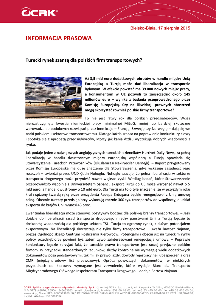 Bielsko-Biała, 17 sierpnia 2015 INFORMACJA PRASOWA Turecki rynek szansą dla polskich firm transportowych? Aż 3,5 mld euro dodatkowych obrotów w handlu między Unią Europejską a Turcją może dać liberalizacja w transporcie lądowym. W efekcie powstać ma 39.000 nowych miejsc pracy, a konsumentom w UE pozwoli to zaoszczędzić około 145 milionów euro – wynika z badania przeprowadzonego przez Komisję Europejską. Czy na likwidacji prawnych obostrzeń mogą skorzystać również polskie firmy transportowe? To nie jest łatwy rok dla polskich przedsiębiorców. Wciąż nierozstrzygnięta kwestia niemieckiej płacy minimalnej MiLoG, mniej lub bardziej skuteczne wprowadzanie podobnych rozwiązań przez inne kraje – Francję, Szwecję czy Norwegię – dają się we znaki polskiemu sektorowi transportowemu. Dlatego każda szansa na poprawienie koniunktury cieszy i spotyka się z aprobatą przedsiębiorców, którzy jak kania dżdżu wyczekują dobrych wiadomości z rynku. Jak podaje jeden z największych anglojęzycznych tureckich dzienników Hurriyet Daily News, za pełną liberalizacją w handlu dwustronnym między europejską wspólnotą a Turcją opowiada się Stowarzyszenie Tureckich Przewoźników (Uluslararası Nakliyeciler Derneği). – Raport przygotowany przez Komisję Europejską ma duże znaczenie dla Stowarzyszenia, gdyż wskazuje zasadność jego roszczeń – twierdzi prezes UND Çetin Nuhoglu. Nuhoglu szacuje, że pełna liberalizacja w sektorze transportu drogowego może przynieść nawet większe zyski. Według badań, które Stowarzyszenie przeprowadziło wspólnie z Uniwersytetem Sabanci, eksport Turcji do UE może wzrosnąć nawet o 5 mld euro, a handel dwustronny o 10 mld euro. Dla Turcji ma to o tyle znaczenie, że w przyszłym roku kraj rządzony twardą ręką przez prezydenta Recepa Erdogana będzie renegocjował z Unią umowę celną. Obecnie tureccy przedsiębiorcy wykonują rocznie 300 tys. transportów do wspólnoty, a udział eksportu do krajów Unii wynosi 43 proc. Ewentualna liberalizacja może stanowić pozytywny bodziec dla polskiej branży transportowej. – Jeśli dojdzie do liberalizacji zasad transportu drogowego między państwami Unii a Turcją będzie to doskonałą wiadomością dla polskiego sektora TSL. Turcja to ogromny rynek, z dużym potencjałem eksportowym. Na liberalizacji skorzystają nie tylko firmy transportowe – uważa Bartosz Najman, prezes Ogólnopolskiego Centrum Rozliczania Kierowców. Potencjalni i obecni już na tureckim rynku polscy przedsiębiorcy powinni być zatem żywo zainteresowani renegocjacją umowy. – Poprawie koniunktury będzie sprzyjać fakt, że tureckie prawo transportowe jest raczej przyjazne polskim firmom. W przypadku standardowych ładunków, służby kontrolne nie wymagają wielu dodatkowych dokumentów poza podstawowymi, takimi jak prawo jazdy, dowody rejestracyjne i ubezpieczenia oraz CMR (międzynarodowy list przewozowy). Oprócz powyższych dokumentów, w niektórych przypadkach od kierowcy wymagane jest zezwolenie, które wydaje Biuro ds. Transportu Międzynarodowego Głównego Inspektoratu Transportu Drogowego – dodaje Bartosz Najman. Według danych Ministerstwa Gospodarki RP, w ubiegłym roku obroty handlowe między Polską a Turcją wyniosły ponad 5,8 mld dolarów. To o 7 proc. więcej w porównaniu z analogicznym okresem 2013 roku. Z Polski wyeksportowano towary za łączną kwotę ponad 3,1 mld dolarów. Dominowały wyroby przemysłu maszynowego, pojazdy samochodowe i części do nich, wyroby elektromaszynowe, miedź i wyroby z miedzi, preparaty perfumeryjne, tworzywa sztuczne i wyroby z kauczuku oraz papier. *** Ogólnopolskie Centrum Rozliczania Kierowców to wiodąca na polskim rynku firma outsourcingowa z doświadczeniem od 2002 roku, zajmująca się rozliczaniem czasu pracy kierowców. Zatrudnia ponad 200 ekspertów i specjalistów m.in. prawa pracy i prawa transportowego Polski i Unii Europejskiej, którzy posiadają wieloletnie doświadczenie w branży transportowej. OCRK, dbając o interesy swoich klientów, na bieżąco obserwuje sytuację prawną i gospodarczą w zakresie logistyki i transportu w Europie, kładąc szczególny nacisk na wysoką jakość i kompleksowość świadczonych usług.