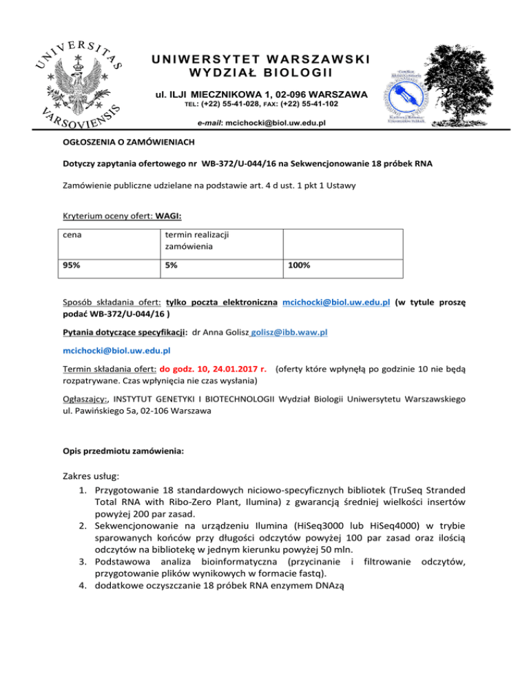 UNIWERSYTET WARSZAWSKI WYDZI AŁ BIOLOGII ul. ILJI MIECZNIKOWA 1, 02-096 WARSZAWA TEL: (+22) 55-41-028, FAX: (+22) 55-41-102 e-mail: [email protected] OGŁOSZENIA O ZAMÓWIENIACH Dotyczy zapytania ofertowego nr WB-372/U-044/16 na Sekwencjonowanie 18 próbek RNA Zamówienie publiczne udzielane na podstawie art. 4 d ust. 1 pkt 1 Ustawy Kryterium oceny ofert: WAGI: cena termin realizacji zamówienia 95% 5% 100% Sposób składania ofert: tylko poczta elektroniczna [email protected] (w tytule proszę podać WB-372/U-044/16 ) Pytania dotyczące specyfikacji: dr Anna Golisz [email protected] [email protected] Termin składania ofert: do godz. 10, 24.01.2017 r. (oferty które wpłynęłą po godzinie 10 nie będą rozpatrywane. Czas wpłynięcia nie czas wysłania) Ogłaszajcy:, INSTYTUT GENETYKI I BIOTECHNOLOGII Wydział Biologii Uniwersytetu Warszawskiego ul. Pawińskiego 5a, 02-106 Warszawa Opis przedmiotu zamówienia: Zakres usług: 1. Przygotowanie 18 standardowych niciowo-specyficznych bibliotek (TruSeq Stranded Total RNA with Ribo-Zero Plant, Ilumina) z gwarancją średniej wielkości insertów powyżej 200 par zasad. 2. Sekwencjonowanie na urządzeniu Ilumina (HiSeq3000 lub HiSeq4000) w trybie sparowanych końców przy długości odczytów powyżej 100 par zasad oraz ilością odczytów na bibliotekę w jednym kierunku powyżej 50 mln. 3. Podstawowa analiza bioinformatyczna (przycinanie i filtrowanie odczytów, przygotowanie plików wynikowych w formacie fastq). 4. dodatkowe oczyszczanie 18 próbek RNA enzymem DNAzą CENA netto/brutto Termin realizacji .................................................................................................. ...................................................................................................