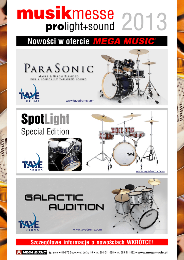 prolight+sound 2013 Nowoœci w ofercie www.tayedrums.com SpotLight Special Edition www.tayedrums.com www.tayedrums.com Szczegó³owe informacje o nowoœciach WKRÓTCE! Sp. z o.o. l 81-876 Sopot l ul. Leœna 15 l tel. 801 011 088 l tel. 585 511 882 l www.megamusic.pl prolight+sound 2013 Nowoœci w ofercie mini3 G2 www.voxamps.com ® TONY IOMMI SIGNATURE TI15-112 EARTH 20TH Instrument powsta³ dla uczczenia 20. rocznicy powstania bestsellerowej serii Earth www.cortguitars.com www.laney.co.uk ® B4 20TH Instrument powsta³ dla uczczenia 20. rocznicy powstania znakomitego modelu „B” z serii Artisan. www.cortguitars.com mini5 RHYTHM www.voxamps.com IRONHEART IRT30-112 IRONHEART - IRT-STUDIO www.laney.co.uk www.laney.co.uk Kompletna nowoœæ w gitarowym œwiecie! To wzmacniacz, który na swoim „pok³adzie” posiada specjalne wejœcie do Re-ampingu, USB oraz wbudowany symulator g³oœnikowy. Szczegó³owe informacje o nowoœciach WKRÓTCE! Sp. z o.o. l 81-876 Sopot l ul. Leœna 15 l tel. 801 011 088 l tel. 585 511 882 l www.megamusic.pl prolight+sound 2013 Nowoœci w ofercie Brock Adamson – za³o¿yciel i w³aœciciel Kanadyjskiego producenta systemów PA konsekwentnie pod¹¿a za swoj¹ maksym¹: „Nauka winna sp³acaæ d³ug wzglêdem wyobraŸni”. Do niedawno zaprezentowanego modelu E15 do³¹cza mniejszy reprezentant projektu Energia – E12. Entuzjastów dotychczasowych subwooferów T21 ucieszy fakt, ¿e firma Adamson wprowadza model E218 dedykowany do wspó³pracy z modu³ami E15 i E12. Nowe produkty bêd¹ gotowe do wysy³ki ju¿ w czerwcu 2013. Ofertê firmy Adamson powiêksza równie¿ zmodyfikowana wersja serii Point – Point Concentric, okreœlana przez producenta jako uniwersalna i pasuj¹ca do http://www.adamsonsystems.com/ wszelkich zastosowañ. http://www.adamsonsystems.com/products/energia/index.php Po udanym starcie serii wzmacniaczy SRA znany z doskona³ej jakoœci korektorów graficznych, amerykañski producent Ashly Audio wprowadza kolejn¹ seriê wzmacniaczy mocy – KLR. Wyposa¿one w zasilacz impulsowy koñcówki charakteryzuj¹ siê najlepszym w swojej klasie parametrem stosunku sygna³/szum. Seria zawiera http://www.ashly.com/ modele pracuj¹ce w klasie AB oraz H. http://www.ashly.com/products/standard-amplifiers.php W³oski producent innowacyjnych rozwi¹zañ w domenie PA firma K-Array wprowadza na rynek zestaw g³oœnikowy KRM33. To super-niski profil i zmienne rozproszenie w dyskretnej obudowie. Jak przysta³o na firmê K-Array wszystko okraszone jest doskona³¹ jakoœci¹. Ciekawostk¹ jest równie¿ produkt o nazwie Anakonda, bêd¹cy niczym innym jak zestawem g³oœników w elastycznej i dyskretnej obudowie o d³ugoœci 2m z mo¿liwoœci¹ ³¹czenia do 16 jednostek razem. „W¹¿” mo¿na uk³adaæ w dowolnych miejscach, nie naruszaj¹c charakteru optycznego. Doskona³e rozwi¹zanie do produkcji http://www.k-array.com/ telewizyjnych, gdzie wymagana jest dyskrecja rozwi¹zania. http://www.k-array.com/en/news/news-archive/861-k-array-at-pl-s.html Szczegó³owe informacje o nowoœciach WKRÓTCE! Sp. z o.o. l 81-876 Sopot l ul. Leœna 15 l tel. 801 011 088 l tel. 585 511 882 l www.pro.megamusic.pl prolight+sound 2013 Nowoœci w ofercie Uczestnicy tegorocznych targów Musik Messe we Frankfurcie nad Menem po raz kolejny, jako pierwsi mogli testowaæ nowoœci KORGA, których w tym roku jest mnóstwo! Zaczynaj¹c od www.korg.com instrumentów, które œwiat³o dzienne ujrza³y na Musik Messe, by³y to m.in: VOLCA seria syntezatorów analogowych z wbudowanym sequencerem KROSS – niesamowity syntezator/workstation, dostêpny w wersjach 61 i 88 klawiszowych Mo¿liwoœci instrumentów KORGA by³y prezentowane podczas pokazów przeprowadzanych przez takie s³awy jak: Jordan Rudness, Tom Coster, Steve McNally i Marco Parisi, który podczas swojej prezentacji wycisn¹³ z PA-600-tki absolutnie wszystko i udowodni³, ¿e jest to niesamowity instrument, o ogromnych mo¿liwoœciach. MS-20 mini LP-380 – pianino zapewniaj¹ce autentyczne brzmienie grand piana i najlepsz¹ klawiaturê KingKORG Wielkim zainteresowaniem cieszy³y siê równie¿ MS-20 mini i KingKORG, instrumenty zaprezentowane wczeœniej podczas NAMM, do których dotarcie i przetestowanie graniczy³o z cudem. W tym roku KORG obchodzi swoje 50-lecie, po targach we Frankfurcie, nie mamy ¿adnych z³udzeñ, ¿e w tym roku, jak i przez kolejne 50 lat KORG nadal bêdzie nas zaskakiwa³ i oczarowywa³ swoimi innowacyjnymi i bezkompromisowymi instrumentami! Szczegó³owe informacje o nowoœciach WKRÓTCE! Sp. z o.o. l 81-876 Sopot l ul. Leœna 15 l tel. 801 011 088 l tel. 585 511 882 l www.korg.megamusic.pl prolight+sound 2013 Nowoœci w ofercie Arturia debiutowa³a na Mussik Messe w tym roku, w wielkim stylu, pokazuj¹c wiele nowoœci, m.in.: SPARK LE – now¹ maszynê perkusyjn¹ o niewielkich rozmiarach i potê¿nych mo¿liwoœciach. www.arturia.com MINI LAB – uniwersalny kontroler, rozmiarów mini Dodatkow¹ wartoœci¹ odwiedzenia stoiska Arturii by³a mo¿liwoœæ konsultacji z projektantami brzmieñ i ludŸmi tworz¹cymi hardware. To w³aœnie oni prezentowali now¹ seriê klawiatur steruj¹cych KEYLAB, pokazanych pierwszy raz na targach we Frankfurcie. KEYLAB dostêpny jest w wersjach 25, 49 i 61 klawiszowych, oferuje wszelkie potrzebne potencjometry, suwaki oraz pady. Sprzêt jest dostarczany z potê¿nym oprogramowaniem Analog Lab, zapewniaj¹c pe³n¹ kontrolê 5000 zapisanych brzmieñ. Idealne narzêdzie do pracy w studiu i na scenie. Szczegó³owe informacje o nowoœciach WKRÓTCE! Sp. z o.o. l 81-876 Sopot l ul. Leœna 15 l tel. 801 011 088 l tel. 585 511 882 l www.megamusic.pl