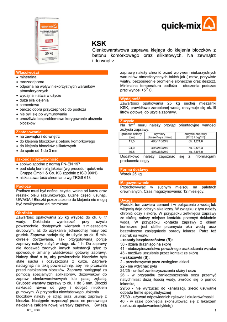 KSK Cienkowarstwowa zaprawa klejąca do klejenia bloczków z betonu komórkowego oraz silikatowych. Na zewnątrz i do wnętrz. Właściwości • mineralna • mrozoodporna • odporna na wpływ niekorzystnych warunków atmosferycznych • wydajna i łatwa w użyciu • duża siła klejenia • cementowa • bardzo dobra przyczepność do podłoża • nie pyli się po wymurowaniu • umożliwia bezproblemowe korygowanie ułożenia bloczków Zastosowanie • na zewnątrz i do wnętrz • do klejenia bloczków z betonu komórkowego • do klejenia bloczków silikatowych • do spoin od 1 do 3 mm Jakość i niezawodność • spoiwo zgodne z normą PN-EN 197 • pod stałą kontrolą jakości (wg procedur quick-mix Gruppe GmbH & Co. KG zgodnie z ISO 9001) • niska zawartość chromianu wg TRGS 613 Podłoże Podłoże musi być nośne, czyste, wolne od kurzu oraz resztek oleju szalunkowego. Luźne części usunąć. UWAGA ! Bloczki przeznaczone do klejenia nie mogą być zawilgocone ani zmrożone. Obróbka Zawartość opakowania 25 kg wsypać do ok. 6 ltr wody. Dokładnie wymieszać przy użyciu powszechnie dostępnych wiertarek z mieszadłem śrubowym, aż do uzyskania jednorodnej masy bez grudek. Zaprawa nadaje się do użycia po ok. 5 min. okresie dojrzewania. Tak przygotowaną porcję zaprawy należy zużyć w ciągu ok. 1 h. Do zaprawy nie dodawać żadnych innych substancji gdyż to spowoduje zmianę właściwości gotowej zaprawy. Należy dbać o to, aby powierzchnia bloczków była stale sucha i oczyszczona z kurzu. Zaprawę naciągnąć na taką powierzchnię, aby nie przeschła przed nałożeniem bloczków. Zaprawę naciągnąć za pomocą specjalnych aplikatorów, dozowników do zapraw cienkowarstwowych lub pacą zębatą. Grubość warstwy zaprawy to ok. 1 do 3 mm. Bloczki nakładać równo od góry i dobijać młotkiem gumowym. W przypadku niewłaściwego ułożenia bloczków należy je zdjąć oraz usunąć zaprawę z bloczka. Następnie rozpocząć prace od ponownego nałożenia całkiem nowej warstwy zaprawy. Świeżą KT_ KSK zaprawę należy chronić przed wpływem niekorzystnych warunków atmosferycznych takich jak ( mróz, porywiste wiatry, bezpośrednie promienie słoneczne oraz deszcz). Minimalna temperatura podłoża i otoczenia podczas prac wynosi +5O C. Wydajność Zawartości opakowania 25 kg suchej mieszanki KSK, prawidłowo zarobionej wodą, otrzymuje się ok.19 litrów gotowej do użycia zaprawy. Zużycie Na 1m2 muru należy przyjąć orientacyjne wartości zużycia zaprawy: grubość ściany [cm] 11,5 wymiary dł/szer/wys [mm] 498/115/249 zużycie zaprawy [l/m²] / [kg/m²] ok. 1,2/1,6 24,0 36,5 498/240/249 498/365/249 ok. 2,5/3,3 ok. 3,8/5,0 Dodatkowo należy producenta cegły zapoznać się z informacjami Forma dostawy Worek 25 kg Magazynowanie Przechowywać w suchym miejscu na paletach drewnianych. Czas magazynowania: 12 miesięcy. Uwaga Produkt ten zawiera cement i w połączeniu z wodą lub wilgocią daje odczyn alkaliczny. W związku z tym należy chronić oczy i skórę. W przypadku zetknięcia zaprawy ze skórą, należy miejsce kontaktu przemyć dokładnie wodą. W przypadku kontaktu zaprawy z okiem konieczne jest obfite przemycie oka wodą oraz bezzwłoczne zasięgnięcie porady lekarza. Patrz też nadruk na worku! - zasady bezpieczeństwa (R): 38 - działa drażniąco na skórę 41 - niebezpieczeństwo poważnego uszkodzenia wzroku 43 - możliwe uczulenie przez kontakt ze skórą - wskazówki (S): 2 - przechowywać poza zasięgiem dzieci 22 - nie wdychać pyłu 24/25 - unikać zanieczyszczenia skóry i oczu 26 - w przypadku zanieczyszczenia oczu przemyć natychmiast dużą ilością wody, zwrócić się o pomoc lekarską 29/56 - nie wyrzucać do kanalizacji. zlecić usuwanie odpadu firmie specjalistycznej 37/39 - używać odpowiednich rękawic i okularów/maski 46 - w razie połknięcia skonsultować się z lekarzem (pokazać opakowanie/etykietę) 1 64 - w razie połknięcia gruntownie przepłukać usta wodą (jeśli poszkodowany jest przytomny) Wskazówka: Opisane wyżej właściwości materiału oparte są na wieloletnim doświadczeniu i badaniach laboratoryjnych. Producent nie ma wpływu na niewłaściwe użycie materiału. W przypadkach powierzchni wątpliwych należy wykonać testy zastosowania i dokładnie sprawdzić jakość próby lub zasięgnąć porady producenta. Producent zastrzega sobie prawo do technicznych zmian produktu. Dane techniczne grupa zaprawy deklaracja zgodności uziarnienie czas obróbki: temperatura obróbki: zużycie wody: wydajność: magazynowanie: opakowanie: M10 wg PN-EN 998-2 05010407 0 – 0,6mm ok. 2 godz. > +5°C ok. 6 ltr na 25 kg ok. 19 ltr z 25kg w suchych pomieszczeniach, 12 miesięcy worek 25 kg Dane techniczne odnoszą się do temperatury 20°C i 65% wilgotności powietrza. Stan: Sierpień 2006 Szersze informacje można uzyskać: quick-mix sp. z o.o. ul. Brzegowa 73 57-100 Strzelin quick-mix Sp. z o.o. ul. Brzegowa 73, 57-100 Strzelin 05 PN-EN 998-2 1488 1488-CPD-0014 Zaprawa murarska do cienkich spoin według projektu, do stosowania wewnątrz i na zewnątrz w elementach budowlanych podlegających wymaganiom konstrukcyjnym Reakcja na ogień: A1 Wytrzymałość na ściskanie: M 10 Początkowa wytrzymałość na 0,3 N/mm² ścinanie: (wartość tab.) Absorpcja wody: NPD Zawartość chlorków: ≤ 0,1 %Cl Współczynnik przepuszczania 5/35 (wartość tab.) pary wodnej µ: Współczynnik przewodzenia ≤ 0,83 W/(mK) dla P=50% ciepła ≤ 0,93 W/(mK) dla P=90% λ10,dry: (wartość tab. PN-EN 1745) Trwałość(odporność na zamrażanie-odmrażanie): Przyjęto na podstawie własnych doświadczeń; do stosowania w środowisku surowym wg PN- EN 998-2 Załącznik B tel. 071/ 392 72 20, 15 fax. 071/ 392 72 23, 24 e-mail: [email protected] www.quick-mix.pl quick-mix sp. z o.o., ul. Brzegowa, 73, 57-100 Strzelin, tel. 071/ 392 72 10, 392 72 23, www.quick-mix.pl, [email protected] doradcy techniczni quick-mix: woj. Lubus