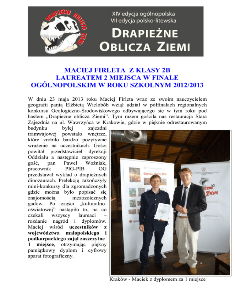 MACIEJ FIRLETA Z KLASY 2B LAUREATEM 2 MIEJSCA W FINALE OGÓLNOPOLSKIM W ROKU SZKOLNYM 2012/2013 W dniu 23 maja 2013 roku Maciej Firleta wraz ze swoim nauczycielem geografii panią Elżbietą Wielobób wziął udział w półfinałach regionalnych konkursu Geologiczno-Środowiskowego odbywającego się w tym roku pod hasłem „Drapieżne oblicza Ziemi”. Tym razem gościła nas restauracja Stara Zajezdnia na ul. Wawrzyńca w Krakowie, gdzie w pięknie odrestaurowanym budynku byłej zajezdni tramwajowej powstało wnętrze, które zrobiło bardzo pozytywne wrażenie na uczestnikach. Gości powitał przedstawiciel dyrekcji Oddziału a następnie zaproszony gość, pan Paweł Woźniak, pracownik PIG-PIB OG przedstawił wykład o drapieżnych dinozaurach. Prelekcję zakończyły mini-konkursy dla zgromadzonych gdzie można było popisać się znajomością mezozoicznych gadów. Po części „kulturalnooświatowej” nastąpiło to, na co czekali wszyscy laureaci – rozdanie nagród i dyplomów. Maciej wśród uczestników z województwa małopolskiego i podkarpackiego zajął zaszczytne 1 miejsce, otrzymując piękny pamiątkowy dyplom i cyfrowy aparat fotograficzny. Kraków - Maciek z dyplomem za 1 miejsce Nagrodą był też wyjazd trzydniowy do Warszawy na finał. Finały, zorganizowane przez Muzeum Geologiczne PIG-PIB, odbyły się 6 czerwca 2013 r. Uczestnikami finałów ogólnopolskich byli laureaci I-szych miejsc z 7 regionów Polski w trzech kategoriach wiekowych. Podczas wycieczki finaliści wraz z opiekunami zwiedzali Warszawę, odwiedzili Centrum Nauki Kopernik oraz ogrody Biblioteki UW. W ostatnim dniu odbył się turniej wiedzy w którym Maciej ostatecznie po zaciętej walce zdobył 2 miejsce w Polsce. Warszawa – finał ogólnopolski – Maciej odbiera dyplom za 2 miejsce.