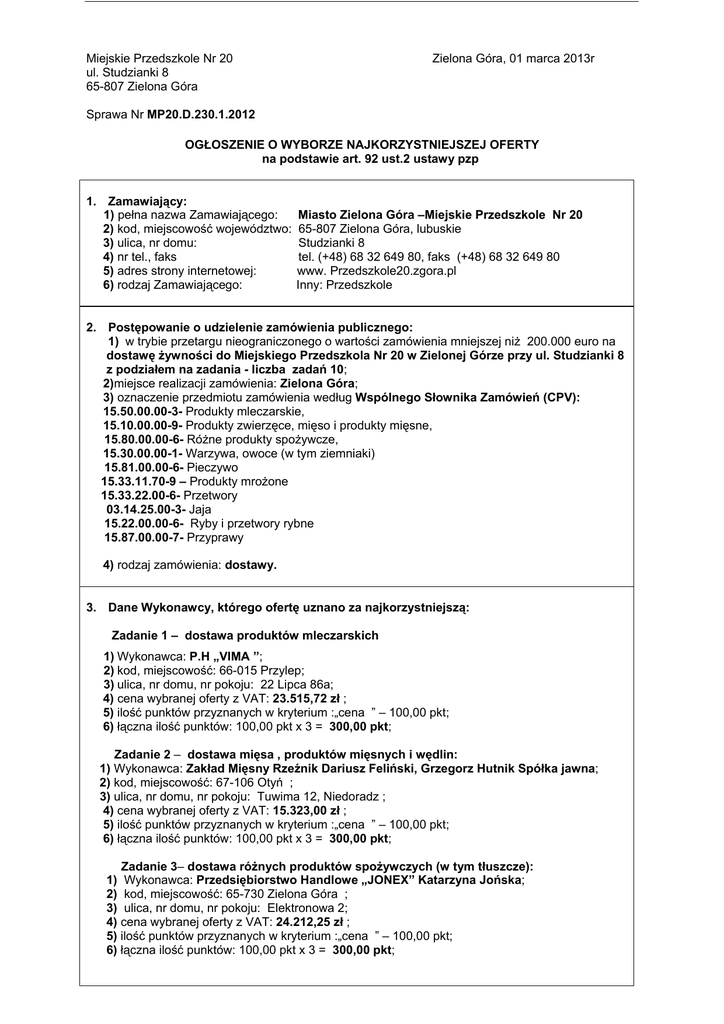 Miejskie Przedszkole Nr 20 ul. Studzianki 8 65-807 Zielona Góra Zielona Góra, 01 marca 2013r Sprawa Nr MP20.D.230.1.2012 OGŁOSZENIE O WYBORZE NAJKORZYSTNIEJSZEJ OFERTY na podstawie art. 92 ust.2 ustawy pzp 1. Zamawiający: 1) pełna nazwa Zamawiającego: 2) kod, miejscowość województwo: 3) ulica, nr domu: 4) nr tel., faks 5) adres strony internetowej: 6) rodzaj Zamawiającego: Miasto Zielona Góra –Miejskie Przedszkole Nr 20 65-807 Zielona Góra, lubuskie Studzianki 8 tel. (+48) 68 32 649 80, faks (+48) 68 32 649 80 www. Przedszkole20.zgora.pl Inny: Przedszkole 2. Postępowanie o udzielenie zamówienia publicznego: 1) w trybie przetargu nieograniczonego o wartości zamówienia mniejszej niż 200.000 euro na dostawę żywności do Miejskiego Przedszkola Nr 20 w Zielonej Górze przy ul. Studzianki 8 z podziałem na zadania - liczba zadań 10; 2)miejsce realizacji zamówienia: Zielona Góra; 3) oznaczenie przedmiotu zamówienia według Wspólnego Słownika Zamówień (CPV): 15.50.00.00-3- Produkty mleczarskie, 15.10.00.00-9- Produkty zwierzęce, mięso i produkty mięsne, 15.80.00.00-6- Różne produkty spożywcze, 15.30.00.00-1- Warzywa, owoce (w tym ziemniaki) 15.81.00.00-6- Pieczywo 15.33.11.70-9 – Produkty mrożone 15.33.22.00-6- Przetwory 03.14.25.00-3- Jaja 15.22.00.00-6- Ryby i przetwory rybne 15.87.00.00-7- Przyprawy 4) rodzaj zamówienia: dostawy. 3. Dane Wykonawcy, którego ofertę uznano za najkorzystniejszą: Zadanie 1 – dostawa produktów mleczarskich 1) Wykonawca: P.H „VIMA ”; 2) kod, miejscowość: 66-015 Przylep; 3) ulica, nr domu, nr pokoju: 22 Lipca 86a; 4) cena wybranej oferty z VAT: 23.515,72 zł ; 5) ilość punktów przyznanych w kryterium :„cena ” – 100,00 pkt; 6) łączna ilość punktów: 100,00 pkt x 3 = 300,00 pkt; Zadanie 2 – dostawa mięsa , produktów mięsnych i wędlin: 1) Wykonawca: Zakład Mięsny Rzeźnik Dariusz Feliński, Grzegorz Hutnik Spółka jawna; 2) kod, miejscowość: 67-106 Otyń ; 3) ulica, nr domu, nr pokoju: Tuwima 12, Niedoradz ; 4) cena wybranej oferty z VAT: 15.323,00 zł ; 5) ilość punktów przyznanych w kryterium :„cena ” – 100,00 pkt; 6) łączna ilość punktów: 100,00 pkt x 3 = 300,00 pkt; Zadanie 3– dostawa różnych produktów spożywczych (w tym tłuszcze): 1) Wykonawca: Przedsiębiorstwo Handlowe „JONEX” Katarzyna Jońska; 2) kod, miejscowość: 65-730 Zielona Góra ; 3) ulica, nr domu, nr pokoju: Elektronowa 2; 4) cena wybranej oferty z VAT: 24.212,25 zł ; 5) ilość punktów przyznanych w kryterium :„cena ” – 100,00 pkt; 6) łączna ilość punktów: 100,00 pkt x 3 = 300,00 pkt; Zadanie 4 – dostawa owoców, warzyw (w tym ziemniaki): 1) Wykonawca: Przedsiębiorstwo Handlowe „JONEX” Katarzyna Jońska; 2) kod, miejscowość: 65-730 Zielona Góra ; 3) ulica, nr domu, nr pokoju: Elektronowa 2; 4) cena wybranej oferty z VAT: 24.456,00 zł; 5) ilość punktów przyznanych w kryterium :„cena ” – 100,00 pkt; 6) łączna ilość punktów: 100,00 pkt x 3 = 300,00 pkt Zadanie 5 – dostawa pieczywa: 1) Wykonawca: Produkcja Pieczywa i Ciastkarstwa, Robert Szepelak; 2) kod, miejscowość: 66-001 Zawada; 3) ulica, nr domu, nr pokoju: Akacjowa 25; 4) cena wybranej oferty z VAT: 5.769,00 zł; 5) ilość punktów przyznanych w kryterium :„cena ” – 100,00 pkt; 6) łączna ilość punktów: 100,00 pkt x 3 = 300,00 pkt Zadanie 6 – dostawa produktów głęboko mrożonych: 1) Wykonawca: Ice QB Spółka z ograniczoną odpowiedzialnością; 2) kod, miejscowość: 65-419 Zielona Góra ; 3) ulica, nr domu, nr pokoju: gen J. Sowińskiego 2/4; 4) cena wybranej oferty z VAT: 10.092,32 zł ; 5) ilość punktów przyznanych w kryterium :„cena ” – 100,00 pkt; 6) łączna ilość punktów: 100,00 pkt x 3 = 300,00 pkt Zadanie 7 – dostawa przetworów: 1) Wykonawca: Przedsiębiorstwo Handlowe „JONEX” Katarzyna Jońska; 2) kod, miejscowość: 65-730 Zielona Góra; 3) ulica, nr domu, nr pokoju: Elektronowa 2; 4) cena wybranej oferty z VAT: 4.110,50 zł ; 5) ilość punktów przyznanych w kryterium :„cena ” – 100,00 pkt; 6) łączna ilość punktów: 100,00 pkt x 3 = 300,00 pkt Zadanie 8 – dostawa jaj świeżych : 1) Wykonawca: Ferma Drobiu- Kinga Firlej-Gąsiorowska ; 2) kod, miejscowość: 67-106 Niedoradz ; 3) ulica, nr domu, nr pokoju: Markiewiczowej 11; 4) cena wybranej oferty z VAT: 3.528,00 zł; 5) ilość punktów przyznanych w kryterium :„cena ” – 100,00 pkt; 6) łączna ilość punktów: 100,00 pkt x 3 = 300,00 pkt Zadanie 9 – dostawa ryb i przetworów rybnych : 1) Wykonawca: PHU Fala Grzegorz Romanowski Hurtownia Zielona Góra; 2) kod, miejscowość: 65-021 Zielona Góra; 3) ulica, nr domu, nr pokoju: Al. Zjednoczenia 102; 4) cena wybranej oferty z VAT: 3.065,00 zł ; 5) ilość punktów przyznanych w kryterium :„cena ” – 100,00 pkt; 6) łączna ilość punktów: 100,00 pkt x 3 = 300,00 pkt Zadanie 10 – dostawa przypraw: 1) Wykonawca: Przedsiębiorstwo Handlowe „JONEX” Katarzyna Jońska; 2) kod, miejscowość: 65-730 Zielona Góra; 3) ulica, nr domu, nr pokoju: Elektronowa 2; 4) cena wybranej oferty z VAT: 1.047,40 zł ; 5) ilość punktów przyznanych w kryterium :„cena ” – 100,00 pkt; 6) łączna ilość punktów: 100,00 pkt x 3 = 300,00 pkt 4. Uzasadnienie wyboru Wykonawcy: dla Zadania 1 Wykonawca spełnia warunki udziału w postępowaniu, a jego oferta jest zgodna z ustawą z dnia 29 stycznia 2004 r. Prawo zamówień publicznych (tekst jednolity Dz. U. z 2010 r. Nr 113, poz. 759 z późn. zm.) i Specyfikacją Istotnych Warunków Zamówienia oraz jest najkorzystniejsza i otrzymała najwyższą liczbę punktów tj.300,00 (100,00 x3). w oparciu o kryterium „cena-100%”. 2 dla Zadania 2 Wykonawca spełnia warunki udziału w postępowaniu, a jego oferta jest zgodna z ustawą z dnia 29 stycznia 2004 r. Prawo zamówień publicznych (tekst jednolity Dz. U. z 2010 r. Nr 113, poz. 759 z późn. zm.) i Specyfikacją Istotnych Warunków Zamówienia ora