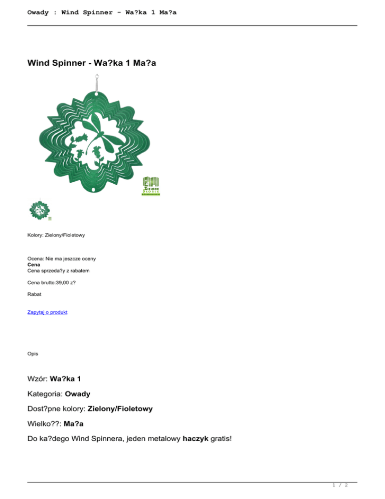 Owady : Wind Spinner - Wa?ka 1 Ma?a Wind Spinner - Wa?ka 1 Ma?a Kolory: Zielony/Fioletowy Ocena: Nie ma jeszcze oceny Cena Cena sprzeda?y z rabatem Cena brutto:39,00 z? Rabat Zapytaj o produkt Opis Wzór: Wa?ka 1 Kategoria: Owady Dost?pne kolory: Zielony/Fioletowy Wielko??: Ma?a Do ka?dego Wind Spinnera, jeden metalowy haczyk gratis! 1 / 2 Owady : Wind Spinner - Wa?ka 1 Ma?a Wind Spinnery czyli ozdoby ze stali nierdzewnej, które poruszaj?c si? na wietrze lub przy pomocy silniczka, tworz? pi?kn? iluzj? trójwymiarowo?ci. Je?eli chcesz dowiedzie? si? wi?cej na ich temat, kliknij tutaj. Opinie Nikt jeszcze nie recenzowa? tego produktu. 2 / 2 Powered by TCPDF (www.tcpdf.org)
