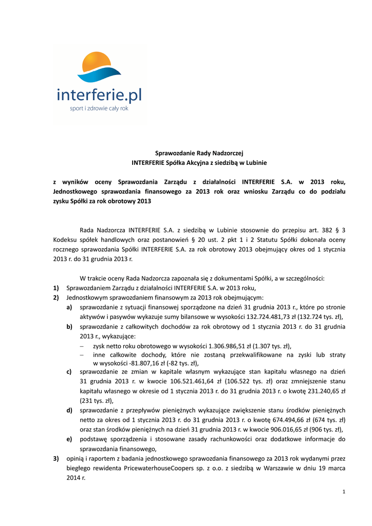 Sprawozdanie Rady Nadzorczej INTERFERIE Spółka Akcyjna z siedzibą w Lubinie z wyników oceny Sprawozdania Zarządu z działalności INTERFERIE S.A. w 2013 roku, Jednostkowego sprawozdania finansowego za 2013 rok oraz wniosku Zarządu co do podziału zysku Spółki za rok obrotowy 2013 Rada Nadzorcza INTERFERIE S.A. z siedzibą w Lubinie stosownie do przepisu art. 382 § 3 Kodeksu spółek handlowych oraz postanowień § 20 ust. 2 pkt 1 i 2 Statutu Spółki dokonała oceny rocznego sprawozdania Spółki INTERFERIE S.A. za rok obrotowy 2013 obejmujący okres od 1 stycznia 2013 r. do 31 grudnia 2013 r. 1) 2) 3) W trakcie oceny Rada Nadzorcza zapoznała się z dokumentami Spółki, a w szczególności: Sprawozdaniem Zarządu z działalności INTERFERIE S.A. w 2013 roku, Jednostkowym sprawozdaniem finansowym za 2013 rok obejmującym: a) sprawozdanie z sytuacji finansowej sporządzone na dzień 31 grudnia 2013 r., które po stronie aktywów i pasywów wykazuje sumy bilansowe w wysokości 132.724.481,73 zł (132.724 tys. zł), b) sprawozdanie z całkowitych dochodów za rok obrotowy od 1 stycznia 2013 r. do 31 grudnia 2013 r., wykazujące: − zysk netto roku obrotowego w wysokości 1.306.986,51 zł (1.307 tys. zł), − inne całkowite dochody, które nie zostaną przekwalifikowane na zyski lub straty w wysokości -81.807,16 zł (-82 tys. zł), c) sprawozdanie ze zmian w kapitale własnym wykazujące stan kapitału własnego na dzień 31 grudnia 2013 r. w kwocie 106.521.461,64 zł (106.522 tys. zł) oraz zmniejszenie stanu kapitału własnego w okresie od 1 stycznia 2013 r. do 31 grudnia 2013 r. o kwotę 231.240,65 zł (231 tys. zł), d) sprawozdanie z przepływów pieniężnych wykazujące zwiększenie stanu środków pieniężnych netto za okres od 1 stycznia 2013 r. do 31 grudnia 2013 r. o kwotę 674.494,66 zł (674 tys. zł) oraz stan środków pieniężnych na dzień 31 grudnia 2013 r. w kwocie 906.016,65 zł (906 tys. zł), e) podstawę sporządzenia i stosowane zasady rachunkowości oraz dodatkowe informacje do sprawozdania finansowego, opinią i raportem z badania jednostkowego sprawozdania finansowego za 2013 rok wydanymi przez biegłego rewidenta PricewaterhouseCoopers sp. z o.o. z siedzibą w Warszawie w dniu 19 marca 2014 r. 1 W wyniku dokonanej oceny Rada Nadzorcza uznaje, że wyżej wymienione sprawozdania zostały sporządzone: − zgodnie ze stanem faktycznym, odzwierciedlają prawidłowo i rzetelnie wyniki działalności gospodarczej za rok 2013 oraz sytuację finansową i majątkową Spółki na dzień 31 grudnia 2013 r., − prawidłowo, zgodnie z wpływającymi na formę i treść sprawozdania finansowego przepisami prawa regulującymi przygotowanie sprawozdań finansowych, w tym również zgodnie z Międzynarodowymi Standardami Sprawozdawczości Finansowej zatwierdzonymi przez UE. 1) 2) 3) Mając na uwadze powyższe, Rada Nadzorcza INTERFERIE S.A. z siedzibą w Lubinie postanowiła: pozytywnie ocenić i rekomendować Zwyczajnemu Walnemu Zgromadzeniu INTERFERIE S.A. do zatwierdzenia Sprawozdanie Zarządu z działalności INTERFERIE S.A. w 2013 roku i Jednostkowe sprawozdanie finansowe za 2013 rok, pozytywnie zaopiniować wniosek Zarządu Spółki w przedmiocie podziału zysku netto INTERFERIE S.A. za rok obrotowy 2013 w wysokości 1.306.986,51 zł (słownie: jeden milion trzysta sześć tysięcy dziewięćset osiemdziesiąt sześć złotych i pięćdziesiąt jeden groszy) w następujący sposób: − kwota 104.558,92 zł (słownie: sto cztery tysiące pięćset pięćdziesiąt osiem złotych i dziewięćdziesiąt dwa grosze) na kapitał zapasowy tworzony zgodnie z przepisem art. 396 § 1 Kodeksu spółek handlowych i postanowieniem § 32 ust. 2 Statutu Spółki, − kwota 1.202.427,59 zł (słownie: jeden milion dwieście dwa tysiące czterysta dwadzieścia siedem złotych i pięćdziesiąt dziewięć groszy) na pozostały kapitał zapasowy. wnioskować do Zwyczajnego Walnego Zgromadzenia, na podstawie § 20 ust. 2 pkt 4 Statutu Spółki, o udzielenie absolutorium członkom Zarządu z wykonania obowiązków w roku obrotowym 2013. Propozycja przeznaczenia pozostałej części zysku netto za rok 2013 w kwocie 1.202.427,59 zł na pozostały kapitał zapasowy podyktowana jest koniecznością zabezpieczenia środków finansowych na realizację planowanych przez Spółkę zadań inwestycyjnych w latach 2014-2015. Rada Nadzorcza INTERFERIE S.A. z siedzibą w Lubinie Legnica, dnia 21 marca 2014 r. 2