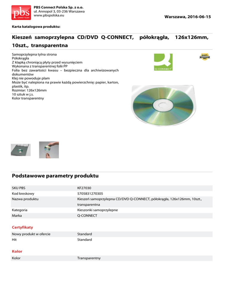 PBS Connect Polska Sp. z o.o. ul. Annopol 3, 03-236 Warszawa www.pbspolska.eu Warszawa, 2016-06-15 Karta katalogowa produktu: Kieszeń samoprzylepna CD/DVD Q-CONNECT, półokrągła, 126x126mm, 10szt., transparentna Samoprzylepna tylna strona Półokrągła Z klapką chroniącą płyty przed wysunięciem Wykonana z transparentnej folii PP Folia bez zawartości kwasu – bezpieczna dla archiwizowanych dokumentów Klej nie powoduje plam Może być nalepiona na prawie każdą powierzchnię: papier, karton, plastik, itp. Rozmiar: 126x126mm 10 sztuk w j.s. Kolor transparentny Podstawowe parametry produktu SKU PBS KF27030 Kod kreskowy 5705831270305 Nazwa produktu Kieszeń samoprzylepna CD/DVD Q-CONNECT, półokrągła, 126x126mm, 10szt., transparentna Kategoria Kieszonki samoprzylepne Marka Q-CONNECT Certyfikaty Nowy produkt w ofercie Standard Hit Standard Kolor Kolor Transparentny PBS Connect Polska Sp. z o.o. ul. Annopol 3, 03-236 Warszawa www.pbspolska.eu Warszawa, 2016-06-15 Karta katalogowa produktu cd. Kieszeń samoprzylepna CD/DVD Q-CONNECT, półokrągła, 126x126mm, 10szt., transparentna Podstawowe parametry produktu Cecha Produkt Kieszeń Typ Półokrągła Rodzaj CD/DVD Materiał Pp W ofercie od 2014-02 Zamiennik Zamiennik P14109 Wspólny słownik zamówień CPV 30199410-7 Papier samoprzylepny Jednostki logistyczne Opakowanie 1 10 szt Opakowanie 2 120 szt
