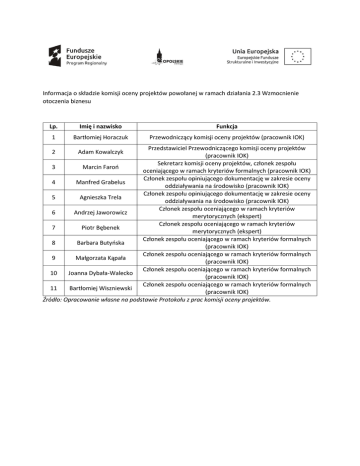 Informacja o składzie komisji oceny projektów powołanej w ramach działania 2.3 Wzmocnienie otoczenia biznesu Lp. Imię i nazwisko Funkcja 1 Bartłomiej Horaczuk Przewodniczący komisji oceny projektów (pracownik IOK) Przedstawiciel Przewodniczącego komisji oceny projektów (pracownik IOK) Sekretarz komisji oceny projektów, członek zespołu 3 Marcin Faroń oceniającego w ramach kryteriów formalnych (pracownik IOK) Członek zespołu opiniującego dokumentację w zakresie oceny 4 Manfred Grabelus oddziaływania na środowisko (pracownik IOK) Członek zespołu opiniującego dokumentację w zakresie oceny 5 Agnieszka Trela oddziaływania na środowisko (pracownik IOK) Członek zespołu oceniającego w ramach kryteriów 6 Andrzej Jaworowicz merytorycznych (ekspert) Członek zespołu oceniającego w ramach kryteriów 7 Piotr Bębenek merytorycznych (ekspert) Członek zespołu oceniającego w ramach kryteriów formalnych 8 Barbara Butyńska (pracownik IOK) Członek zespołu oceniającego w ramach kryteriów formalnych 9 Małgorzata Kąpała (pracownik IOK) Członek zespołu oceniającego w ramach kryteriów formalnych 10 Joanna Dybała-Walecko (pracownik IOK) Członek zespołu oceniającego w ramach kryteriów formalnych 11 Bartłomiej Wiszniewski (pracownik IOK) Źródło: Opracowanie własne na podstawie Protokołu z prac komisji oceny projektów. 2 Adam Kowalczyk