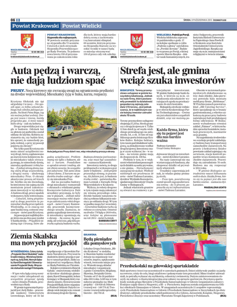 06 B ŚRODA, 9 PAŹDZIERNIKA 2013 Powiat Krakowski Powiat Wielicki WASZA REDAKCJA Telefon 12–61–99–243 e–mail [email protected] POWIAT KRAKOWSKI. Stypendia dla najlepszych. W powiecie zostały przyznane stypendia dla 73 uczniów. Czterech z nich otrzymało Stypendia Przewodniczącego Rady Powiatu. To jednorazowa kwota 350 zł przyznawana po zakończeniu roku dla tych, którzy mają bardzo dobrą ocenę z zachowania i są laureatami olimpiad. 69 uczniów, którym przyznano Stypendia Starosty za wysokie wyniki w nauce będą co miesiąc otrzymywać 150 zł przez cały rok szkolny. (BCA) WASZA REDAKCJA Telefon 12–61–99–248 e–mail [email protected] WIELICZKA. PodróżpoPersji. Wielicka biblioteka zaprasza 16 października o godz. 17 na kolejne spotkanie z cyklu „Podróże z głową” zatytułowane „Perskie dywany”. Będzie to wyprawa po Persji, o której opowie Marcin Rzepka – doktor nauk humanistycznych, ira- nista i bułgarysta, pracownik Instytutu Historii Uniwersytetu Papieskiego Jana Pawła II w Krakowie oraz Instytutu Orientalistyki Uniwersytetu Jagiellońskiego. Rzepka zajmuje się m.in. mniejszościami religijnymi w świecie islamu. (JOL) Strefa jest, ale gmina wciąż szuka inwestorów PRUSY. Nocą kierowcy nie zwracają uwagi na ograniczenia prędkości na drodze wojewódzkiej. Mieszkańcy żyją w huku, kurzu, rozpaczy. BISKUPICE. Tereny przemysłowo-usługowe w gminie kuszą dobrą lokalizacją. Jednak na razie firmy, które postanowiły prowadzić tu działalność gospodarczą zajmują zaledwie 1/15 terenu. Jest jednak szansa, że w najbliższym czasie kolejny inwestor zatrudni około 70 osób. Auta jadą przez Prusy dzień i noc, więc mieszkańcy proszą o ekrany godzą uciążliwości. Problem mamy nie tylko z hałasem, ale też z kurzem. Posadziłam w ogrodzie aronie i maliny, ale nie zbiorę owoców, bo wszystko jest zakurzone. Tak samo okna i drzwi domu. Z kurzem na podwórku trudno walczyć – skarży się mieszkanka Prus. Już na początku budowy drogi mieszkańcy rozmawiali o ekranach z władzami gminy Kocmyrzów-Luborzyca Dziś urzędnicy przyznają, że były one w planach. – Jednak takie inwestycje można robić dopiero po zakończeniu robót drogowych – mówi Cezary Kaniowski, pracownik kocmyrzowskiego urzędu. Zaznacza, że gmina sygnalizuje inwestorom, iż mieszkańcy upominają się o ekrany. – Są szanse, by powstały, ale wówczas, gdy taką potrzebę wykażą badania ruchu. Ziemia Skalska ma nowych przyjaciół WYRÓŻNIENIA. Czterytytuły „PrzyjacielZiemiSkalskiej”nadaliradnimiejscy.WśródwyróżnionychsąJurijZinki,HenrykGębala,KarolDomagalskiiStowarzyszeniePrzyjaciółSkały.Wręczeniestatueteknastąpi11listopada. – W tym roku były cztery nominacje i radni zdecydowali się wszystkim przyznać tytuły – mówi Jolanta Penkala, przewodnicząca Rady. Wgronietegorocznychprzyjaciół jest Jurij Zinko – pracownik naukowy Uniwersytetu Lwowskiego, który od 16 lat współpracuje z Ojcowskim Parkiem Narodowym. Przywozi tu studentów,którzypracująwparku w ramach praktyk. Zinko zainicjował też współpracę Skały ze Skałą Podolską na Ukrainie. KolejniwyróżnienitoHenryk Gębala–emerytowany,wieloletni dyrektor skalskiego gimnazjum; Karol Domagalski, kolarz trenującywHiszpanii,któryrozsławia miasto; Stowarzyszenie PrzyjaciółSkały,któreorganizuje Festiwal Orkiestr Dętych i realizujewieleinicjatyw.in.remont drewnianej drogi do Ojcowa. (BCA) Budowa ekranów jest kosztowna, więc musi być uzasadniona – zaznacza Kaniowski. Inwestorzy mówią, że droga po kłopotach z wykonawcą jest znów w budowie. – Jeśli projekt przewiduje ekrany, to powstaną. Ale faktem jest, że badania trzeba zrobić – potwierdza Roman Leśniak z Zarządu Dróg Wojewódzkich w Krakowie. Wylicza, że roboty drogowe w tym rejonie mają zakończyć się wiosną przyszłego roku. Zwykle badanie natężenia ruchu są robione kilkanaście miesięcy po oddaniu drogi. W tym wypadku mogą być wcześniej. – Generalnie badania ruchu są robione co cztery lata. Ostatnie na drodze 776 były w 2010 roku, więc kolejne są planowane na rok 2014 – mówi Leśniak. BARBARA CIRYT Tereny przemysłowo-usługowe obejmują 57,24 ha. Strefa graniczy z drogą krajową nr 4. Tylko 12 km dzieli ją od węzła wielickiego prowadzącego na autostradę A4, a ok. 35 km od najbliższego portu lotniczego Kraków-Balice. Kolejne hektary, tym razem pod działalność usługową, są zlokalizowane wzdłuż drogi krajowej. Inwestorzy mają w czym wybierać, bo – w sumie – na terenie gminy mają do dyspozycji ok. 100 ha. Problem w tym, że w większościwłaścicielamiposzczególnychdziałeksąosobyprywatne, a nie gmina. – Nieruchomości zazwyczaj nie są duże. Wielkość niektórych nie przekracza 50 arów – mówi Tadeusz Luraniec, dyrektorWydziałuRozwojuGospodarczegoiInwestycji Urzędu Gminy w Biskupicach. Jednak właściciele gruntów są otwarci na rozmowy z po- tencjalnymi inwestorami. W gminie funkcjonuje bank danych, w którym są m.in. oświadczenia mieszkańców wyrażających zgodę na przekazywanie do nich kontaktu. Biskupicka strefa nie widnieje w ofercie Krakowskiego Parku Technologicznego. – Gmina nie jest właścicielem wszystkich działek, więc nie możemy po- Każda firma, która się tu pojawi jest dla nas bardzo ważna Tadeusz Luraniec Urząd Gminy Biskupice dejmować decyzji za mieszkańców – mówi dyrektor Luraniec. Na razie samorząd nie ma wystarczających funduszy, aby skupować działki od prywatnych właścicieli. Urzędnicy zapewniają jednak, że władze gminy promują strefę. – Poza tym, powiększony został sposób zagospodarowania terenu – do 75 procent, poprawiła się też infrastruktura – mówi Tadeusz Luraniec. Obecnie w na terenach przemysłowych zlokalizowane są trzy duże obiekty. Jako pierwsza powstała hala montażu mebli przy firmie „Meblomax”. W Przebieczanach powstał zakład „JiR Catering 