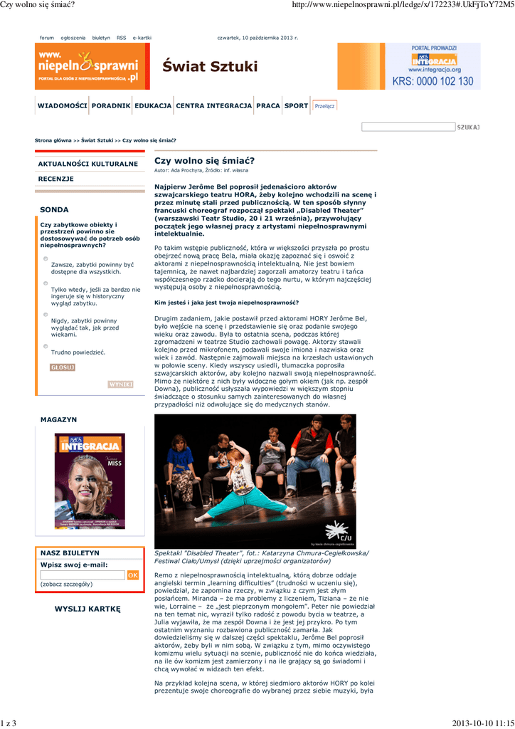 Czy wolno się śmiać? 1z3 forum http://www.niepelnosprawni.pl/ledge/x/172233#.UkFjToY72M5 ogłoszenia biuletyn RSS e-kartki czwartek, 10 października 2013 r. Świat Sztuki WIADOMOŚCI PORADNIK EDUKACJA CENTRA INTEGRACJA PRACA SPORT Strona główna >> Przełącz Świat Sztuki >> Czy wolno się śmiać? Share AKTUALNOŚCI KULTURALNE Czy wolno się śmiać? Autor: Ada Prochyra, Źródło: inf. własna RECENZJE SONDA Czy zabytkowe obiekty i przestrzeń powinno sie dostosowywać do potrzeb osób niepełnosprawnych? Zawsze, zabytki powinny być dostępne dla wszystkich. Tylko wtedy, jeśli za bardzo nie ingeruje się w historyczny wygląd zabytku. Nigdy, zabytki powinny wyglądać tak, jak przed wiekami. Trudno powiedzieć. Najpierw Jerôme Bel poprosił jedenaścioro aktorów szwajcarskiego teatru HORA, żeby kolejno wchodzili na scenę i przez minutę stali przed publicznością. W ten sposób słynny francuski choreograf rozpoczął spektakl „Disabled Theater” (warszawski Teatr Studio, 20 i 21 września), przywołujący początek jego własnej pracy z artystami niepełnosprawnymi intelektualnie. Po takim wstępie publiczność, która w większości przyszła po prostu obejrzeć nową pracę Bela, miała okazję zapoznać się i oswoić z aktorami z niepełnosprawnością intelektualną. Nie jest bowiem tajemnicą, że nawet najbardziej zagorzali amatorzy teatru i tańca współczesnego rzadko docierają do tego nurtu, w którym najczęściej występują osoby z niepełnosprawnością. Kim jesteś i jaka jest twoja niepełnosprawność? Drugim zadaniem, jakie postawił przed aktorami HORY Jerôme Bel, było wejście na scenę i przedstawienie się oraz podanie swojego wieku oraz zawodu. Była to ostatnia scena, podczas której zgromadzeni w teatrze Studio zachowali powagę. Aktorzy stawali kolejno przed mikrofonem, podawali swoje imiona i nazwiska oraz wiek i zawód. Następnie zajmowali miejsca na krzesłach ustawionych w połowie sceny. Kiedy wszyscy usiedli, tłumaczka poprosiła szwajcarskich aktorów, aby kolejno nazwali swoją niepełnosprawność. Mimo że niektóre z nich były widoczne gołym okiem (jak np. zespół Downa), publiczność usłyszała wypowiedzi w większym stopniu świadczące o stosunku samych zainteresowanych do własnej przypadłości niż odwołujące się do medycznych stanów. MAGAZYN NASZ BIULETYN Wpisz swoj e-mail: (zobacz szczegóły) WYSLIJ KARTKĘ Spektakl "Disabled Theater", fot.: Katarzyna Chmura-Cegiełkowska/ Festiwal Ciało/Umysł (dzięki uprzejmości organizatorów) Remo z niepełnosprawnością intelektualną, którą dobrze oddaje angielski termin „learning difficulties” (trudności w uczeniu się), powiedział, że zapomina rzeczy, w związku z czym jest złym posłańcem. Miranda – że ma problemy z liczeniem, Tiziana – że nie wie, Lorraine – że „jest pieprzonym mongołem”. Peter nie powiedział na ten temat nic, wyraził tylko radość z powodu bycia w teatrze, a Julia wyjawiła, że ma zespół Downa i że jest jej przykro. Po tym ostatnim wyznaniu rozbawiona publiczność zamarła. Jak dowiedzieliśmy się w dalszej części spektaklu, Jerôme Bel poprosił aktorów, żeby byli w nim sobą. W związku z tym, mimo oczywistego komizmu wielu sytuacji na scenie, publiczność nie do końca wiedziała, na ile ów komizm jest zamierzony i na ile grający są go świadomi i chcą wywołać w widzach ten efekt. Na przykład kolejna scena, w której siedmioro aktorów HORY po kolei prezentuje swoje choreografie do wybranej przez siebie muzyki, była 2013-10-10 11:15 Czy wolno się śmiać? 2z3 http://www.niepelnosprawni.pl/ledge/x/172233#.UkFjToY72M5 przezabawna. Publiczność reagowała na nią bardzo żywo, sowicie nagradzając brawami każde wykonanie i akrobację, np. szpagat wykonywany przez Julię w świetnej interpretacji „They don’t care about us” Michaela Jacksona. Jednak już występ Petera do szwajcarskiej piosenki o gwieździe wzbudzał wątpliwości natury moralnej. Z jego poprzednich wypowiedzi („teraz teatr, jest dobrze, teatr”) można było wnioskować, że ma głęboką niepełnosprawność intelektualną. Publiczność śmiała się, ale po przedstawieniu w kuluarach zastanawiano się, czy Peter był świadomy komizmu swojego tańca i czy w związku z tym należało się śmiać. Powiedz, co sądzisz o tej sztuce Jeden z aktorów – Matthias – w kolejnej scenie powiedział, że jego siostra popłakała się po obejrzeniu tego spektaklu. Powód? Aktorzy, przynajmniej teoretycznie, nie grają w nim żadnych postaci, tylko są sobą. Według siostry Matthiasa, w „Disabled Theater” są pokazani jak zwierzęta w cyrku, dziwadła. Samym zainteresowanym niespecjalnie przeszkadzała taka struktura przedstawienia. Podczas pospektaklowego spotkania z publicznością mówili, że grali ten spektakl bardzo wiele razy i że wciąż sprawia im to przyjemność. Aktorzy podczas spektaklu "Disabled Theater", fot.: Katarzyna Chmura-Cegiełkowska/ Festiwal Ciało/Umysł (dzięki uprzejmości organizatorów) Wygląda na to, że widzowie, którzy przyszli „na Bela”, otrzymali znacznie więcej, niż się spodziewali. Hasło przewodnie całego festiwalu Ciało/Umysł, podczas którego zaprezentowano „Disabled Theater”, brzmi: „Tak, lubię patrzeć”. Bel, pokazując nam grupę aktorów z niepełnosprawnością, oddaje im głos, ale też zadaje pytanie o prawo do patrzenia. Ten spektakl bardzo wyraźnie przenosi punkt ciężkości z przekazu scenicznego na reakcję odbiorcy. Aktorzy HORY grają w teatrze po kilka, kilkanaście lat. Nawet jeżeli jest to pierwszy spektakl, w którym występują tak otwarcie jako osoby z niepełnosprawnością, są ze sceną i widzami obyci. Natomiast widzowie obuwieczorów, podczas których „Disabled…” był pokazywany w Warszawie, w zdecydowanej większości nie są obyci z aktorami z niepełnosprawnością i faktycznie zostali przez choreografa i teatr HORA sprowoko