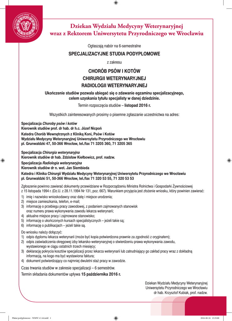 Dziekan Wydziału Medycyny Weterynaryjnej wraz z Rektorem Uniwersytetu Przyrodniczego we Wrocławiu Ogłaszają nabór na 6-semestralne SPECJALIZACYJNE STUDIA PODYPLOMOWE z zakresu CHORÓB PSÓW I KOTÓW CHIRURGII WETERYNARYJNEJ RADIOLOGII WETERYNARYJNEJ Ukończenie studiów pozwala ubiegać się o zdawanie egzaminu specjalizacyjnego, celem uzyskania tytułu specjalisty w danej dziedzinie. Termin rozpoczęcia studiów – listopad 2016 r. Wszystkich zainteresowanych prosimy o pisemne zgłaszanie uczestnictwa na adres: Specjalizacja Choroby psów i kotów Kierownik studiów prof. dr hab. dr h.c. Józef Nicpoń Katedra Chorób Wewnętrznych z Kliniką Koni, Psów i Kotów Wydziału Medycyny Weterynaryjnej Uniwersytetu Przyrodniczego we Wrocławiu pl. Grunwaldzki 47, 50-366 Wrocław, tel./fax 71 3205 360, 71 3205 365 Specjalizacja Chirurgia weterynaryjna Kierownik studiów dr hab. Zdzisław Kiełbowicz, prof. nadzw. Specjalizacja Radiologia weterynaryjna Kierownik studiów dr n. wet. Jan Siembieda Katedra i Klinika Chirurgii Wydziału Medycyny Weterynaryjnej Uniwersytetu Przyrodniczego we Wrocławiu pl. Grunwaldzki 51, 50-366 Wrocław, tel./fax 71 320 53 55, 71 320 53 53 Zgłoszenie powinno zawierać dokumenty przewidziane w Rozporządzeniu Ministra Rolnictwa i Gospodarki Żywnościowej z 15 listopada 1994 r. (Dz.U. z 28.11.1994 Nr 131, poz. 667). Warunkiem przyjęcia jest złożenie wniosku, który powinien zawierać: 1) imię i nazwisko wnioskodawcy oraz datę i miejsce urodzenia; 2) miejsce zamieszkania, telefon, e-mail; 3) informację o przebiegu pracy zawodowej, z podaniem zajmowanych stanowisk oraz numeru prawa wykonywania zawodu lekarza weterynarii; 4) aktualne miejsce pracy i zajmowane stanowisko; 5) informację o ukończonych kursach specjalistycznych – jeżeli takie są; 6) informację o publikacjach – jeżeli takie są. Do wniosku należy dołączyć: 1) odpis dyplomu lekarza weterynarii (może być kopia potwierdzona prawnie za zgodność z oryginałem); 2) odpis zaświadczenia okręgowej izby lekarsko-weterynaryjnej o stwierdzeniu prawa wykonywania zawodu, wystawionego w ciągu ostatnich trzech miesięcy; 3) deklarację pokrycia kosztów specjalizacji przez lekarza weterynarii lub zatrudniający go zakład pracy wraz z dokładną informacją, na kogo ma być wystawiona faktura; 4) dokument potwierdzający co najmniej dwuletni staż pracy w zawodzie. Czas trwania studiów w zakresie specjalizacji – 6 semestrów. Termin składania dokumentów upływa 15 października 2016 r. Dziekan Wydziału Medycyny Weterynaryjnej Uniwersytetu Przyrodniczego we Wrocławiu dr hab. Krzysztof Kubiak, prof. nadzw. Plakat podyplomowe - WMW v1 A4.indd 1 2016-08-24 13:33:00