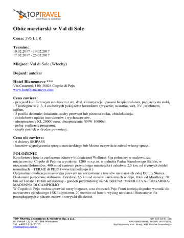 Obóz narciarski w Val di Sole Cena: 595 EUR Terminy: 10.02.2017 - 19.02.2017 17.02.2017 - 26.02.2017 Miejsce: Val di Sole (Włochy) Dojazd: autokar Hotel Biancaneve *** Via Casarotti, 110; 38024 Cogolo di Pejo www.hotelbiancaneve.com Cena zawiera: - przejazd komfortowym autokarem z wc, dvd, klimatyzacją i pasami bezpieczeństwa, przejazdy na stoki, - 7 noclegów w 2 ,3, 4 osobowych pokojach z łazienkami (prysznic, suszarka, wc), TV , telefonem, sejfem, - 3 posiłki dziennie: śniadanie, suchy prowiant lub pizza na stoku, obiadokolacja. - całodobowa opiekę instruktorów i wychowawców, - ubezpieczenie KL 20000 euro, ubezpieczenie NNW 10000zł, - pełną realizację programu, - ciepły posiłek w drodze powrotnej. Cena nie zawiera: - 6 dniowy SKIPASS - kosztów wypożyczenia sprzętu narciarskiego lub Można oczywiście zabrać własny sprzęt. POŁOŻENIE Komfortowy hotel z zapleczem odnowy biologicznej Wellness-Spa położony w malowniczej miejscowości Cogolo di Pejo na wysokości 1200 m n.p.m. u podnóża Parku Narodowego Stelvio, w otoczeniu Dolomitów, 400 m od centrum przytulnego miasteczka i zaledwie 2,5 km. od słynnych źródeł termalnych – TERME di PEJO (www.termedipejo.it ) Optymalna lokalizacja miasteczka pozwala na korzystanie z terenów narciarskich całej Doliny Słońca. Doskonałe połączenie skibusem. Zaledwie 2,5 km od stoków narciarskich w Pejo, 8 km od Marillevy, 20 km od Tonale i 10 km od Daolasy - gondoli przerzutowej na SKIARENA: MARILLEVA-FOLGARIDAMADONNA DI CAMPIGLIO W Cogolo di Pejo można uprawiać narty biegowe, a na zboczach Pejo Fonti istnieją dogodne warunki do narciarstwa zjazdowego i SKI-alpinizmu. 20 metrów od hotelu wyciag narciarski Biancaneve dla początkujących z placem zabaw i rozrywki dla dzieci. _________________________________________________________________________________________ TOP TRAVEL Incentives & Holidays Sp. z o.o. NIP 525-23-81-116 Ul. Foksal 12/14, 00-366 Warszawa KRS 0000268026, REGON 140775570, Tel. +4822 616 23 25 Sąd Rejonowy M.st. W-wy, XIII Wydział Gospodarczy [email protected] PEJO FONTI Miejscowość zawieszona między górami a niebem na wys.1400 m wraz z otaczającymi ja szczytami tworzy wręcz bajkową scenerię. Trasy narciarskie jakie oferuje Pejo to głównie długie i widokowe zjazdy, świetne dla początkujących i średnio zaawansowanych narciarzy, ale i zaawansowani nie będą się tu nudzili. Nowością z 2011 jest kolej górska z Pejo Tarlenta na Ortles Cevedale ( ponad 3000m n.p.m.) z którego rozpoczyna się 8 km nartostrada obfitująca we wspaniałe widoki. Pejo jest wprost idealne na rodzinne uprawianie narciarstwa. Stoki w Pejo ze swoim malowniczym położeniem i chillout'ową atmosferą stanowią ciekawą alternatywę dla wielkich centrów narciarskich. Całkowita długość tras może nie imponuje (20km), ale możliwość wjazdu na 3000 m szklaną gondolką zabierającą do nawet 100 os. zapewni niesamowite wrażenia. Z tej wysokości prowadzi jedna z najciekawszych tras w całych Dolomitach o długości 8km i przewyższeniu 1600m. SERWIS HOTELOWY Recepcja, holl, restauracja, bar, sala kominkowa, winda, sala TV, centrum Wellness-Spa. Do dyspozycji depozyt sprzętu narciarskiego z grzałkami na buty, Wi-Fi w całym hotelu gratis. POKOJE 23 pokoje 2 ,3, 4 osobowe urządzone w tradycyjnym góralskim stylu z pełnym węzłem sanitarnym (łazienka z prysznicem i suszarka), TV Sat, telefonem, sejfem, większość pokoi z balkonami WYŻYWIENIE - śniadanie w formie urozmaiconego bufetu (wędliny, jajka, sery, płatki, jogurt, ciasta, napoje ciepłe, soki) - Obiadokolacje serwowane do stolika ( 2 menu do wyboru) , bufet sałatkowy, deser, woda Pejo w karafce. Uwaga: Wszystkie inne napoje do obiadokolacji dodatkowo płatne !!! REKREACJA Centrum WELLNESS - SPA w cenie hotelu 3 wejścia (sauna fińska , łaźnia turecka, bio sauna, sala relaksu, herbatki ziołowe, solarium- odpłatnie) KARNETY Sezon wysoki : 28/01/2017 – 13/03/2017 - Dorośli – 213,00 € - Dzieci i młodzież urodzone po 30.11.2000 - 158,00 € UWAGA !! - obowiązkowa kaucja zwrotna za skipass + 5,00 € ; Treningi narciarskie i snowboardowe: - w grupach 5-8 osobowych, pod okiem doświadczonych instruktorów narciarstwa i snowboardu, - podział na grupy w zależności od stopnia zaawansowania, od początkujących do bardzo zaawansowanych, - treningi na tyczkach, - możliwość łączenia treningu narciarskiego i snowboardowego, - zajęcia wieczorne: gry i zabawy, team building, dyskoteki, warsztaty artystyczne. _________________________________________________________________________________________ TOP TRAVEL Incentives & Holidays Sp. z o.o. NIP 525-23-81-116 Ul. Foksal 12/14, 00-366 Warszawa KRS 0000268026, REGON 140775570, Tel. +4822 616 23 25 Sąd Rejonowy M.st. W-wy, XIII Wydział Gospodarczy [email protected] Płatności: Cena: 595 € zaliczka 200 € płatna do 31.10.2016, pozostała kwota do 31.01.2017 _________________________________________________________________________________________ TOP TRAVEL Incentives & Holidays Sp. z o.o. NIP 525-23-81-116 Ul. Foksal 12/14, 00-366 Warszawa KRS 0000268026, REGON 140775570, Tel. +4822 616 23 25 Sąd Rejonowy M.st. W-wy, XIII Wydział Gospodarczy [email protected]