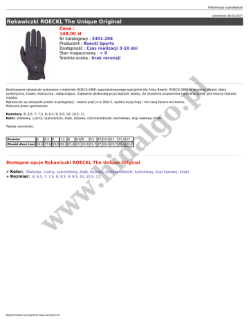 Informacje o produkcie Utworzono 08-03-2017 Rękawiczki ROECKL The Unique Original Cena : 148,00 zł Nr katalogowy : 3301-208 Producent : Roeckl Sports Dostępność : Czas realizacji 3-10 dni Stan magazynowy : < 0 Średnia ocena : brak recenzji .p l Ekskluzywne rękawiczki wykonane z materiału ROECK-GRIP, wyprodukowanego specjalnie dla firmy Roeckl. ROECK-GRIP to wysokiej jakości skóra syntetyczna, trwała, elastyczna i oddychająca. Zapewnia doskonałą przyczepność wodzy. Do złudzenia przypomina naturalną skórę, jest mocna i bardzo miękka. Rękawiczki są niezwykle proste w pielęgnacji - można prać je w 30st.C, szybko wysychają i nie tracą fasonu ani koloru. Polecane przez sportowców. Tabela rozmiarów: Rozmiar 6 6,5 7 7,5 8 8,5 9 9,5 al go Rozmiary: 6; 6,5; 7; 7,5; 8; 8,5; 9; 9,5; 10; 10,5; 11 Kolor: śliwkowy, czarny, szarozielony, biały, beżowy, ciemnoniebieski, karmelowy, brąz kawowy, khaki 10 10,5 11 11,5 12 id Obwód dłoni (cm) 16,5 17,6 18,9 20,3 21,6 23 24,3 25,7 27 28,4 29,7 31,4 32,4 Dostępne opcje Rękawiczki ROECKL The Unique Original w w w .h » Kolor: śliwkowy, czarny, szarozielony, biały, beżowy, ciemnoniebieski, karmelowy, brąz kawowy, khaki. » Rozmiar: 6, 6,5, 7, 7,5, 8, 8,5, 9, 9,5, 10, 10,5, 11. Wygenerowano w programie www.oscGold.com