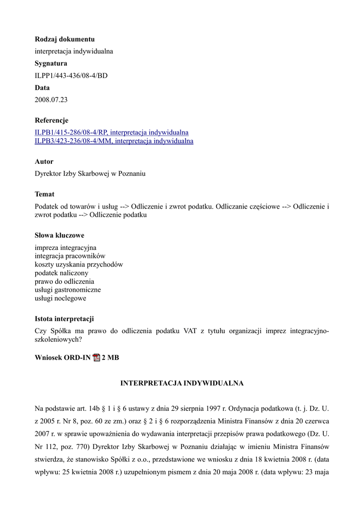 Rodzaj dokumentu interpretacja indywidualna Sygnatura ILPP1/443-436/08-4/BD Data 2008.07.23 Referencje ILPB1/415-286/08-4/RP, interpretacja indywidualna ILPB3/423-236/08-4/MM, interpretacja indywidualna Autor Dyrektor Izby Skarbowej w Poznaniu Temat Podatek od towarów i usług --> Odliczenie i zwrot podatku. Odliczanie częściowe --> Odliczenie i zwrot podatku --> Odliczenie podatku Słowa kluczowe impreza integracyjna integracja pracowników koszty uzyskania przychodów podatek naliczony prawo do odliczenia usługi gastronomiczne usługi noclegowe Istota interpretacji Czy Spółka ma prawo do odliczenia podatku VAT z tytułu organizacji imprez integracyjnoszkoleniowych? Wniosek ORD-IN 2 MB INTERPRETACJA INDYWIDUALNA Na podstawie art. 14b § 1 i § 6 ustawy z dnia 29 sierpnia 1997 r. Ordynacja podatkowa (t. j. Dz. U. z 2005 r. Nr 8, poz. 60 ze zm.) oraz § 2 i § 6 rozporządzenia Ministra Finansów z dnia 20 czerwca 2007 r. w sprawie upoważnienia do wydawania interpretacji przepisów prawa podatkowego (Dz. U. Nr 112, poz. 770) Dyrektor Izby Skarbowej w Poznaniu działając w imieniu Ministra Finansów stwierdza, że stanowisko Spółki z o.o., przedstawione we wniosku z dnia 18 kwietnia 2008 r. (data wpływu: 25 kwietnia 2008 r.) uzupełnionym pismem z dnia 20 maja 2008 r. (data wpływu: 23 maja 2008 r.) o udzielenie pisemnej interpretacji przepisów prawa podatkowego dotyczącej podatku od towarów i usług w zakresie prawa do odliczenia – jest nieprawidłowe. UZASADNIENIE W dniu 25 kwietnia 2008 r. został złożony ww. wniosek o udzielenie pisemnej interpretacji przepisów prawa podatkowego w indywidualnej sprawie dotyczącej podatku od towarów i usług w zakresie prawa do odliczenia. Wniosek ten uzupełniono pismem z dnia 20 maja 2008 r. (data wpływu: 23 maja 2008 r.) o doprecyzowanie stanu faktycznego oraz dodatkową opłatę. W przedmiotowym wniosku został przedstawiony następujący stan faktyczny. Spółka organizuje dla swoich pracowników imprezy w postaci: a. imprez (spotkań) integracyjnych w lokalu gastronomicznym, b. wyjazdowych imprez integracyjnych połączonych z noclegiem i wyżywieniem, c. imprez okolicznościowych. Część tak organizowanych imprez zawiera elementy szkoleniowe lub informacyjne, w szczególności o realizowanych przez Spółkę projektach, wdrażanych obecnie i przyszłych procesach budowlanych oraz planowanym rozwoju firmy, a część ma wyłącznie charakter integracyjny. W aspekcie integracyjnym ww. imprezy mają na celu przede wszystkim zintegrowanie pracowników i zmotywowanie ich do dalszej pracy oraz podtrzymanie poczucia zadowolenia pracowników z wykonywania pracy w Spółce. W aspekcie szkoleniowym i informacyjnym, celem Podatnika jest podnoszenie wiedzy pracowników dotyczącej szeroko pojętej działalności Spółki oraz jej otoczenia gospodarczego. Realizowane tak imprezy są następnie analizowane w celu poprawy organizacji i efektywności pracy. Forma organizacji imprezy ma zróżnicowany charakter, albo jest ona w całości organizowana przez pracowników, w takim przypadku Spółka odrębnie kupuje usługę gastronomiczną, przejazdy, noclegi etc., albo też zleca podmiotowi trzeciemu całościową organizację imprezy włącznie z organizacją przejazdów, noclegami, wyżywieniem oraz programem artystycznym. W drugim przypadku Wnioskodawca dokumentuje zakup imprezy fakturą opiewającą na całość zakupionej usługi. Pismem uzupełniającym z dnia 20 maja 2008 r. Spółka wyjaśniła ponadto, iż: 1. W organizowanych imprezach integracyjnych uczestniczą wyłącznie zatrudnieni pracownicy. Forma organizacji imprezy ma zróżnicowany charakter. Jest ona albo w całości organizowana przez pracowników i w takim przypadku Spółka odrębnie kupuje usługę gastronomiczną, przejazdy, noclegi etc., albo też całościowa organizacja imprezy, włącznie z organizacją przejazdów, noclegami, wyżywieniem oraz programem artystycznym zlecana jest podmiotowi trzeciemu. W tym drugim przypadku, Spółka dokumentuje jej zakup fakturą opiewającą na całość zakupionej usługi. 2. Celem organizowanych imprez jest integracja oraz szkolenie. Część organizowanych spotkań zawiera elementy szkoleniowe lub informacyjne o realizowanych przez Spółkę projektach, wdrażaniu obecnych i przyszłych procesów budowlanych oraz o planowanym rozwoju firmy. Część imprez ma charakter wyłącznie integracyjny. W zakresie integracyjnym ww. imprezy mają na celu przede wszystkim zintegrowanie pracowników i zmotywowanie ich do dalszej pracy oraz podtrzymanie poczucia zadowolenia pracowników z wykonywania pracy w Spółce. W aspekcie szkoleniowym i informacyjnym, celem Podatnika jest podnoszenie wiedzy pracowników dotyczącej szeroko pojętej działalności Spółki oraz jej otoczenia gospodarczego. Realizowane tak imprezy są następnie analizowane w celu poprawy organizacji i efektywności pracy. 3. Imprezy integracyjne są organizowane bez okazji, co wynika z ich charakteru. Natomiast imprezy okolicznościowe mające na celu integrację pracowników organizowane są np. z okazji Wigilii, Nowego Roku czy szczególnie istotnych zdarzeń dla Spółki. W związku z powyższym zadano następujące pytanie: Czy Spółka ma prawo do odliczenia podatku VAT w związku z zakupem towarów na ww. cele... Zdaniem Wnioskodawcy, podatek VAT naliczony w związku z wydatkami na zakup towarów i usług związanych z organizacją ww. imprez, bądź zakup całościowej usługi organizacji przedmiotowych imprez od podmiotu trzeciego, które udokumentowano fakturami VAT, podlega odliczeniu za zasadach ogólnych. Zgodnie bowiem z art. 86 ust. 1 ustawy o VAT, w zakresie, w jakim towary i usługi są wykorzystywane do wykonywania czynności opodatkowanych, podatnikowi, o którym mowa w art. 15 przysługuje prawo do obniżenia kwoty podatku należnego o kwotę podatku naliczonego. Tym samym, podstawowym warunkiem uprawniającym do skorzystania z prawa do obniże