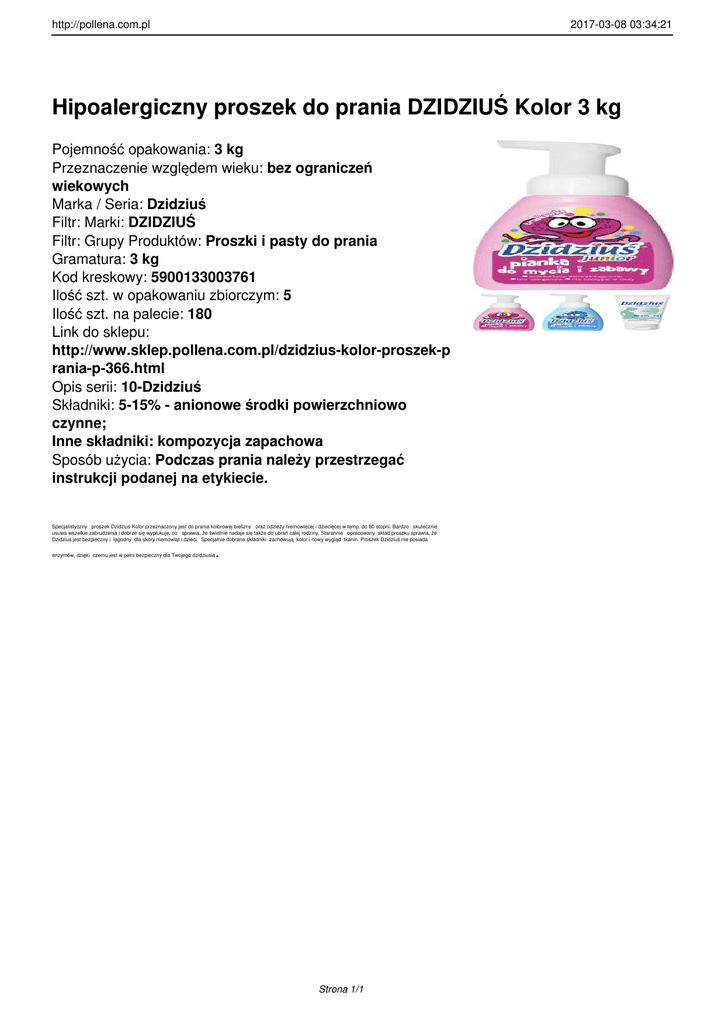 http://pollena.com.pl 2017-03-08 03:34:21 Hipoalergiczny proszek do prania DZIDZIUŚ Kolor 3 kg Pojemność opakowania: 3 kg Przeznaczenie względem wieku: bez ograniczeń wiekowych Marka / Seria: Dzidziuś Filtr: Marki: DZIDZIUŚ Filtr: Grupy Produktów: Proszki i pasty do prania Gramatura: 3 kg Kod kreskowy: 5900133003761 Ilość szt. w opakowaniu zbiorczym: 5 Ilość szt. na palecie: 180 Link do sklepu: http://www.sklep.pollena.com.pl/dzidzius-kolor-proszek-p rania-p-366.html Opis serii: 10-Dzidziuś Składniki: 5-15% - anionowe środki powierzchniowo czynne; Inne składniki: kompozycja zapachowa Sposób użycia: Podczas prania należy przestrzegać instrukcji podanej na etykiecie. Specjalistyczny proszek Dzidziuś Kolor przeznaczony jest do prania kolorowej bielizny oraz odzieży niemowlęcej i dziecięcej w temp. do 60 stopni. Bardzo skutecznie usuwa wszelkie zabrudzenia i dobrze się wypłukuje, co sprawia, że świetnie nadaje się także do ubrań całej rodziny. Starannie opracowany skład proszku sprawia, że Dzidziuś jest bezpieczny i łagodny dla skory niemowląt i dzieci. Specjalnie dobrane składniki zachowują kolor i nowy wygląd tkanin. Proszek Dzidziuś nie posiada enzymów, dzięki czemu jest w pełni bezpieczny dla Twojego dzidziusia . Strona 1/1