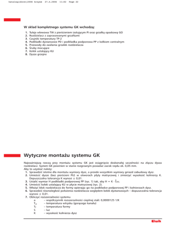 katalog(skrot)2006 krzywe 27.4.2006 11:02 Page 22 W sk∏ad kompletnego systemu GK wchodzà: 1. 2. 3. 4. 5. 6. 7. 8. Tuleja wlewowa TW z pierÊcieniem izolujàcym PI oraz grza∏kà opaskowà GO Rozdzielacz z zaprasowanymi grza∏kami Czujniki temperatury TP-2 Podk∏adki dystansowe PD i podk∏adka podporowa PP z ko∏kiem centralnym Przewody do zasilania grza∏ek rozdzielacza Âruby mocujàce Ko∏ek ustalajàcy KU Dysze grzejne Wytyczne monta˝u systemu GK Najwa˝niejszà rzeczà przy monta˝u systemu GK jest osiàgni´cie doskona∏ej szczelnoÊci na z∏àczu dysza rozdzielacz. System GK powinien w stanie rozgrzanym posiadaç zacisk rz´du ok. 0,05 mm. Aby to uzyskaç nale˝y: 1. Sprawdziç istotne dla monta˝u wymiary dysz, a przede wszystkim wymiary gniazd zabudowy dysz. 2. UmieÊciç dysze (bez pierÊcieni PU) w otworach p∏yty matrycowej i zmierzyç wysokoÊç ko∏nierzy K. Dopuszczalna tolerancja K wynosi ± 0,01. 0 3. Ustaliç wymiar H podk∏adki podporowej PP (rys. 1) tak, aby H = K – 0,02. 4. UmieÊciç ko∏ek ustalajàcy KU w p∏ycie matrycowej (rys. 2). 5. W∏o˝yç blok rozdzielacza do formy opierajàc go na podk∏adce podporowej PP i ko∏nierzach dysz. 6. Sprawdziç równoleg∏oÊç po∏o˝enia rozdzielacza wzgl´dem belek dystansowych – dopuszczalna tolerancja wynosi ± 0,01. 7. Obliczyç rozszerzalnoÊci systemu a – wspó∏czynnik rozszerzalnoÊci cieplnej stali: 0,0000125 1/K – temperatura wtrysku (goràcego kana∏u) Tw Tf – temperatura formy S – luz K – wysokoÊç ko∏nierza dysz katalog(skrot)2006 krzywe 27.4.2006 11:02 Page 23 Wytyczne monta˝u systemu GK H1 z 8. 9. 10. 11. 12. – gruboÊç p∏yty rozdzielacza (wymiar zmierzony) – zacisk 0,05 mm S = α (K + H1) x (Tw – Tf) – z Podk∏adk´ dystansowà PD o wymiarze H3 szlifowaç na wymiar H2 – S; dopuszczalna tolerancja wynosi ±0,01. Wyjàç rozdzielacz z formy. W∏o˝yç pierÊcienie uszczelniajàce PU do dysz zgodnie z zasadà (patrz str. 31). W∏o˝yç ponownie rozdzielacz do formy lekko przykr´cajàc Êrubami mocujàcymi M6. Ârub mocujàcych nie nale˝y mocno dokr´caç, gdy˝ ich zadaniem nie jest zapewnienie szczelnoÊci systemu GK. Przykr´cajàc p∏yt´ mocujàcà formy nale˝y u˝yç minimum 2 Êruby M10 w klasie 10,9 na ka˝dà dysz´. Moment przykr´cania 80Nm.