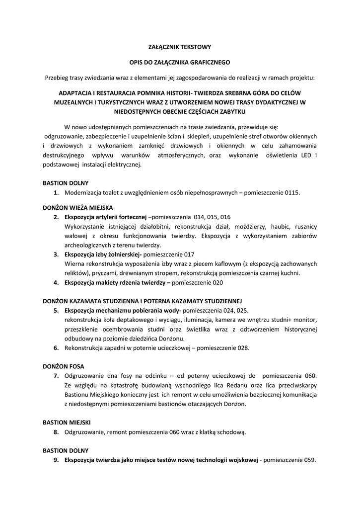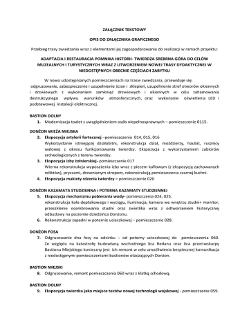 ZAŁĄCZNIK TEKSTOWY OPIS DO ZAŁĄCZNIKA GRAFICZNEGO Przebieg trasy zwiedzania wraz z elementami jej zagospodarowania do realizacji w ramach projektu: ADAPTACJA I RESTAURACJA POMNIKA HISTORII- TWIERDZA SREBRNA GÓRA DO CELÓW MUZEALNYCH I TURYSTYCZNYCH WRAZ Z UTWORZENIEM NOWEJ TRASY DYDAKTYCZNEJ W NIEDOSTĘPNYCH OBECNIE CZĘŚCIACH ZABYTKU W nowo udostępnianych pomieszczeniach na trasie zwiedzania, przewiduje się: odgruzowanie, zabezpieczenie i uzupełnienie ścian i sklepieo, uzupełnienie stref otworów okiennych i drzwiowych z wykonaniem zamknięd drzwiowych i okiennych w celu zahamowania destrukcyjnego wpływu warunków atmosferycznych, oraz wykonanie oświetlenia LED i podstawowej instalacji elektrycznej. BASTION DOLNY 1. Modernizacja toalet z uwzględnieniem osób niepełnosprawnych – pomieszczenie 0115. DONŻON WIEŻA MIEJSKA 2. Ekspozycja artylerii fortecznej –pomieszczenia 014, 015, 016 Wykorzystanie istniejącej działobitni, rekonstrukcja dział, moździerzy, haubic, rusznicy wałowej z okresu funkcjonowania twierdzy. Ekspozycja z wykorzystaniem zabiorów archeologicznych z terenu twierdzy. 3. Ekspozycja izby żołnierskiej- pomieszczenie 017 Wierna rekonstrukcja wyposażenia izby wraz z piecem kaflowym (z ekspozycją zachowanych reliktów), pryczami, drewnianym stropem, rekonstrukcją pomieszczenia czarnej kuchni. 4. Ekspozycja makiety rdzenia twierdzy – pomieszczenie 020 DONŻON KAZAMATA STUDZIENNA i POTERNA KAZAMATY STUDZIENNEJ 5. Ekspozycja mechanizmu pobierania wody- pomieszczenia 024, 025. rekonstrukcja koła deptakowego i wyciągu, iluminacja, kamera we wnętrzu studni+ monitor, przeszklenie ocembrowania studni oraz świetlika wraz z odtworzeniem historycznej odbudowy na poziomie dziedzioca Donżonu. 6. Rekonstrukcja zapadni w poternie ucieczkowej – pomieszczenie 028. DONŻON FOSA 7. Odgruzowanie dna fosy na odcinku – od poterny ucieczkowej do pomieszczenia 060. Ze względu na katastrofę budowlaną wschodniego lica Redanu oraz lica przeciwskarpy Bastionu Miejskiego konieczny jest ich remont w celu umożliwienia bezpiecznej komunikacja z niedostępnymi pomieszczeniami bastionów otaczających Donżon. BASTION MIEJSKI 8. Odgruzowanie, remont pomieszczenia 060 wraz z klatką schodową. BASTION DOLNY 9. Ekspozycja twierdza jako miejsce testów nowej technologii wojskowej - pomieszczenie 059. Odgruzowanie wraz z rekonstrukcją fragmentu sklepienia dla pokazania pierwotnego układu pomieszczenia. Stalowe schody łączące dolną częśd pom. 059 z chodnikiem 0105. 10. Odgruzowanie, remont zawalonych sklepieo chodnika – 0105. Odgruzowanie, remont systemu odwadniającego przylegającego do chodnika 0105. 11. Zabezpieczenie fragmentu lica Bastionu Dolnego przy wyjściu z chodnika 0105 w kierunku Bastionu Kleszczowego oraz Bastionu Miejskiego (dla odtworzenia historycznej komunikacji między bastionami). BASTION KLESZCZOWY 12. Montaż barierek zabezpieczających przed upadkiem do fosy Donżonu. 13. Ekspozycja stanowiska artyleryjskiego Rekonstrukcja działa fortecznego, uczytelnienie ziemnej formy stanowiska wraz z koszami szaocowymi i wyposażeniem. BASTION GÓRNY 14. Zabezpieczenie fragmentu lica Bastionu Górnego przy wejściu i wyjściu z chodnika 0135 , odbudowa wejścia do chodnika 0135, odgruzowanie, remont zawalonych sklepieo chodnika. Odgruzowanie, remont systemu odwadniającego, przylegającego do chodnika 0135. 15. Ekspozycja systemu odwadniającego twierdzy - chodnik 0135. 16. Stalowy trap z chodnika 0135 do lazaretu 0131 – ekspozycja Bramy Górnej Donżonu. BASTION NOWOWIEJSKI, BASTION MIEJSKI 17. Montaż barierek zabezpieczających przed upadkiem do fosy Donżonu. CZEŚDI PROJEKTU NIE ZAZNACZONE NA ZAŁĄCZNIKU GRAFICZNYM NR 1 DONŻON WIEŻA NOWOWIEJSKA Taras widokowy wraz z remontem gzymsu koronowego – ekspozycja pozwalająca na wgląd do dna fosy oraz ekspozycję krajobrazową elementów systemu obronnego. Przyłącze kanalizacyjne. Długośd ok. 950m, deniwelacja ok. 95m. Orientacyjna trasa przyłącza: http://www.geocontext.org/publ/2010/04/profiler/pl/?topo_ha=2016015627358572