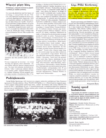 WłĄczyć piĄTY biEG Skidzinianie z dużymi szansami na piątolic podium po rundzie jesiennej Ten sezon dla skidzinian miał być lepszy od rzedniego. I rzeczywiście tak jest. Pod:czni Jana Sporysza trzymają się mocno ściczołówki piątoligowych roz&ry\vek. LKS :lziń regularnie punktuje, ale drużynie przyiają się także kJasyczne wpadki. Zespół poił zdecydowanie za dużo punktów na swoim lionie. Jak na przykład w meczu z Iskrą Brze:<a. Gospodarze niespodziewanie zostali rozi aż I :4. A zaczęło si~ znakomicie dla skidzin. Była 20. minuta gry, kiedy z ostrego kąta ymierzył Sebastian Nowak. Piłka wylądowała ;iatce. :idz;nioll;t: zbyt duż.o pllllktó'" gubią lIa swoim ,diollie Póżniej rozpoczął się koszmar - nie owija bawełnę Jan Sporysz,. trener skidzinian . Za· ndawaliśmy kibicom festiwal zmarnowanych mzji. Ten mecz hył pokazem strzeleckiej nieJoiIlOści. Tylko w pierwszej odslonie doliczym się czterech "st:tek". Najpierw Mateusz HanJS. j) później Sebastian Nowak przegrali pojeynk! jeden na jeden z bramkarzem Iskry. Z ko- lei będący \••..idealnej syruacji Konrad Sporysz niepotrzebnie podawał. zamiast decydować się na bezpośrednie uderzenie. Przekombinował także' Tomasz Tworek. a wystarczyło posłać piłkę do siatki - kręci głową Jan Sporysz. Na drugie 45 minut zespoły wychodziły prz), wyniku remisowym I: 1. Do wyrównania doprowadził Artur Opala, który popisał się kapitalnym uderzeniem pod poprzeczkę. Po zmianie stron było jeszcze gorLej. Trafiali ju~ tylko przyjezdni. Futbolówka trzykrotnie wylądowała w bramce miejscowych. - Po prostu Iskra potrafiła wykorzystać swoje okazje, a my nie. Przy golu na 1:2 nie popisał się grający w naszej bramce Tomasz Kobylański. To trafienie niestety obciąża jego konto. W drugiej połowie Mateusz Hankus z dwóch metrów nie zdołać wepchnąć futbolówkj do siatki. a Sebastian Nowak dwukrotnie przegrał pojedynki jeden na jeden. Podsumowaniem naszej zastraszającej nieskuteczności był zmarnowany przez Mariusza Wójcika rzut karny. Tnna sprawa, że prawdziwy .,dzień konia" mial bramkarz Iskry, Jakub Jasiński - zakonczyi trener skidzinian. O pora1:ce z Iskrą. skidzinianie muszą szybko zapomnieć. Na finiszu rundy jesiennej można jeszcze bardzo ,,,ieIe "ugrać". Trzeba tylko włączyć piąty bieg. W tym sezonie piąta liga jest du~o ciekawsza, niż w poprzednich rozgrywkach. Wówczas zdecydowanie dominowały drużyny z KJeczy Dolnej i Stryszawy. Teraz liczy się przynajmniej sześć ekip. Oprócz skidzinian, do piątoligowych faworytów trzeba zaliczyć Chełmek, Sołę Oświęcim, Iskrę Brzezinka, Jałowca Stryszawa i beniaminka z Suchej Beskidzkiej. Największym rozczarowaniem jest postawa Kalwarianki i oświęcimskiej Unii. W tym ostatnim zespole doszło już do zmiany na stanowisku szkoleniowca. Tomasza Wróbla zastąpił Jacek Dobrowolski. (staj) PodziĘkoWANiA Zarząd Klubu Sportowego LKS Jawiszowice pragnie serdecznie podziękować Panu Prezesowi :ugcniuszowi Nowakowskiemu z firmy TRANS-JAN Spółka z 0.0. w Katowicach za wsparcie naszeo klubu popr<ez 7al,up sprzętu sportowego finny .,Adidas' dla drużyny piŁki nowej (TRANS-JA.N itnicje od ł991 r. i specjalizuje się m.in. w robotach górniczych, w transporcie krajo\\t)1l1 i międzynaodmvym oraz w budownictwie. Oferuje stabilną pracę również dla mieszkańców gminy BrLeszczc. )alsze szczegóły w LKS Jawiszowicc). 2.a,.zqd LKS 3o.wiszowi~ liGA Piłki SiATkoWEj Ciekawą inicjatywą sportową pochwalić się może Nadwiślańska Spółka Energetyczna sp. z 0.0. z siedzibą w Brzeszczach. Otóż od stycznia roku 20n powolano tu do tycia Ligę Pilki Siatkowej, która odbywa rozgrywki raz w miesiącu w lIali Sportowej w Brzeszczach. w postaci rywalizacji siedmiu 6-osobowych drużyn. Zespoły reprezentują szeŚĆZakładów Cieplow. niczych oraz biura dyrekcji (administrację) przedsiębiorstwa. Jako, że każda z ciepłowni 2llajduje się w innej miejscowości (Brzeszcze, Czechowice-Dziedzice, Wola, Bieruń, Lędziny, Libiąż) rywalizacja robi się tym ciekawsza, że ma posmak prawdziwej ligi. Zawody prowadzone są w sposób maksymalnie w tych warunkach profesjonalny, choć oczywiście wszyscy gracze to amatorzy. na co dzień wykonujący przeważnie prace fizyczne w s\voicb zakładach. Mecze sędziuje zawodowy sędzia nie będący pracownikiem przedsiębiorstwa, prowadzone są stosowne protokoły ze spotkań. a bieżąca punktacja poszczególnych drużyn dostępna jest w formie tabeli na stronie internetowej NSE (http://www.nowa.nse.com.plll liga, J 68). Powołanie Ligi Piłki Siatkowej odbyło się z inspiracji Komisji Zakłado'llcj NSZZ "Solidarnosć", która w dużej mierze kreuje życie społeczne i związkowe w przedsiębiorstwie, oraz za osobislym wysiłkiem organizacyjnym i merytorycznym przewodniczącego Krzysztofa Żoch i z·cy przewodniczącego DarTUSZ-3 Gierka. Wanym zaznaczenia jest fakt, że w meczach regularny udział biorą również członkowie kierownictwa przedsiębiorstwa z Prezesem Sławomirem Obidzińskim na czele. Mimo, iż zbli'-<l sil( już końcówka roku rozgrywek ligi, podczas której zdarzały się i kontuzje, entuzjazm uczestników oraz ieh zaangażowanie nie maleją. Widać. że wśród zawodników wzrosła we· wnętrzna zespołowo-zakładowa integracja oraz kondycja fizyczna, a co za tym idzie, satysfakcja zarówno dla uczestników jak idla całej fmny. Można zatem śmiało powiedzieć, że był to pomysł "na piątkę'" TURNiEj spEEd bAdMiNTONA Zapraszamy do udziału w naszym turnieju wszystkich chętnych, speed badminton jest wyjątkową grą - można wystartować w turnieju nawet gdy się nigdy nie miało rakietki w ręce i całkiem nieźle sobie pograć :)} Organizator: Ośrodek Kultury Brzeszcze Miejsce: Hala Sportowa w Brzeszczach, ul. Oriar Oświęcimia 49 Data: 12 listopada 2011 (sobota) Program: 9.00 Weryfikacja 9.30 Rozpoczęcie rozgrywek Oplata startowa: 5 zł juniorzy, 