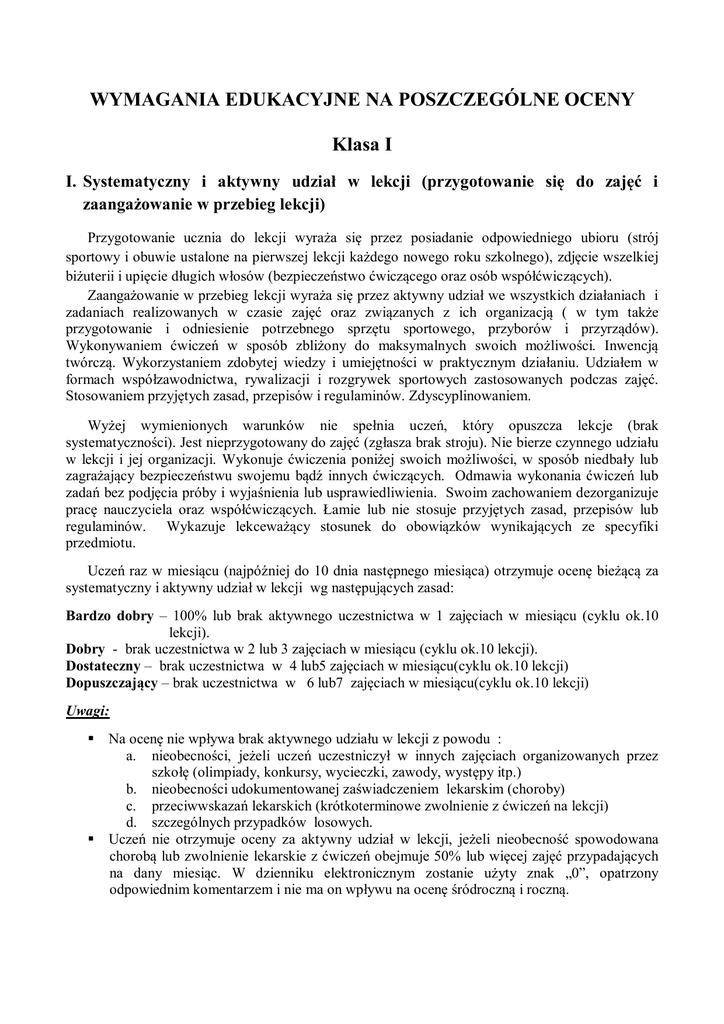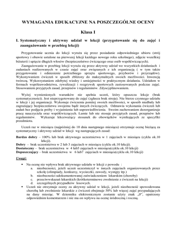 WYMAGANIA EDUKACYJNE NA POSZCZEGÓLNE OCENY Klasa I I. Systematyczny i aktywny udział w lekcji (przygotowanie się do zajęć i zaangażowanie w przebieg lekcji) Przygotowanie ucznia do lekcji wyraża się przez posiadanie odpowiedniego ubioru (strój sportowy i obuwie ustalone na pierwszej lekcji każdego nowego roku szkolnego), zdjęcie wszelkiej biżuterii i upięcie długich włosów (bezpieczeństwo ćwiczącego oraz osób współćwiczących). Zaangażowanie w przebieg lekcji wyraża się przez aktywny udział we wszystkich działaniach i zadaniach realizowanych w czasie zajęć oraz związanych z ich organizacją ( w tym także przygotowanie i odniesienie potrzebnego sprzętu sportowego, przyborów i przyrządów). Wykonywaniem ćwiczeń w sposób zbliżony do maksymalnych swoich możliwości. Inwencją twórczą. Wykorzystaniem zdobytej wiedzy i umiejętności w praktycznym działaniu. Udziałem w formach współzawodnictwa, rywalizacji i rozgrywek sportowych zastosowanych podczas zajęć. Stosowaniem przyjętych zasad, przepisów i regulaminów. Zdyscyplinowaniem. Wyżej wymienionych warunków nie spełnia uczeń, który opuszcza lekcje (brak systematyczności). Jest nieprzygotowany do zajęć (zgłasza brak stroju). Nie bierze czynnego udziału w lekcji i jej organizacji. Wykonuje ćwiczenia poniżej swoich możliwości, w sposób niedbały lub zagrażający bezpieczeństwu swojemu bądź innych ćwiczących. Odmawia wykonania ćwiczeń lub zadań bez podjęcia próby i wyjaśnienia lub usprawiedliwienia. Swoim zachowaniem dezorganizuje pracę nauczyciela oraz współćwiczących. Łamie lub nie stosuje przyjętych zasad, przepisów lub regulaminów. Wykazuje lekceważący stosunek do obowiązków wynikających ze specyfiki przedmiotu. Uczeń raz w miesiącu (najpóźniej do 10 dnia następnego miesiąca) otrzymuje ocenę bieżącą za systematyczny i aktywny udział w lekcji wg następujących zasad: Bardzo dobry – 100% lub brak aktywnego uczestnictwa w 1 zajęciach w miesiącu (cyklu ok.10 lekcji). Dobry - brak uczestnictwa w 2 lub 3 zajęciach w miesiącu (cyklu ok.10 lekcji). Dostateczny – brak uczestnictwa w 4 lub5 zajęciach w miesiącu(cyklu ok.10 lekcji) Dopuszczający – brak uczestnictwa w 6 lub7 zajęciach w miesiącu(cyklu ok.10 lekcji) Uwagi: Na ocenę nie wpływa brak aktywnego udziału w lekcji z powodu : a. nieobecności, jeżeli uczeń uczestniczył w innych zajęciach organizowanych przez szkołę (olimpiady, konkursy, wycieczki, zawody, występy itp.) b. nieobecności udokumentowanej zaświadczeniem lekarskim (choroby) c. przeciwwskazań lekarskich (krótkoterminowe zwolnienie z ćwiczeń na lekcji) d. szczególnych przypadków losowych. Uczeń nie otrzymuje oceny za aktywny udział w lekcji, jeżeli nieobecność spowodowana chorobą lub zwolnienie lekarskie z ćwiczeń obejmuje 50% lub więcej zajęć przypadających na dany miesiąc. W dzienniku elektronicznym zostanie użyty znak „0”, opatrzony odpowiednim komentarzem i nie ma on wpływu na ocenę śródroczną i roczną. Dopuszcza się jedno w ciągu roku szkolnego nieprzygotowanie do lekcji (brak stroju) bez konsekwencji. Każde następne nieprzygotowanie do lekcji ( brak stroju) obniża ocenę za aktywny udział w lekcji o jeden stopień. II. Osiągnięcia (umiejętności) 1. Pomiar wysokości, masy ciała i tętna, umiejscowienie własnej wysokości i masy na siatce centylowej – umiejętności te są sprawdzane podczas zajęć warsztatowych w ramach edukacji zdrowotnej. 2. Przygotowanie organizmu do wysiłku fizycznego, umiejętność organizacji aktywnego wypoczynku w czasie wolnym dla siebie i innych osób: Przygotowanie i prowadzenie fragmentu lub całych zajęć w preferowanej formie ruchu lub dyscyplinie sportowej uczeń otrzymuje ocenę bieżącą bardzo dobrą lub celującą. Dobór i wykonanie ćwiczeń kształtujących poszczególne zdolności motoryczne (co najmniej po dwa ćwiczenia kształtujące. Ocena celująca – uczeń potrafi wybrać i bezbłędnie wykonać więcej niż dwa ćwiczenia kształtujące poszczególne zdolności motoryczne oraz używając terminologii wykraczającej poza program uzasadnić swój wybór. Ocena bardzo dobra – uczeń potrafi wybrać i bezbłędnie wykonać co najmniej po dwa ćwiczenia kształtujące poszczególne zdolności motoryczne oraz w sposób rzeczowy uzasadnić swój wybór. Ocena dobra – uczeń potrafi w sposób prawidłowy wybrać i wykonać co najmniej po dwa ćwiczenia kształtujące poszczególne zdolności motoryczne oraz potrafi w prosty sposób uzasadnić swój wybór . Ocena dostateczna – uczeń potrafi wybrać i wykonać co najmniej po jednym ćwiczeniu kształtującym poszczególne zdolności motoryczne (występują błędy w zakresie terminologii lub estetyki ruchu). Uczeń nie zawsze potrafi w prosty sposób uzasadnić swój wybór. Ocena dopuszczająca – uczeń potrafi samodzielnie lub z pomocą nauczyciela wybrać i wykonać co najmniej po jednym ćwiczeniu kształtującym poszczególne zdolności motoryczne (występują błędy w terminologii, wykonaniu lub doborze drugiego z ćwiczeń). Uczeń nie umie samodzielnie uzasadnić swojego wyboru, jednak potrafi uzasadnić wybór z pomocą nauczyciela. 3. Wykonanie podstawowych elementów technicznych (ćwiczeń) z gimnastyki, lekkiej atletyki, dwóch gier zespołowych: 3.1 GIMNASTYKA Przewidywane sprawdziany: Przewroty w przód i w tył z różnych pozycji wyjściowych (np. z przysiadu podpartego, z postawy wysokiej, z wagi przodem itp.) do różnych pozycji końcowych (np. do przysiadu podpartego, do rozkroku, do klęku jednonóż itp.) Łuk napięty (mostek) z leżenia tyłem. Leżenie przewrotne – przerzutne. Stanie na rękach z asekuracją. Ocena celująca – uczeń wykonuje ćwiczenie wzorową techniką, dynamicznie, płynnie i estetycznie. Stosuje postawę zasadniczą, wymagane pozycje (wyjściową i końcową), cechę gimnastyczną. Ocena bardzo dobra – uc