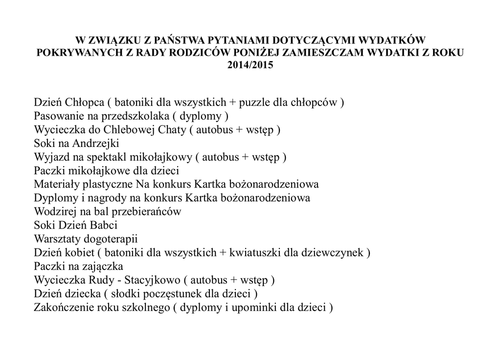 W ZWIĄZKU Z PAŃSTWA PYTANIAMI DOTYCZĄCYMI WYDATKÓW POKRYWANYCH Z RADY RODZICÓW PONIŻEJ ZAMIESZCZAM WYDATKI Z ROKU 2014/2015 Dzień Chłopca ( batoniki dla wszystkich + puzzle dla chłopców ) Pasowanie na przedszkolaka ( dyplomy ) Wycieczka do Chlebowej Chaty ( autobus + wstęp ) Soki na Andrzejki Wyjazd na spektakl mikołajkowy ( autobus + wstęp ) Paczki mikołajkowe dla dzieci Materiały plastyczne Na konkurs Kartka bożonarodzeniowa Dyplomy i nagrody na konkurs Kartka bożonarodzeniowa Wodzirej na bal przebierańców Soki Dzień Babci Warsztaty dogoterapii Dzień kobiet ( batoniki dla wszystkich + kwiatuszki dla dziewczynek ) Paczki na zajączka Wycieczka Rudy - Stacyjkowo ( autobus + wstęp ) Dzień dziecka ( słodki poczęstunek dla dzieci ) Zakończenie roku szkolnego ( dyplomy i upominki dla dzieci )