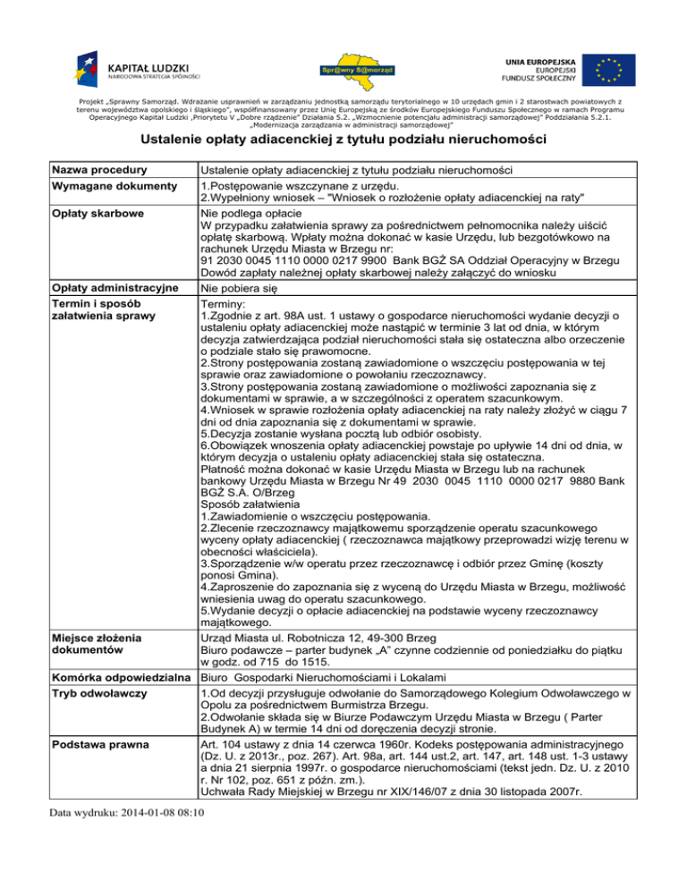 Projekt „Sprawny Samorząd. Wdrażanie usprawnień w zarządzaniu jednostką samorządu terytorialnego w 10 urzędach gmin i 2 starostwach powiatowych z terenu województwa opolskiego i śląskiego”, współfinansowany przez Unię Europejską ze środków Europejskiego Funduszu Społecznego w ramach Programu Operacyjnego Kapitał Ludzki ,Priorytetu V „Dobre rządzenie” Działania 5.2. „Wzmocnienie potencjału administracji samorządowej” Poddziałania 5.2.1. „Modernizacja zarządzania w administracji samorządowej” Ustalenie opłaty adiacenckiej z tytułu podziału nieruchomości Nazwa procedury Wymagane dokumenty Ustalenie opłaty adiacenckiej z tytułu podziału nieruchomości 1.Postępowanie wszczynane z urzędu. 2.Wypełniony wniosek – "Wniosek o rozłożenie opłaty adiacenckiej na raty" Opłaty skarbowe Nie podlega opłacie W przypadku załatwienia sprawy za pośrednictwem pełnomocnika należy uiścić opłatę skarbową. Wpłaty można dokonać w kasie Urzędu, lub bezgotówkowo na rachunek Urzędu Miasta w Brzegu nr: 91 2030 0045 1110 0000 0217 9900 Bank BGŻ SA Oddział Operacyjny w Brzegu Dowód zapłaty należnej opłaty skarbowej należy załączyć do wniosku Opłaty administracyjne Nie pobiera się Termin i sposób Terminy: załatwienia sprawy 1.Zgodnie z art. 98A ust. 1 ustawy o gospodarce nieruchomości wydanie decyzji o ustaleniu opłaty adiacenckiej może nastąpić w terminie 3 lat od dnia, w którym decyzja zatwierdzająca podział nieruchomości stała się ostateczna albo orzeczenie o podziale stało się prawomocne. 2.Strony postępowania zostaną zawiadomione o wszczęciu postępowania w tej sprawie oraz zawiadomione o powołaniu rzeczoznawcy. 3.Strony postępowania zostaną zawiadomione o możliwości zapoznania się z dokumentami w sprawie, a w szczególności z operatem szacunkowym. 4.Wniosek w sprawie rozłożenia opłaty adiacenckiej na raty należy złożyć w ciągu 7 dni od dnia zapoznania się z dokumentami w sprawie. 5.Decyzja zostanie wysłana pocztą lub odbiór osobisty. 6.Obowiązek wnoszenia opłaty adiacenckiej powstaje po upływie 14 dni od dnia, w którym decyzja o ustaleniu opłaty adiacenckiej stała się ostateczna. Płatność można dokonać w kasie Urzędu Miasta w Brzegu lub na rachunek bankowy Urzędu Miasta w Brzegu Nr 49 2030 0045 1110 0000 0217 9880 Bank BGŻ S.A. O/Brzeg Sposób załatwienia 1.Zawiadomienie o wszczęciu postępowania. 2.Zlecenie rzeczoznawcy majątkowemu sporządzenie operatu szacunkowego wyceny opłaty adiacenckiej ( rzeczoznawca majątkowy przeprowadzi wizję terenu w obecności właściciela). 3.Sporządzenie w/w operatu przez rzeczoznawcę i odbiór przez Gminę (koszty ponosi Gmina). 4.Zaproszenie do zapoznania się z wyceną do Urzędu Miasta w Brzegu, możliwość wniesienia uwag do operatu szacunkowego. 5.Wydanie decyzji o opłacie adiacenckiej na podstawie wyceny rzeczoznawcy majątkowego. Miejsce złożenia Urząd Miasta ul. Robotnicza 12, 49-300 Brzeg dokumentów Biuro podawcze – parter budynek „A” czynne codziennie od poniedziałku do piątku w godz. od 715 do 1515. Komórka odpowiedzialna Biuro Gospodarki Nieruchomościami i Lokalami Tryb odwoławczy 1.Od decyzji przysługuje odwołanie do Samorządowego Kolegium Odwoławczego w Opolu za pośrednictwem Burmistrza Brzegu. 2.Odwołanie składa się w Biurze Podawczym Urzędu Miasta w Brzegu ( Parter Budynek A) w termie 14 dni od doręczenia decyzji stronie. Podstawa prawna Art. 104 ustawy z dnia 14 czerwca 1960r. Kodeks postępowania administracyjnego (Dz. U. z 2013r., poz. 267). Art. 98a, art. 144 ust.2, art. 147, art. 148 ust. 1-3 ustawy a dnia 21 sierpnia 1997r. o gospodarce nieruchomościami (tekst jedn. Dz. U. z 2010 r. Nr 102, poz. 651 z późn. zm.). Uchwała Rady Miejskiej w Brzegu nr XIX/146/07 z dnia 30 listopada 2007r. Data wydruku: 2014-01-08 08:10 Projekt „Sprawny Samorząd. Wdrażanie usprawnień w zarządzaniu jednostką samorządu terytorialnego w 10 urzędach gmin i 2 starostwach powiatowych z terenu województwa opolskiego i śląskiego”, współfinansowany przez Unię Europejską ze środków Europejskiego Funduszu Społecznego w ramach Programu Operacyjnego Kapitał Ludzki ,Priorytetu V „Dobre rządzenie” Działania 5.2. „Wzmocnienie potencjału administracji samorządowej” Poddziałania 5.2.1. „Modernizacja zarządzania w administracji samorządowej” Dodatkowe informacje Formularze do pobrania Osoba nadzorująca aktualność karty Data następnej aktualizacji Opracował Data opracowania Sprawdził Data sprawdzenia Zatwierdził Data zatwierdzenia zmieniająca Uchwałę nr XXXV/264/05 Rady Miejskiej w Brzegu z dnia 25 lutego 2005r. w sprawie ustalenia wysokości stawki procentowej opłat adiacenckich (Dz. Urz. Woj. Opolskiego nr 2., poz. 38 z 2008 r.) 1.Opłatę adiacencką ustala się w wysokości 30% różnicy wartości nieruchomości przed i po podziale. 2.w odniesieniu do decyzji ostatecznych, zatwierdzających podział nieruchomości wydanych przed 26.01.2008r. wysokość stawki procentowej opłaty adiacenckiej wynosi 50% różnicy wartości nieruchomości przed i po podziale. 3.Wartość nieruchomości przed i po podziale określają rzeczoznawcy majątkowi według stanu i cen na dzień wydania decyzji o ustaleniu opłaty adiacenckiej. 4.Wniosek o rozłożenie na raty należy złożyć przed wydaniem decyzji o ustaleniu opłaty adiacenckiej – w przeciwnym razie wydana zostanie decyzja z płatnością jednorazową. 5.Opłata adiacencka może zostać rozłożona na raty – max. do 10 rocznych rat. Raty podlegają oprocentowaniu przy zastosowaniu stopy procentowej równej stopie redyskonta weksli stosowanej przez Narodowy Bank Polski. 6.W przypadku braku uregulowania należności wynikającej z decyzji ustalającej opłatę adiacencka gmina skieruje wniosek do Sądu Rejonowego w Brzegu V Wydział Ksiąg Wieczystych o obciążenie hipoteki działu IV księgi wieczystej – zobowiązania wierzy