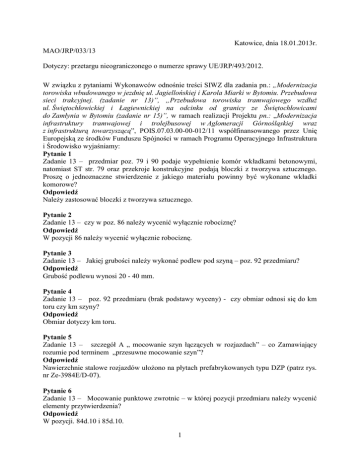 Katowice, dnia 18.01.2013r. MAO/JRP/033/13 Dotyczy: przetargu nieograniczonego o numerze sprawy UE/JRP/493/2012. W związku z pytaniami Wykonawców odnośnie treści SIWZ dla zadania pn.: „Modernizacja torowiska wbudowanego w jezdnię ul. Jagiellońskiej i Karola Miarki w Bytomiu. Przebudowa sieci trakcyjnej. (zadanie nr 13)”, „Przebudowa torowiska tramwajowego wzdłuż ul. Świętochłowickiej i Łagiewnickiej na odcinku od granicy ze Świętochłowicami do Zamłynia w Bytomiu (zadanie nr 15)”, w ramach realizacji Projektu pn.: „Modernizacja infrastruktury tramwajowej i trolejbusowej w Aglomeracji Górnośląskiej wraz z infrastrukturą towarzyszącą”, POIS.07.03.00-00-012/11 współfinansowanego przez Unię Europejską ze środków Funduszu Spójności w ramach Programu Operacyjnego Infrastruktura i Środowisko wyjaśniamy: Pytanie 1 Zadanie 13 – przedmiar poz. 79 i 90 podaje wypełnienie komór wkładkami betonowymi, natomiast ST str. 79 oraz przekroje konstrukcyjne podają bloczki z tworzywa sztucznego. Proszę o jednoznaczne stwierdzenie z jakiego materiału powinny być wykonane wkładki komorowe? Odpowiedź Należy zastosować bloczki z tworzywa sztucznego. Pytanie 2 Zadanie 13 – czy w poz. 86 należy wycenić wyłącznie robociznę? Odpowiedź W pozycji 86 należy wycenić wyłącznie robociznę. Pytanie 3 Zadanie 13 – Jakiej grubości należy wykonać podlew pod szyną – poz. 92 przedmiaru? Odpowiedź Grubość podlewu wynosi 20 - 40 mm. Pytanie 4 Zadanie 13 – poz. 92 przedmiaru (brak podstawy wyceny) - czy obmiar odnosi się do km toru czy km szyny? Odpowiedź Obmiar dotyczy km toru. Pytanie 5 Zadanie 13 – szczegół A „ mocowanie szyn łączących w rozjazdach” – co Zamawiający rozumie pod terminem „przesuwne mocowanie szyn”? Odpowiedź Nawierzchnie stalowe rozjazdów ułożono na płytach prefabrykowanych typu DZP (patrz rys. nr Ze-3984E/D-07). Pytanie 6 Zadanie 13 – Mocowanie punktowe zwrotnic – w której pozycji przedmiaru należy wycenić elementy przytwierdzenia? Odpowiedź W pozycji. 84d.10 i 85d.10. 1 Pytanie 7 Zadanie 13 – Mocowanie punktowe zwrotnic – w której pozycji przedmiaru należy wycenić podlew punktowy pod zwrotnice? Odpowiedź W pozycji. 92d.10. Pytanie 8 Zadanie 13 – Mocowanie punktowe zwrotnic – jakiej grubości należy wycenić podlew punktowy pod zwrotnice? Odpowiedź Grubość podlewu wynosi 20 -40 mm. Pytanie 9 Zadanie 13 – W jakiej ilości należy wycenić szyny twarde? Odpowiedź Szyny "twarde" należy zabudować w łukach o R ≤ 151. 2