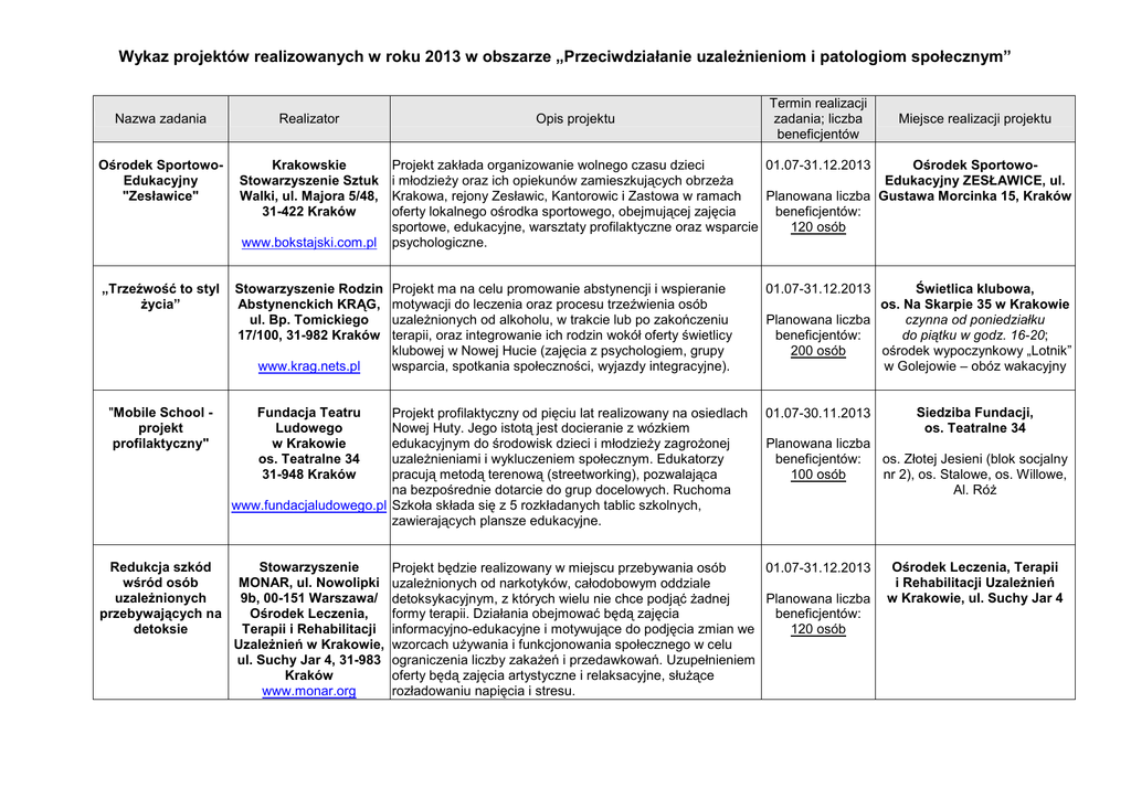 Wykaz projektów realizowanych w roku 2013 w obszarze „Przeciwdziałanie uzależnieniom i patologiom społecznym” Nazwa zadania Realizator Ośrodek SportowoEdukacyjny "Zesławice" Krakowskie Stowarzyszenie Sztuk Walki, ul. Majora 5/48, 31-422 Kraków www.bokstajski.com.pl „Trzeźwość to styl życia” Stowarzyszenie Rodzin Abstynenckich KRĄG, ul. Bp. Tomickiego 17/100, 31-982 Kraków www.krag.nets.pl "Mobile School projekt profilaktyczny" Redukcja szkód wśród osób uzależnionych przebywających na detoksie Fundacja Teatru Ludowego w Krakowie os. Teatralne 34 31-948 Kraków Opis projektu Miejsce realizacji projektu Ośrodek SportowoProjekt zakłada organizowanie wolnego czasu dzieci 01.07-31.12.2013 Edukacyjny ZESŁAWICE, ul. i młodzieży oraz ich opiekunów zamieszkujących obrzeża Krakowa, rejony Zesławic, Kantorowic i Zastowa w ramach Planowana liczba Gustawa Morcinka 15, Kraków oferty lokalnego ośrodka sportowego, obejmującej zajęcia beneficjentów: sportowe, edukacyjne, warsztaty profilaktyczne oraz wsparcie 120 osób psychologiczne. Projekt ma na celu promowanie abstynencji i wspieranie motywacji do leczenia oraz procesu trzeźwienia osób uzależnionych od alkoholu, w trakcie lub po zakończeniu terapii, oraz integrowanie ich rodzin wokół oferty świetlicy klubowej w Nowej Hucie (zajęcia z psychologiem, grupy wsparcia, spotkania społeczności, wyjazdy integracyjne). Projekt profilaktyczny od pięciu lat realizowany na osiedlach Nowej Huty. Jego istotą jest docieranie z wózkiem edukacyjnym do środowisk dzieci i młodzieży zagrożonej uzależnieniami i wykluczeniem społecznym. Edukatorzy pracują metodą terenową (streetworking), pozwalająca na bezpośrednie dotarcie do grup docelowych. Ruchoma www.fundacjaludowego.pl Szkoła składa się z 5 rozkładanych tablic szkolnych, zawierających plansze edukacyjne. Stowarzyszenie MONAR, ul. Nowolipki 9b, 00-151 Warszawa/ Ośrodek Leczenia, Terapii i Rehabilitacji Uzależnień w Krakowie, ul. Suchy Jar 4, 31-983 Kraków www.monar.org Termin realizacji zadania; liczba beneficjentów Świetlica klubowa, os. Na Skarpie 35 w Krakowie czynna od poniedziałku Planowana liczba do piątku w godz. 16-20; beneficjentów: 200 osób ośrodek wypoczynkowy „Lotnik” w Golejowie – obóz wakacyjny 01.07-31.12.2013 01.07-30.11.2013 Siedziba Fundacji, os. Teatralne 34 Planowana liczba beneficjentów: os. Złotej Jesieni (blok socjalny 100 osób nr 2), os. Stalowe, os. Willowe, Al. Róż Projekt będzie realizowany w miejscu przebywania osób 01.07-31.12.2013 uzależnionych od narkotyków, całodobowym oddziale detoksykacyjnym, z których wielu nie chce podjąć żadnej Planowana liczba formy terapii. Działania obejmować będą zajęcia beneficjentów: informacyjno-edukacyjne i motywujące do podjęcia zmian we 120 osób wzorcach używania i funkcjonowania społecznego w celu ograniczenia liczby zakażeń i przedawkowań. Uzupełnieniem oferty będą zajęcia artystyczne i relaksacyjne, służące rozładowaniu napięcia i stresu. Ośrodek Leczenia, Terapii i Rehabilitacji Uzależnień w Krakowie, ul. Suchy Jar 4 Nazwa zadania Realizator Profilaktyka wskazująca i programy redukcji szkód / Parasol Uliczny Centrum Profilaktyki i Edukacji Społecznej PARASOL ul. Rakowicka 10 A, 31-511 Kraków Opis projektu Praca socjalna prowadzona na ulicy (streetworking), której głównym celem jest pomoc w wychodzeniu z prostytucji kobiet, świadczących usług seksualnych na ulicy, przede wszystkim poprzez działania edukacyjne i interwencyjne ukierunkowane na ograniczanie szkód wynikających z używania przez nie substancji psychoaktywnych. www.parasol.org.pl Termin realizacji zadania; liczba beneficjentów Siedziba Stowarzyszenia, ul. Rakowiecka 10 rejon ulic: Św. Filipa, Plac Planowana liczba beneficjentów: Matejki, Stary Kleparz, Długa, 100 osób Plac Słowiański, Krowowderska, Plac Biskupi, Łobzowska, Na Szlaku, Warszawska 01.07-31.12.2013 Poradnia profilaktycznospołeczna dla rodzin politoksykomanów Towarzystwo Rodzin i Przyjaciół Dzieci Uzależnionych POWRÓT Z U Oddział Wojewódzki w Krakowie, ul. Bobrowskiego 10, 31-552 Kraków Świetlica Terapeutyczna "Odszukaj siebie" Stowarzyszenie Romów w Krakowie os. Złotej Jesieni 6/33, 31-831 Kraków Zagospodarowanie wolnego czasu oraz wsparcie w rozwoju dzieci z rodzin niepełnych i zagrożonych wykluczeniem społecznym. Świetlica jest miejscem, gdzie podnoszą poczucie swojej wartości, mają możliwość spotkania się z życzliwymi dorosłymi, a także uzyskują pomoc edukacyjną – we współpracy z asystentem edukacji romskiej. 01.07-31.12.2013 Fundacja na rzecz kobiet z chorobą alkoholową oraz osób dotkniętych przemocą RAZEM BEZPIECZNE, ul. Ugorek 1/221, 31-450 Kraków www.razembezpieczne. org.pl Oferta wsparcia dla kobiet uzależnionych, współuzależnionych, z syndromem DDA oraz doświadczających przemocy: poradnictwo socjalne i prawne, motywowanie do leczenia , zajęcia warsztatowe, grupy wsparcia (także dla współuzależnionych mężczyzn), działania interwencyjne i pomocowe. 01.07-31.12.2013 Centrum Wspierania Kobiet PODNIEŚ GŁOWĘ Miejsce realizacji projektu Wsparcie i objęcie opieką psychologiczną rodzin osób 01.07-31.12.2013 uzależnionych, zagrożonych uzależnieniem oraz młodzieży eksperymentującej ze substancjami psychoaktywnymi, Planowana liczba przejawiającej motywację do leczenia. Oferta Poradni beneficjentów: obejmuje: specjalistyczne poradnictwo, zajęcia grupowe … osób (samopomocowe grupy wsparcia, zajęcia psychoedukacyjne, warsztaty umiejętności psychospołecznych), interwencję kryzysową oraz telefon zaufania i porady on-line. Planowana liczba beneficjentów: 60 osób Planowana liczba beneficjentów: 320 osób Siedziba Towarzystwa, ul. Bobrowskiego 10 Świetlica, os. Złotej Jesieni 6/33 czynna od poniedziałku do piątku w godz. 12-20 Siedziba Fundacji, ul. Ugorek 1/221 Nazwa zadania Realizator Program hostelowy Stowa