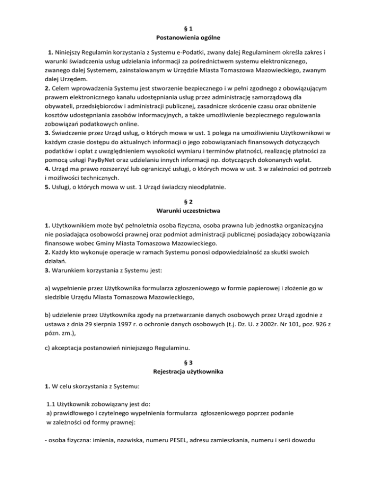 §1 Postanowienia ogólne 1. Niniejszy Regulamin korzystania z Systemu e-Podatki, zwany dalej Regulaminem określa zakres i warunki świadczenia usług udzielania informacji za pośrednictwem systemu elektronicznego, zwanego dalej Systemem, zainstalowanym w Urzędzie Miasta Tomaszowa Mazowieckiego, zwanym dalej Urzędem. 2. Celem wprowadzenia Systemu jest stworzenie bezpiecznego i w pełni zgodnego z obowiązującym prawem elektronicznego kanału udostępniania usług przez administrację samorządową dla obywateli, przedsiębiorców i administracji publicznej, zasadnicze skrócenie czasu oraz obniżenie kosztów udostępniania zasobów informacyjnych, a także umożliwienie bezpiecznego regulowania zobowiązań podatkowych online. 3. Świadczenie przez Urząd usług, o których mowa w ust. 1 polega na umożliwieniu Użytkownikowi w każdym czasie dostępu do aktualnych informacji o jego zobowiązaniach finansowych dotyczących podatków i opłat z uwzględnieniem wysokości wymiaru i terminów płatności, realizację płatności za pomocą usługi PayByNet oraz udzielaniu innych informacji np. dotyczących dokonanych wpłat. 4. Urząd ma prawo rozszerzyć lub ograniczyć usługi, o których mowa w ust. 3 w zależności od potrzeb i możliwości technicznych. 5. Usługi, o których mowa w ust. 1 Urząd świadczy nieodpłatnie. §2 Warunki uczestnictwa 1. Użytkownikiem może być pełnoletnia osoba fizyczna, osoba prawna lub jednostka organizacyjna nie posiadająca osobowości prawnej oraz podmiot administracji publicznej posiadający zobowiązania finansowe wobec Gminy Miasta Tomaszowa Mazowieckiego. 2. Każdy kto wykonuje operacje w ramach Systemu ponosi odpowiedzialność za skutki swoich działań. 3. Warunkiem korzystania z Systemu jest: a) wypełnienie przez Użytkownika formularza zgłoszeniowego w formie papierowej i złożenie go w siedzibie Urzędu Miasta Tomaszowa Mazowieckiego, b) udzielenie przez Użytkownika zgody na przetwarzanie danych osobowych przez Urząd zgodnie z ustawa z dnia 29 sierpnia 1997 r. o ochronie danych osobowych (t.j. Dz. U. z 2002r. Nr 101, poz. 926 z pózn. zm.), c) akceptacja postanowień niniejszego Regulaminu. §3 Rejestracja użytkownika 1. W celu skorzystania z Systemu: 1.1 Użytkownik zobowiązany jest do: a) prawidłowego i czytelnego wypełnienia formularza zgłoszeniowego poprzez podanie w zależności od formy prawnej: - osoba fizyczna: imienia, nazwiska, numeru PESEL, adresu zamieszkania, numeru i serii dowodu osobistego, numeru telefonu, adresu e-mail; - podmiot niebędący osobą fizyczną: nazwa, adres siedziby, NIP, REGON, imię i nazwisko osoby upoważnionej do rejestracji w Systemie, seria i numer dowodu osoby upoważnionej, rodzaj dokumentu upoważniającego do reprezentacji, adres e-mail. b) wyrażenia zgody na przetwarzanie danych zgodnie z ustawa z dnia 29 sierpnia 1997r. o ochronie danych osobowych (Dz.U. z 2002 r. Nr 101, poz. 926 z późn. m.), c) wyrażenia zgody na korzystanie z Systemu na zasadach i warunkach określonych w Regulaminie, 1.2 Formularz zgłoszeniowy wypełnić można za pośrednictwem sieci internet (on-line) przy wykorzystaniu systemu e-podatki lub odręcznie. 1.3 Urząd dokona weryfikacji dostarczonych w formularzu danych i zostanie nadany identyfikator. 1.4 Urząd po potwierdzeniu prawidłowości danych udostępni użytkownikowi hasło startowe, które należy zmienić przy pierwszym logowaniu. 1.5 Urząd uaktywni Użytkownikowi w ciągu 48 godzin indywidualne konto uprawniające do korzystania z Systemu. W przypadkach szczególnych termin ten może ulec wydłużeniu. 1.6 Urząd może kontaktować się z Użytkownikiem za pomocą wiadomości sms. 2. Użytkownik zobowiązany jest chronić hasło przed ujawnieniem go osobom nieuprawnionym. Urząd nie ponosi odpowiedzialności za ujawnienie hasła osobom trzecim przez Użytkownika. §4 Prawa i Obowiązki Urzędu 1. Urząd zobowiązany jest do ochrony danych osobowych Użytkowników zgodnie z przepisami ustawy z dnia 29 sierpnia 1997 r. o ochronie danych osobowych (Dz.U. z 2002 r. Nr 101, poz. 926 z późn. zm.). 2. Urząd nie ponosi odpowiedzialności za jakiekolwiek działania Użytkownika, bądź osoby upoważnionej przez Użytkownika do działania w jego imieniu. 3. Urząd zobowiązuje sie podejmować niezbędne działania w celu wyeliminowania nielegalnych lub niezgodnych z Regulaminem działań Użytkowników. 4. Dokumenty przekazywane za pośrednictwem Systemu oraz dane osobowe zawarte w tych dokumentach podlegają ochronie zgodnie z rozporządzeniem Ministra Spraw Wewnętrznych i Administracji z dnia 29 kwietnia 2004 r. w sprawie dokumentacji przetwarzania danych osobowych oraz warunków technicznych i organizacyjnych, jakim powinny odpowiadać urządzenia i systemy informatyczne służące do przetwarzania danych osobowych (Dz. U. Nr 100, poz. 1024). §5 Prawa i Obowiązki Użytkownika 1. Użytkownik ma prawo korzystać z usług dostępnych w Systemie świadczonych przez Urząd, po dokonaniu rejestracji. 2. Zabrania się Użytkownikowi korzystać z kont innych Użytkowników oraz udostępniać swoje konto innym osobom. 3. W każdym przypadku zmiany danych wymaganych do rejestracji w Systemie, Użytkownik każdorazowo zobowiązany jest do natychmiastowej aktualizacji tych danych. W przypadku nie dokonania aktualizacji, Urząd ma prawo zawieszenia konta Użytkownika. 4. Użytkownik ma obowiązek zmiany hasła podczas pierwszego logowania do Systemu. §6 Zawieszenie konta Użytkownika 1. W przypadku naruszenia przez Użytkownika postanowień Regulaminu, Urząd ma prawo zawiesić jego konto na czas nieokreślony. 2. Urząd zastrzega sobie prawo do zawieszenia konta Użytkownika, którego działania zostaną uznane za szkodliwe dla Systemu. §7 Rezygnacja użytkownika z konta 1. Użytkownik ma prawo do zaprzestania korzystania z Systemu w każdym czasie. Informacje zawarte w profilu Użytkownika, za wyjątkiem danych indywidualnych użytkownika (hasła dost
