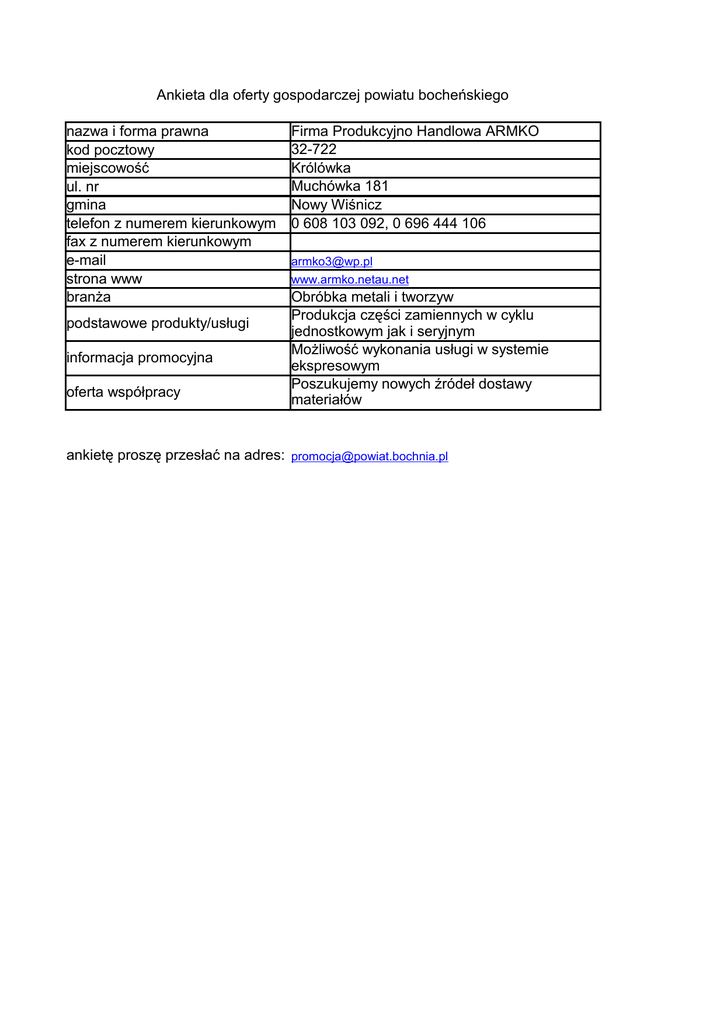Ankieta dla oferty gospodarczej powiatu bocheńskiego nazwa i forma prawna kod pocztowy miejscowość ul. nr gmina telefon z numerem kierunkowym fax z numerem kierunkowym e-mail strona www branża podstawowe produkty/usługi informacja promocyjna oferta współpracy Firma Produkcyjno Handlowa ARMKO 32-722 Królówka Muchówka 181 Nowy Wiśnicz 0 608 103 092, 0 696 444 106 [email protected] www.armko.netau.net Obróbka metali i tworzyw Produkcja części zamiennych w cyklu jednostkowym jak i seryjnym Możliwość wykonania usługi w systemie ekspresowym Poszukujemy nowych źródeł dostawy materiałów ankietę proszę przesłać na adres: [email protected] Ankieta dla oferty gospodarczej powiatu oświęcimskiego nazwa i forma prawna kod pocztowy miejscowość ul. nr gmina telefon z numerem kierunkowym fax z numerem kierunkowym e-mail strona www branża podstawowe produkty/usługi informacja promocyjna oferta współpracy ankietę proszę przesłać na adres: "Fenix" PPHU Spółka Cywilna 32-650 Kęty Bulwarowa 8 Kęty (033)854-33-51 (033)854-33-52 [email protected] www.fenix.pl budowlana, transportowa materiały budowlne, usługi budowlne, transport materiałów budowlanych Firma oferuje szeroki asortyment materiałów budowlanych, świadczy usługi budowy domów "pod klucz" oraz wykonuje drobne i kompleksowe remonty budynków. Upusty dla stałych klientów. Posiadam 200 m wolnej powierzchni magazynowej. Poszukuję dostawców stolarki budowlanej. Zatrudnię 10 murarzy do pracy sezonowej [email protected]