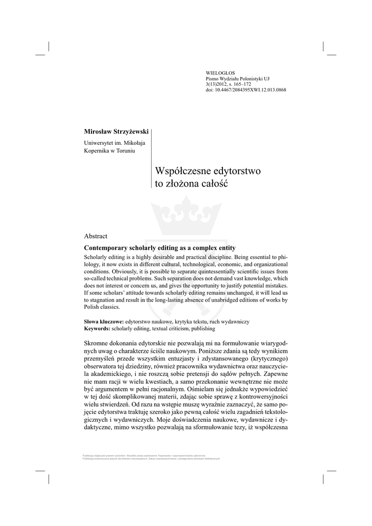 WIELOGŁOS Pismo Wydziału Polonistyki UJ 3(13)2012, s. 165–172 doi: 10.4467/2084395XWI.12.013.0868 Mirosław Strzyżewski Uniwersytet im. Mikołaja Kopernika w Toruniu Współczesne edytorstwo to złożona całość Abstract Contemporary scholarly editing as a complex entity Scholarly editing is a highly desirable and practical discipline. Being essential to philology, it now exists in different cultural, technological, economic, and organizational conditions. Obviously, it is possible to separate quintessentially scientific issues from so-called technical problems. Such separation does not demand vast knowledge, which does not interest or concern us, and gives the opportunity to justify potential mistakes. If some scholars’ attitude towards scholarly editing remains unchanged, it will lead us to stagnation and result in the long-lasting absence of unabridged editions of works by Polish classics. Słowa kluczowe: edytorstwo naukowe, krytyka tekstu, ruch wydawniczy Keywords: scholarly editing, textual criticism, publishing Skromne dokonania edytorskie nie pozwalają mi na formułowanie wiarygodnych uwag o charakterze ściśle naukowym. Poniższe zdania są tedy wynikiem przemyśleń przede wszystkim entuzjasty i zdystansowanego (krytycznego) obserwatora tej dziedziny, również pracownika wydawnictwa oraz nauczyciela akademickiego, i nie roszczą sobie pretensji do sądów pełnych. Zapewne nie mam racji w wielu kwestiach, a samo przekonanie wewnętrzne nie może być argumentem w pełni racjonalnym. Ośmielam się jednakże wypowiedzieć w tej dość skomplikowanej materii, zdając sobie sprawę z kontrowersyjności wielu stwierdzeń. Od razu na wstępie muszę wyraźnie zaznaczyć, że samo pojęcie edytorstwa traktuję szeroko jako pewną całość wielu zagadnień tekstologicznych i wydawniczych. Moje doświadczenia naukowe, wydawnicze i dydaktyczne, mimo wszystko pozwalają na sformułowanie tezy, iż współczesna Publikacja objęta jest prawem autorskim. Wszelkie prawa zastrzeżone. Kopiowanie i rozpowszechnianie zabronione. Publikacja przeznaczona jedynie dla klientów indywidualnych. Zakaz rozpowszechniania i udostępniania serwisach bibliotecznych 166 Mirosław Strzyżewski praca edytorska powinna wyglądać nieco inaczej (problem szerszy na osobne omówienie), a samo pojmowanie edytorstwa różnić się od tradycyjnego dwudzielnego rozumienia tej dyscypliny: jako krytyki tekstu, pozostającej pod kuratelą „naukowości”, oraz innych prac redakcyjno-wydawniczych, będących w gestii pracowników „nienaukowych”. Sądzę, że anachroniczne myślenie każące oddzielać te dwie sfery działalności praktycznej, jaką jest w swojej istocie edytorstwo, w sytuacji daleko idących przemian technologicznych jest jedną z ważniejszych przyczyn stosunkowo słabej pozycji naszej dziedziny na mapie współczesnej humanistyki. Kondycja naszego edytorstwa naukowego nie jest najlepsza. To stały lejtmotyw rozmaitych referatów konferencyjnych, wygłaszanych m.in. na zjazdach polonistów, który powtarzany jest bodaj od trzydziestu lat z okładem. Odnoszę wrażenie, że ta podstawowa dziedzina filologiczna ciągle musi dowodzić racji swojego istnienia, jakby interpretatorzy tekstów literackich zapomnieli, skąd sami się wywodzą, jakie są źródła ich zabiegów (a niekiedy zabaw) hermeneutycznych; nawet w gronie profesorów spotykam się niekiedy z ignorowaniem podstawowych zasad krytyki tekstu, co dowodzi nikłej świadomości tych podstawowych przecież zagadnień. Łatwo jednak formułować negatywny punkt odniesienia i narzekać na kiepską sytuację edytorstwa naukowego (krytyka wszelka i malkontenctwo to zresztą nasz wątpliwy przymiot narodowy), gorzej z formułowaniem pozytywnego programu. Ten bowiem wypracowuje się w toku codziennej, mozolnej, mało wdzięcznej i mało efektownej roboty. A ci, często znamienici autorzy, którzy tak łatwo formułowali niegdyś katastroficzne konstatacje, pojawiające się od czasu do czasu i dziś, nie potrafili odmienić istniejącego stanu rzeczy, także ich uczniowie niewiele wnoszą nowego ducha w istniejący stan rzeczy. Cierpimy chyba na pewien nadmiar dyskusji, deklaracji, podchodów personalnych czy humorystycznych parasportowych rywalizacji (najczęściej zresztą fantazmatycznych). Nie potrafimy jako środowisko pracować zespołowo, trudno nam zmienić przyzwyczajenia myślowe i archaiczne formy pracy, poluzować odziedziczone po naszych mistrzach sztywne ramy przygotowania podstaw tekstowych do druku, brak nam nowych teoretycznych refleksji, które w tej akurat dziedzinie humanistyki powinny iść zdecydowanie z duchem przemian technologicznych. Oczywiście można powiedzieć, że np. w zakresie edytorstwa tekstów staropolskich, dzięki konsekwentnej pracy zespołu nieodżałowanego Adama Karpińskiego, wzbogaciliśmy się o wcale pokaźną, znakomicie przygotowywaną Bibliotekę Pisarzy Staropolskich, a dzięki staraniom m.in. Jerzego Snopka i Tomasza Chachulskiego ukazują się tomy Biblioteki Pisarzy Polskiego Oświecenia, ale gdy spojrzymy na niedokończone, ciągnące się latami projekty edycji pisarzy dziewiętnasto- i dwudziestowiecznych, to obraz wyników pracy edytorów jawi się raczej żałośnie (wszak po konkretnych i pełnych rezultatach należy oceniać zamierzenia, a nie po pięknych introdukcjach). Sądzę, że należy wydać na nowo całą klasykę polskiej literatury dziewiętnastowiecznej, nowe pokolenia tracą bowiem kontakt z kulturalną tradycją Publikacja objęta jest prawem autorskim. Wszelkie prawa zastrzeżone. Kopiowanie i rozpowszechnianie zabronione. Publikacja przeznaczona jedynie dla klientów indywidualnych. Zakaz rozpowszechniania i udostępniania serwisach bibliotecznych
