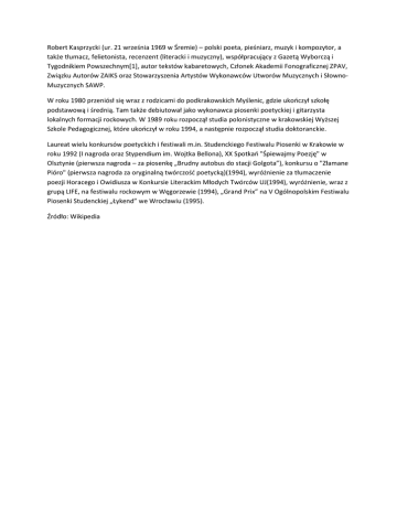 Robert Kasprzycki (ur. 21 września 1969 w Śremie) – polski poeta, pieśniarz, muzyk i kompozytor, a także tłumacz, felietonista, recenzent (literacki i muzyczny), współpracujący z Gazetą Wyborczą i Tygodnikiem Powszechnym*1+, autor tekstów kabaretowych, Członek Akademii Fonograficznej ZPAV, Związku Autorów ZAIKS oraz Stowarzyszenia Artystów Wykonawców Utworów Muzycznych i SłownoMuzycznych SAWP. W roku 1980 przeniósł się wraz z rodzicami do podkrakowskich Myślenic, gdzie ukooczył szkołę podstawową i średnią. Tam także debiutował jako wykonawca piosenki poetyckiej i gitarzysta lokalnych formacji rockowych. W 1989 roku rozpoczął studia polonistyczne w krakowskiej Wyższej Szkole Pedagogicznej, które ukooczył w roku 1994, a następnie rozpoczął studia doktoranckie. Laureat wielu konkursów poetyckich i festiwali m.in. Studenckiego Festiwalu Piosenki w Krakowie w roku 1992 (I nagroda oraz Stypendium im. Wojtka Bellona), XX Spotkao "Śpiewajmy Poezję" w Olsztynie (pierwsza nagroda – za piosenkę „Brudny autobus do stacji Golgota”), konkursu o "Złamane Pióro" (pierwsza nagroda za oryginalną twórczośd poetycką)(1994), wyróżnienie za tłumaczenie poezji Horacego i Owidiusza w Konkursie Literackim Młodych Twórców UJ(1994), wyróżnienie, wraz z grupą LIFE, na festiwalu rockowym w Węgorzewie (1994), „Grand Prix” na V Ogólnopolskim Festiwalu Piosenki Studenckiej „Łykend” we Wrocławiu (1995). Źródło: Wikipedia