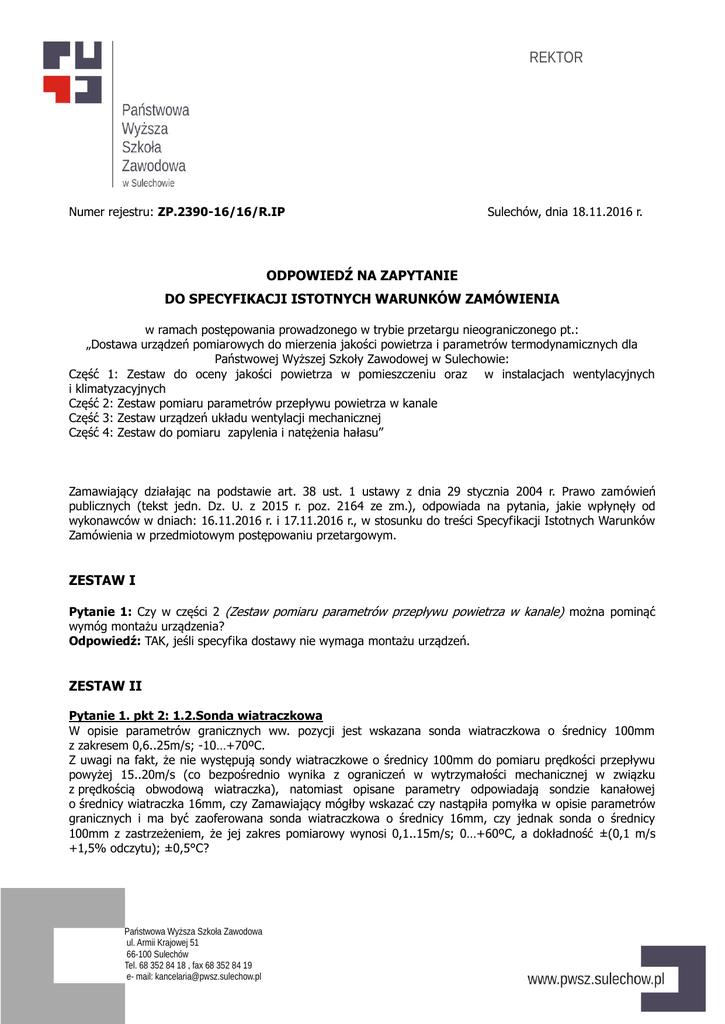 REKTOR Numer rejestru: ZP.2390-16/16/R.IP Sulechów, dnia 18.11.2016 r. ODPOWIEDŹ NA ZAPYTANIE DO SPECYFIKACJI ISTOTNYCH WARUNKÓW ZAMÓWIENIA w ramach postępowania prowadzonego w trybie przetargu nieograniczonego pt.: „Dostawa urządzeń pomiarowych do mierzenia jakości powietrza i parametrów termodynamicznych dla Państwowej Wyższej Szkoły Zawodowej w Sulechowie: Część 1: Zestaw do oceny jakości powietrza w pomieszczeniu oraz w instalacjach wentylacyjnych i klimatyzacyjnych Część 2: Zestaw pomiaru parametrów przepływu powietrza w kanale Część 3: Zestaw urządzeń układu wentylacji mechanicznej Część 4: Zestaw do pomiaru zapylenia i natężenia hałasu” Zamawiający działając na podstawie art. 38 ust. 1 ustawy z dnia 29 stycznia 2004 r. Prawo zamówień publicznych (tekst jedn. Dz. U. z 2015 r. poz. 2164 ze zm.), odpowiada na pytania, jakie wpłynęły od wykonawców w dniach: 16.11.2016 r. i 17.11.2016 r., w stosunku do treści Specyfikacji Istotnych Warunków Zamówienia w przedmiotowym postępowaniu przetargowym. ZESTAW I Pytanie 1: Czy w części 2 (Zestaw pomiaru parametrów przepływu powietrza w kanale) można pominąć wymóg montażu urządzenia? Odpowiedź: TAK, jeśli specyfika dostawy nie wymaga montażu urządzeń. ZESTAW II Pytanie 1. pkt 2: 1.2.Sonda wiatraczkowa W opisie parametrów granicznych ww. pozycji jest wskazana sonda wiatraczkowa o średnicy 100mm z zakresem 0,6..25m/s; -10…+70ºC. Z uwagi na fakt, że nie występują sondy wiatraczkowe o średnicy 100mm do pomiaru prędkości przepływu powyżej 15..20m/s (co bezpośrednio wynika z ograniczeń w wytrzymałości mechanicznej w związku z prędkością obwodową wiatraczka), natomiast opisane parametry odpowiadają sondzie kanałowej o średnicy wiatraczka 16mm, czy Zamawiający mógłby wskazać czy nastąpiła pomyłka w opisie parametrów granicznych i ma być zaoferowana sonda wiatraczkowa o średnicy 16mm, czy jednak sonda o średnicy 100mm z zastrzeżeniem, że jej zakres pomiarowy wynosi 0,1..15m/s; 0…+60ºC, a dokładność ±(0,1 m/s +1,5% odczytu); ±0,5°C? Państwowa Wyższa Szkoła Zawodowa ul. Armii Krajowej 51 66-100 Sulechów Tel. 68 352 84 18 , fax 68 352 84 19 e- mail: [email protected] REKTOR Odpowiedź: Zamawiający dopuszcza dla: sondy wiatraczkowej o średnicy 100 mm następujące parametry i zakresy pomiarowe: - prędkość przepływu 0,1..15m/s; 0…+60ºC, dokładność ±(0,1 m/s +1,5% odczytu); ±0,5°C? Pytanie 2. pkt 3: 1.3. Sonda pomiaru wilgotności i temperatury W opisie parametrów granicznych ww. pozycji jest: „dokładność 1%”. Czy Zamawiający dopuszcza zaoferowanie sondy cyfrowej o zakresie pomiarowym 0..100% wilg. wzg. oraz dokładności: ±(1,0 % wilg.wzgl. + 0,7% odczytu) 0 do 90 % wilg.wzgl.; ±(1,4 % wilg.wzgl. + 0,7% mierz. wart.) 90 do 100 % wilg.wzgl.)? Powyższa dokładność, z uwagi na technologię cyfrową sondy, odnosi się do całego toru pomiarowego łącznie z miernikiem. Odpowiedź: Zamawiający dopuszcza dla: Sondy pomiaru wilgotności i temperatury poniższe zakresy pomiarowe i dokładność: - wilgotność: 0..100% wilg. wzg. oraz dokładności: ±(1,0 % wilg.wzgl. + 0,7% odczytu) 0 do 90 % wilg.wzgl.; ±(1,4 % wilg.wzgl. + 0,7% mierz. wart.) 90 do 100 % wilg.wzgl. Pytanie 3. pkt 4: 1.4. Termiczna sonda pomiaru przepływu (prędkość, temperatura) W opisie parametrów granicznych ww. pozycji jest zakres pomiarowy „ - prędkość przepływu: od ,15…20m/s, dokładność ±(0,3 + 5% odczytu)” Czy Zamawiający dopuszcza zaoferowanie sondy cyfrowej o zakresie pomiarowym 0..20m/s oraz dokładności ±(0,03 m/s +5% mierz. wart.)? Odpowiedź: Zamawiający dopuszcza dla: Termiczna sonda pomiaru przepływu (prędkość, temperatura) poniższe zakresy pomiarowe i dokładność: - prędkość przepływu 0..20m/s oraz dokładności ±(0,03 m/s +5% mierz. wart.) Pytanie 4. pkt 5: Sonda cyfrowa, kompaktowa do pomiaru jakości powietrza w kanale wentylacyjnym: W opisie parametrów granicznych ww. pozycji jest: „Pomiar zintegrowany: dwutlenek węgla CO2 , temperatura, wilgotność, ciśnienie absolutne ” Jednocześnie w opisie zakresów pomiarowych pojawia się dodatkowy parametr jakim jest „ różnica ciśnień 100 …+100hPa”. Czy Zamawiający nie popełnił błędu podając w opisie różnicy ciśnień odnoszący się do ww. sondy? Informujemy, że pomiar różnicy ciśnień (-100…+100 hPa) jest zintegrowany w mierniku poz.1 załącznika nr 1a W opisie parametrów granicznych ww. pozycji jest: „stężenie dwutlenku węgla CO2 : od 0 ….. +5 000 ppm CO2, dokładność ± (50ppm CO2 ± 3%m.w. odczytu) dla od 0 do + 5 000ppm CO2” Państwowa Wyższa Szkoła Zawodowa ul. Armii Krajowej 51 66-100 Sulechów Tel. 68 352 84 18 , fax 68 352 84 19 e- mail: [email protected] REKTOR Czy Zamawiający dopuszcza zaoferowanie sondy cyfrowej o zakresie pomiarowym 0…10000 ppm CO2 oraz dokładności ±(75 ppm CO2 +3 % mierz. wart.) 0 do +5000 ppm CO2; ±(150 ppm CO2 +5 % mierz. wart.) 5001 do +10000 ppm CO2)? Odpowiedź: Zamawiający dopuszcza dla pozycji: Sonda cyfrowa, kompaktowa do pomiaru jakości powietrza w kanale wentylacyjnym poniższy zakres pomiarowy i dokładność oraz brak pomiaru różnicy ciśnień: - stężenie CO2: 0…10000 ppm CO2 oraz dokładności ±(75 ppm CO2 +3 % mierz. wart.) 0 do +5000 ppm CO2; ±(150 ppm CO2 +5 % mierz. wart.) 5001 do +10000 ppm CO2 oraz - bez pomiaru różnicy ciśnień (-100…+100 hPa) PROREKTOR /--/ z up. dr inż. Stanisław Pryputniewicz Państwowa Wyższa Szkoła Zawodowa ul. Armii Krajowej 51 66-100 Sulechów Tel. 68 352 84 18 , fax 68 352 84 19 e- mail: [email protected]