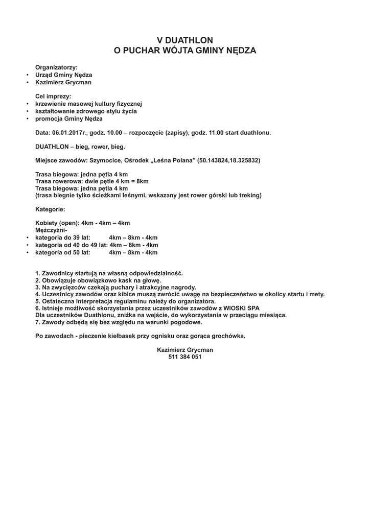 V DUATHLON O PUCHAR WÓJTA GMINY NĘDZA • • Organizatorzy: Urząd Gminy Nędza Kazimierz Grycman • • • Cel imprezy: krzewienie masowej kultury fizycznej kształtowanie zdrowego stylu życia promocja Gminy Nędza Data: 06.01.2017r., godz. 10.00 – rozpoczęcie (zapisy), godz. 11.00 start duathlonu. DUATHLON – bieg, rower, bieg. Miejsce zawodów: Szymocice, Ośrodek „Leśna Polana” (50.143824,18.325832) Trasa biegowa: jedna pętla 4 km Trasa rowerowa: dwie pętle 4 km = 8km Trasa biegowa: jedna pętla 4 km (trasa biegnie tylko ścieżkami leśnymi, wskazany jest rower górski lub treking) Kategorie: • • • Kobiety (open): 4km - 4km – 4km Mężczyźnikategoria do 39 lat: 4km – 8km - 4km kategoria od 40 do 49 lat: 4km – 8km - 4km kategoria od 50 lat: 4km – 8km - 4km 1. Zawodnicy startują na własną odpowiedzialność. 2. Obowiązuje obowiązkowo kask na głowę. 3. Na zwycięzców czekają puchary i atrakcyjne nagrody. 4. Uczestnicy zawodów oraz kibice muszą zwrócić uwagę na bezpieczeństwo w okolicy startu i mety. 5. Ostateczna interpretacja regulaminu należy do organizatora. 6. Istnieje możliwość skorzystania przez uczestników zawodów z WIOSKI SPA Dla uczestników Duathlonu, zniżka na wejście, do wykorzystania w przeciągu miesiąca. 7. Zawody odbędą się bez względu na warunki pogodowe. Po zawodach - pieczenie kiełbasek przy ognisku oraz gorąca grochówka. Kazimierz Grycman 511 384 051