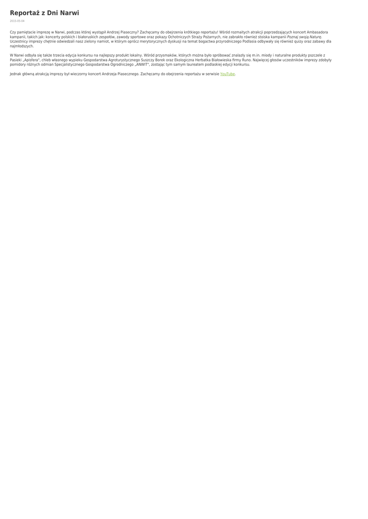 Reportaż z Dni Narwi 2015-05-04 Czy pamiętacie imprezę w Narwi, podczas której wystąpił Andrzej Piaseczny? Zachęcamy do obejrzenia krótkiego reportażu! Wśród rozmaitych atrakcji poprzedzających koncert Ambasadora kampanii, takich jak: koncerty polskich i białoruskich zespołów, zawody sportowe oraz pokazy Ochotniczych Straży Pożarnych, nie zabrakło również stoiska kampanii Poznaj swoją Naturę. Uczestnicy imprezy chętnie odwiedzali nasz zielony namiot, w którym oprócz merytorycznych dyskusji na temat bogactwa przyrodniczego Podlasia odbywały się również quizy oraz zabawy dla najmłodszych. W Narwi odbyła się także trzecia edycja konkursu na najlepszy produkt lokalny. Wśród przysmaków, których można było spróbować znalazły się m.in. miody i naturalne produkty pszczele z Pasieki „Apisfera", chleb własnego wypieku Gospodarstwa Agroturystycznego Suszczy Borek oraz Ekologiczna Herbatka Białowieska firmy Runo. Najwięcej głosów uczestników imprezy zdobyły pomidory różnych odmian Specjalistycznego Gospodarstwa Ogrodniczego „ANWIT", zostając tym samym laureatem podlaskiej edycji konkursu. Jednak główną atrakcją imprezy był wieczorny koncert Andrzeja Piasecznego. Zachęcamy do obejrzenia reportażu w serwisie YouTube.