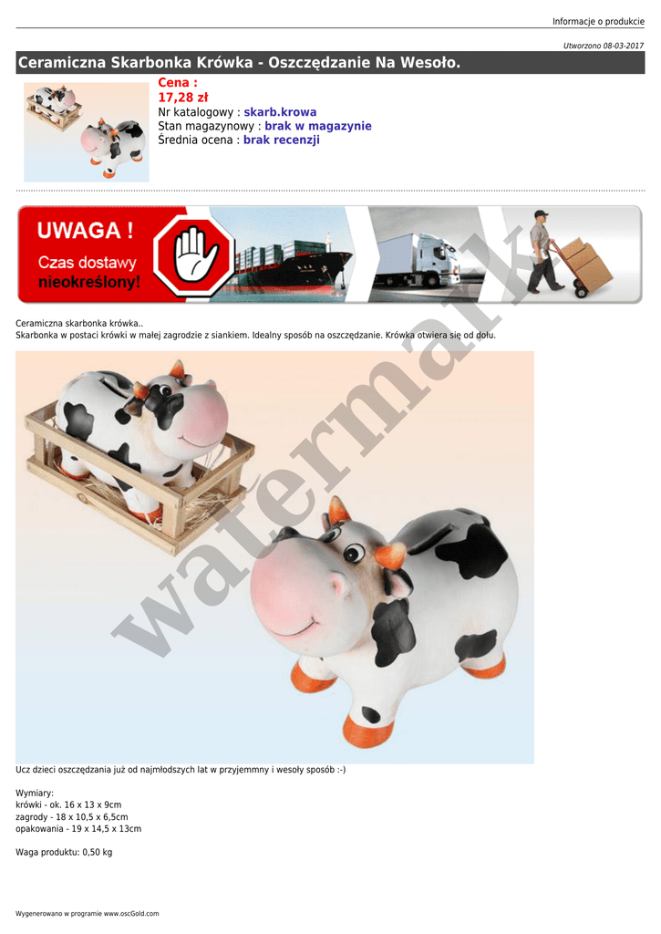 Informacje o produkcie Utworzono 08-03-2017 Ceramiczna Skarbonka Krówka - Oszczędzanie Na Wesoło. Cena : 17,28 zł er m ar k Nr katalogowy : skarb.krowa Stan magazynowy : brak w magazynie Średnia ocena : brak recenzji w at Ceramiczna skarbonka krówka.. Skarbonka w postaci krówki w małej zagrodzie z siankiem. Idealny sposób na oszczędzanie. Krówka otwiera się od dołu. Ucz dzieci oszczędzania już od najmłodszych lat w przyjemmny i wesoły sposób :-) Wymiary: krówki - ok. 16 x 13 x 9cm zagrody - 18 x 10,5 x 6,5cm opakowania - 19 x 14,5 x 13cm Waga produktu: 0,50 kg Wygenerowano w programie www.oscGold.com er m ar k at w