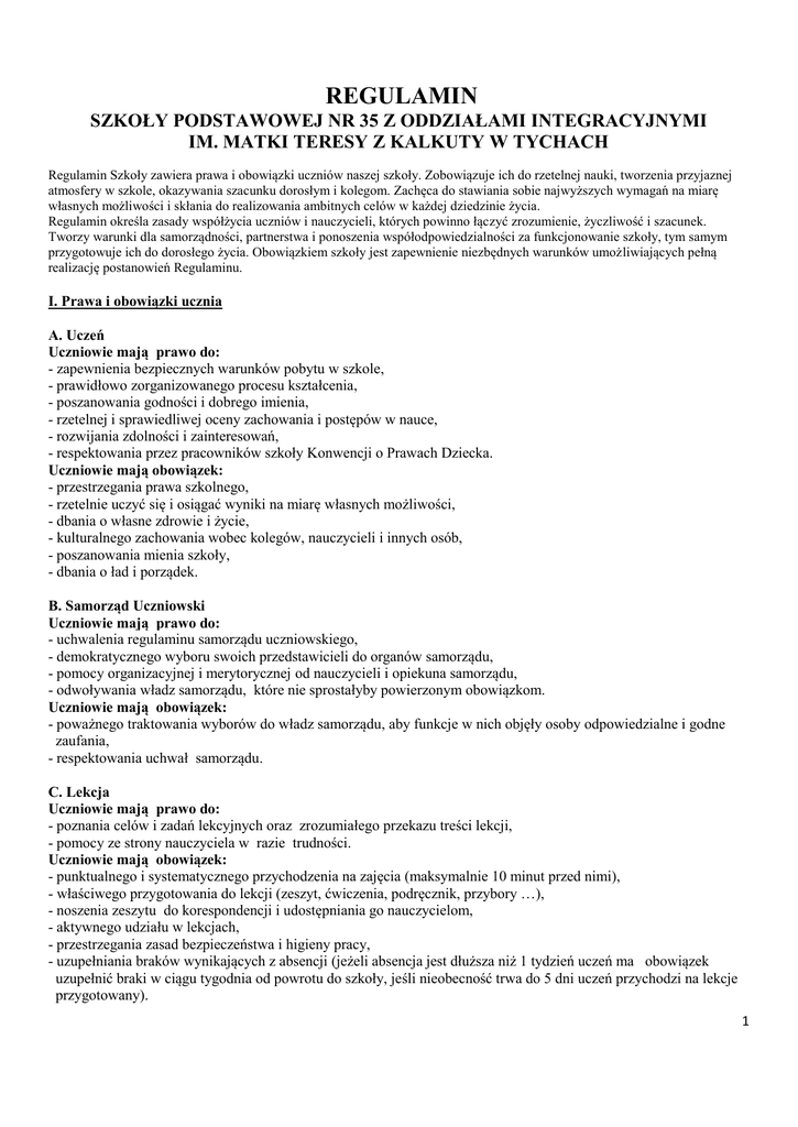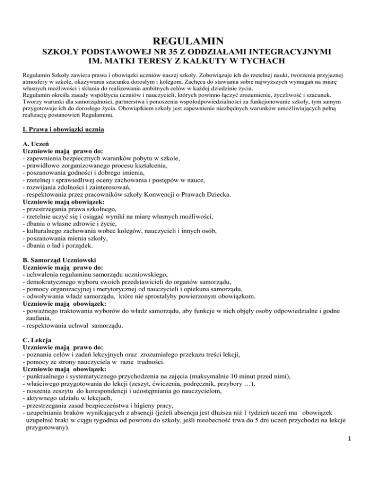 REGULAMIN SZKOŁY PODSTAWOWEJ NR 35 Z ODDZIAŁAMI INTEGRACYJNYMI IM. MATKI TERESY Z KALKUTY W TYCHACH Regulamin Szkoły zawiera prawa i obowiązki uczniów naszej szkoły. Zobowiązuje ich do rzetelnej nauki, tworzenia przyjaznej atmosfery w szkole, okazywania szacunku dorosłym i kolegom. Zachęca do stawiania sobie najwyższych wymagań na miarę własnych możliwości i skłania do realizowania ambitnych celów w każdej dziedzinie życia. Regulamin określa zasady współżycia uczniów i nauczycieli, których powinno łączyć zrozumienie, życzliwość i szacunek. Tworzy warunki dla samorządności, partnerstwa i ponoszenia współodpowiedzialności za funkcjonowanie szkoły, tym samym przygotowuje ich do dorosłego życia. Obowiązkiem szkoły jest zapewnienie niezbędnych warunków umożliwiających pełną realizację postanowień Regulaminu. I. Prawa i obowiązki ucznia A. Uczeń Uczniowie mają prawo do: - zapewnienia bezpiecznych warunków pobytu w szkole, - prawidłowo zorganizowanego procesu kształcenia, - poszanowania godności i dobrego imienia, - rzetelnej i sprawiedliwej oceny zachowania i postępów w nauce, - rozwijania zdolności i zainteresowań, - respektowania przez pracowników szkoły Konwencji o Prawach Dziecka. Uczniowie mają obowiązek: - przestrzegania prawa szkolnego, - rzetelnie uczyć się i osiągać wyniki na miarę własnych możliwości, - dbania o własne zdrowie i życie, - kulturalnego zachowania wobec kolegów, nauczycieli i innych osób, - poszanowania mienia szkoły, - dbania o ład i porządek. B. Samorząd Uczniowski Uczniowie mają prawo do: - uchwalenia regulaminu samorządu uczniowskiego, - demokratycznego wyboru swoich przedstawicieli do organów samorządu, - pomocy organizacyjnej i merytorycznej od nauczycieli i opiekuna samorządu, - odwoływania władz samorządu, które nie sprostałyby powierzonym obowiązkom. Uczniowie mają obowiązek: - poważnego traktowania wyborów do władz samorządu, aby funkcje w nich objęły osoby odpowiedzialne i godne zaufania, - respektowania uchwał samorządu. C. Lekcja Uczniowie mają prawo do: - poznania celów i zadań lekcyjnych oraz zrozumiałego przekazu treści lekcji, - pomocy ze strony nauczyciela w razie trudności. Uczniowie mają obowiązek: - punktualnego i systematycznego przychodzenia na zajęcia (maksymalnie 10 minut przed nimi), - właściwego przygotowania do lekcji (zeszyt, ćwiczenia, podręcznik, przybory …), - noszenia zeszytu do korespondencji i udostępniania go nauczycielom, - aktywnego udziału w lekcjach, - przestrzegania zasad bezpieczeństwa i higieny pracy, - uzupełniania braków wynikających z absencji (jeżeli absencja jest dłuższa niż 1 tydzień uczeń ma obowiązek uzupełnić braki w ciągu tygodnia od powrotu do szkoły, jeśli nieobecność trwa do 5 dni uczeń przychodzi na lekcje przygotowany). 1 D. Sala lekcyjna Uczniowie mają prawo do: - udziału w zagospodarowaniu powierzonej im sali lekcyjnej według własnego projektu po uzgodnieniu z wychowawcą, - kontrolowania porządku zostawionego w sali przez wcześniej uczącą się tam klasę. Uczniowie mają obowiązek: - pozostawiania sali lekcyjnej w nienagannym porządku, - dbania o powierzony sprzęt i pomoce dydaktyczne, - niezwłocznego zgłaszania nauczycielowi wszelkich uszkodzeń sprzętu lub pomocy dydaktycznych. E. Odpoczynek, przerwy międzylekcyjne Uczniowie maja prawo do: - odpoczynku podczas przerw, - dwóch dni w tygodniu wolnych od zajęć lekcyjnych tj. soboty i niedzieli, z wyłączeniem tych sobót, w które są odpracowywane inne dni robocze. Uczniowie w czasie przerwy mają obowiązek: - przestrzegania zasad bezpieczeństwa i higieny na korytarzach, w toaletach, w szatni oraz w czasie korzystania z placu zabaw i obiektów sportowych, - o ile pozwala pogoda (na wymienionych przerwach:11.20-11.30, 12.15-12.30, 13.15-13.25) przebywać na terenie obiektów sportowych ( plac zabaw, boiska szkolne) pod opieką nauczycieli dyżurujących, - przebywania na korytarzach przy salach, w których będą mieli aktualnie lekcje, - zgłaszania nauczycielowi dyżurującemu o każdym wypadku oraz sytuacji zagrażającej zdrowiu lub życiu - przestrzegania zasad obowiązujących w „Strefie ciszy” (obok szatni) F. Prace domowe Uczniowie maja prawo do: - uwzględniania przez nauczycieli ich psychicznych i fizycznych możliwości, - wyjaśnienia przez nauczyciela, jak wykonywać zadania domowe. Uczniowie mają obowiązek: - starannie i sumiennie odrabiać prace domowe, - kształtowania nawyku odrabiania prac domowych w tym dniu, w którym zostały zadane. G. Zeszyt przedmiotowy Uczniowie mają prawo do: - ukierunkowania przez nauczyciela, jak należy prowadzić zeszyt. Uczniowie mają obowiązek: - starannego prowadzenia zeszytów zgodnie z wymaganiami nauczycieli. H. Zasady ustalania ocen z przedmiotów i oceny zachowania określa Wewnątrzszkolny System Oceniania II. Reguły współżycia w szkole A. Procedury lekcyjne 1. Wejście do klasy: - uczniowie ustawiają się przed klasą parami , - klasę otwiera nauczyciel, - do klasy wchodzą kolejno: nauczyciel, dziewczęta, później chłopcy, - uczniowie stają przy ławkach, następuje powitanie, - uczniowie przygotowują się do lekcji, - nauczyciel sprawdza obecność, - uczeń spóźniony, siada w ławce, a usprawiedliwia się po zakończeniu lekcji. 2 2. Zachowanie w czasie lekcji: - uczeń odpowiada siedząc w ławce, chyba, że istnieje powód do wezwania go do tablicy, mapy itp., - uczeń nie je, nie pije, nie żuje gumy, nie chodzi po klasie, - na ławce leżą przedmioty niezbędne do danej lekcji , - uczeń ma wyłączony telefon komórkowy i schowany w torbie sprzęt elektroniczny, - jeżeli do klasy wchodzi osoba dorosła wszyscy uczniowie wstają, - uczniowie przestrzegają zasad obowiązujących w czasie lekcji (lista zasad znajduje się w każdej sali lekcyjnej). 3. Zakończenie lekcji: - lekcja kończy się na wyraźny znak nauczyciel