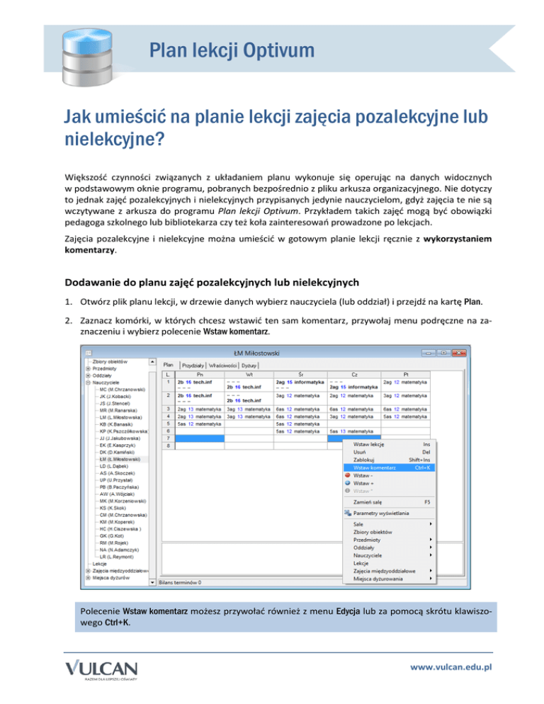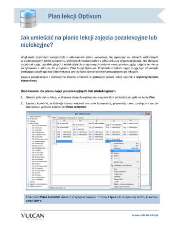 Plan lekcji Optivum Jak umieścić na planie lekcji zajęcia pozalekcyjne lub nielekcyjne? Większość czynności związanych z układaniem planu wykonuje się operując na danych widocznych w podstawowym oknie programu, pobranych bezpośrednio z pliku arkusza organizacyjnego. Nie dotyczy to jednak zajęć pozalekcyjnych i nielekcyjnych przypisanych jedynie nauczycielom, gdyż zajęcia te nie są wczytywane z arkusza do programu Plan lekcji Optivum. Przykładem takich zajęć mogą być obowiązki pedagoga szkolnego lub bibliotekarza czy też koła zainteresowań prowadzone po lekcjach. Zajęcia pozalekcyjne i nielekcyjne można umieścić w gotowym planie lekcji ręcznie z wykorzystaniem komentarzy. Dodawanie do planu zajęć pozalekcyjnych lub nielekcyjnych 1. Otwórz plik planu lekcji, w drzewie danych wybierz nauczyciela (lub oddział) i przejdź na kartę Plan. 2. Zaznacz komórki, w których chcesz wstawić ten sam komentarz, przywołaj menu podręczne na zaznaczeniu i wybierz polecenie Wstaw komentarz. Polecenie Wstaw komentarz możesz przywołać również z menu Edycja lub za pomocą skrótu klawiszowego Ctrl+K. www.vulcan.edu.pl Plan lekcji Optivum. Jak umieścić na planie lekcji zajęcia pozalekcyjne lub nielekcyjne? 2/4 3. W oknie Blokada z komentarzem wpisz komentarz opisujący zajęcia i kliknij przycisk OK. W planie nauczyciela (lub oddziału) pojawi się komentarz jako tekst przekreślony (w celu odróżnienia od zajęć lekcyjnych). Komentarze nie poszerzają kolumn w oknie Plan, drukują się jednak w całości i bez przekreślenia. Komentarze stanowią również blokadę terminu. Z wykorzystaniem komentarzy można wprowadzić plan zajęć pedagoga czy bibliotekarza. Drukowanie planów z komentarzami Aby na wydrukach pojawiły się wprowadzone komentarze, należy w parametrach wydruku włączyć opcje drukowania komentarzy. 1. W menu Plik wybierz polecenie Drukuj (lub skorzystaj z ikony okno Drukowanie. na pasku narzędzi) – wyświetli się 2. Określ typ i obiekt wydruku. W sekcji Kolumny/ [obiekt] wybierz informacje, które powinny znaleźć się na planie obiektu. 3. Określ ostateczną postać wydruku, zaznaczając wybrane opcje w sekcji Parametry. Aby wydrukować komentarze, zaznacz opcję komentarze. www.vulcan.edu.pl Plan lekcji Optivum. Jak umieścić na planie lekcji zajęcia pozalekcyjne lub nielekcyjne? 3/4 4. Kliknij przycisk Podgląd i obejrzyj wydruk, a następnie skieruj go na drukarkę. Publikowanie planów z komentarzami Komentarze mogą pojawiać się również w planie publikowanym w Internecie. W tym celu należy w oknie Zapisz jako stronę sieci Web (przywoływanym za pomocą polecenia Plik/ Opublikuj plan), na karcie Schemat HTML zaznaczyć opcję Komentarze. www.vulcan.edu.pl Plan lekcji Optivum. Jak umieścić na planie lekcji zajęcia pozalekcyjne lub nielekcyjne? 4/4 www.vulcan.edu.pl
