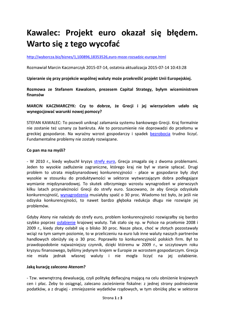 Kawalec: Projekt euro okazał się błędem. Warto się z tego wycofać http://wyborcza.biz/biznes/1,100896,18353526,euro-moze-rozsadzic-europe.html Rozmawiał Marcin Kaczmarczyk 2015-07-14, ostatnia aktualizacja 2015-07-14 10:43:28 Upieranie się przy projekcie wspólnej waluty może przekreślić projekt Unii Europejskiej. Rozmowa ze Stefanem Kawalcem, prezesem Capital Strategy, byłym wiceministrem finansów MARCIN KACZMARCZYK: Czy to dobrze, że Grecji i jej wierzycielom udało się wynegocjować warunki nowej pomocy? STEFAN KAWALEC: To pozwoli uniknąć załamania systemu bankowego Grecji. Kraj formalnie nie zostanie też uznany za bankruta. Ale to porozumienie nie doprowadzi do przełomu w greckiej gospodarce. Na wyraźny wzrost gospodarczy i spadek bezrobocia trudno liczyć. Fundamentalne problemy nie zostały rozwiązane. Co pan ma na myśli? - W 2010 r., kiedy wybuchł kryzys strefy euro, Grecja zmagała się z dwoma problemami. Jeden to wysokie zadłużenie zagraniczne, którego kraj nie był w stanie spłacać. Drugi problem to utrata międzynarodowej konkurencyjności - płace w gospodarce były zbyt wysokie w stosunku do produktywności w sektorze wytwarzającym dobra podlegające wymianie międzynarodowej. To skutek olbrzymiego wzrostu wynagrodzeń w pierwszych kilku latach przynależności Grecji do strefy euro. Szacowano, że aby Grecja odzyskała konkurencyjność, wynagrodzenia musiałyby spaść o 30 proc. Wiadomo też było, że jeśli nie odzyska konkurencyjności, to nawet bardzo głęboka redukcja długu nie rozwiąże jej problemów. Gdyby Ateny nie należały do strefy euro, problem konkurencyjności rozwiązałby się bardzo szybko poprzez osłabienie krajowej waluty. Tak stało się np. w Polsce na przełomie 2008 i 2009 r., kiedy złoty osłabił się o blisko 30 proc. Nasze płace, choć w złotych pozostawały wciąż na tym samym poziomie, to w przeliczeniu na euro lub inne waluty naszych partnerów handlowych obniżyły się o 30 proc. Poprawiło to konkurencyjność polskich firm. Był to prawdopodobnie najważniejszy czynnik, dzięki któremu w 2009 r., w szczytowym roku kryzysu finansowego, byliśmy jedynym krajem w Europie ze wzrostem gospodarczym. Grecja nie miała jednak własnej waluty i nie mogła liczyć na jej osłabienie. Jaką kurację zalecono Atenom? - Tzw. wewnętrzną dewaluację, czyli politykę deflacyjną mającą na celu obniżenie krajowych cen i płac. Żeby to osiągnąć, zalecano zacieśnienie fiskalne: z jednej strony podniesienie podatków, a z drugiej - zmniejszenie wydatków rządowych, w tym obniżkę płac w sektorze Strona 1 z 3 budżetowym i emerytur. Zakładano, że dzięki temu spadnie popyt w gospodarce, co wymusi obniżki płac w przedsiębiorstwach, przywracając Grecji międzynarodową konkurencyjność. Taką politykę zalecano we wszystkich krajach strefy euro, które gdy wybuchł kryzys globalny, wpadły w kłopoty. Te działania były skuteczne? - Sprawdziły się niestety najbardziej pesymistyczne oczekiwania. W Grecji, mimo ograniczenia popytu w gospodarce i spadku PKB o ponad jedną czwartą w 2014 r. w porównaniu do 2007 r., poziom płac w przedsiębiorstwach obniżył się nieznacznie. Nie jest to zaskoczenie, gdyż ekonomiści od kilkudziesięciu lat zwracają uwagę, że we współczesnej gospodarce, gdy spada popyt, firmy redukują zatrudnienie, a nominalne obniżki płac są rzadkością. Od roku 2007 do roku 2014 bezrobocie w Grecji zwiększyło się o 18 pkt proc., osiągając około 27 proc. Udało się zlikwidować deficyt na rachunku obrotów bieżących, ale nie jest to efekt poprawy konkurencyjności gospodarki, lecz skutek zduszenia popytu i obniżenia PKB. Grecja nie odzyskała konkurencyjności. Dodatkowe miliardy euro obiecane Grekom na stymulację ich gospodarki nie pomogą? - Transfery nie są skuteczną metodą poprawy konkurencyjności. Byłe Niemcy Wschodnie po zjednoczeniu otrzymywały rocznie średnio jedną czwartą swojego PKB z Niemiec Zachodnich. Nie poprawiło to konkurencyjności na terenach byłej NRD. Napływ pieniędzy z zewnątrz do krajów lub regionów, które próbują drogą wewnętrznej dewaluacji poprawić swoją konkurencyjność, jest wręcz szkodliwy. Sprzyja wzrostowi płac, co utrudnia odzyskanie konkurencyjności. Ale w Hiszpanii lub w Portugalii mimo wszystko jest lepiej, a przecież tam prowadzona jest podobna polityka gospodarcza jak w Grecji. - Jest lepiej niż w Grecji, lecz sytuacja w tych krajach jest również nie do pozazdroszczenia. W 2014 r., po kilku latach recesji, gospodarka Hiszpanii odnotowała wzrost, kraj osiągnął też nadwyżkę na rachunku obrotów bieżących. Jednakże PKB w 2014 r. było na poziomie tylko 95 proc. PKB z 2007 r., a dla porównania w Polsce wskaźnik ten wynosi 124 proc. W tym czasie bezrobocie w Hiszpanii wzrosło o 16 pkt proc. i w 2014 r. wynosiło 24 proc. Raport MFW zwraca uwagę, że mimo sześciu lat kryzysu płace w Hiszpanii okazały się sztywne. Płace realne nie spadły w porównaniu z 2007 r. i dostosowanie gospodarki nastąpiło przede wszystkim przez spadek zatrudnienia. Jakie mogą być konsekwencje tych procesów? - To zależy od wydarzeń politycznych, które są bardzo trudne do przewidzenia. W dwudziestoleciu międzywojennym deflacyjna polityka gospodarcza, podobna do teraz realizowanej, prowadziła do silnych wstrząsów politycznych. W Niemczech prowadzono ją aż do chwili, gdy Hitler doszedł do władzy. Obecnie bezrobocie w niektórych krajach Południa jest jak w Europie w latach 30. We Włoszech, w Hiszpanii i we Francji działają już i są coraz Strona 2 z 3 silniejsze partie eurosceptyczne, populistyczne i nacjonalistyczne, które rosną w siłę dzięki polityce deflacyjnej. Polityka może rozsadzić Europę. I będzie to tym gwałtowniejsze, im dłużej prowadzona będzie polityka obrony euro za wszelką cenę. Projekt euro okazał się fiaskiem? - Tak, mimo najlepszych intencji okazał się 