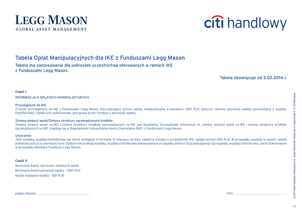 Tabela Opłat Manipulacyjnych dla IKE z Funduszami Legg Mason Tabela ma zastosowanie dla jednostek uczestnictwa oferowanych w ramach IKE z Funduszami Legg Mason. Część I INFORMACJA O OPŁATACH MANIPULACYJNYCH: Przystąpienie do IKE Z tytułu przystąpienia do IKE z Funduszami Legg Mason Oszczędzający ponosi opłatę manipulacyjną w wysokości 400 PLN (dotyczy również pierwszej wpłaty pochodzącej z wypłaty transferowej). Opłata jest jednorazowa, potrącana przez Fundusz z pierwszej wpłaty. Zmiana alokacji wpłat/Zmiana struktury zgromadzonych środków Zmiana alokacji wpłat na IKE i zmiana struktury środków zgromadzonych na IKE jest bezpłatna. Szczegółowe informacje nt. zmiany alokacji wpłat na IKE i zmiany struktury środków zgromadzonych na IKE znajdują się w Regulaminie Indywidualne Konto Emerytalne (IKE) z Funduszami Legg Mason. Umorzenie Jeśli wypłata, wypłata transferowa lub zwrot następuje w terminie 12 miesięcy od daty zawarcia Umowy o prowadzenie IKE, opłata wynosi 200 PLN. W przypadku wypłaty w ratach, opłata pobierana jest przy pierwszej racie. Opłacie nie podlega wypłata, wypłata transferowa dokonywana w przypadku śmierci Oszczędzającego lub wypłata, wypłata transferowa, zwrot dokonywane w przypadku likwidacji Funduszu Legg Mason. Część II Minimalne kwoty pierwszej i kolejnych wpłat: Minimalna kwota pierwszej wpłaty – 500 PLN Każda następna wpłata – 100 PLN podpis Klienta ....................................................................................................... (SV) ....................................................................................................... 02.2014 Bank Handlowy w Warszawie S.A., Sektor Bankowości Detalicznej, ul. Goleszowska 6, 01-249 Warszawa Tabela obowiązuje od 3.02.2014 r. 1/2 OPŁATA ZA ZARZĄDZANIE W SKALI ROKU OPŁATA ZA ZARZĄDZANIE Legg Mason Subfundusz Akcji Legg Mason Subfundusz Strateg Legg Mason Subfundusz Obligacji Legg Mason Subfundusz Pieniężny Legg Mason Senior FIO Jednostki uczestnictwa kategorii A 3,50% 3,50% 1,50% 0,80% 2,50% Jednostki uczestnictwa kategorii V 2,50% 2,50% 1,00% 0,80% 1,50% Jednostki uczestnictwa kategorii S 1,30% 1,20% 0,50% 0,40% 1,00% INFORMACJA O OPŁATACH ZA ZARZĄDZANIE: Dodatkowe szczegóły na temat zasad pobierania opłat są dostępne u Opiekuna Klienta w Oddziale. Bank otrzymuje od Towarzystw Funduszy Inwestycyjnych oraz firm inwestycyjnych wynagrodzenie w wysokości: 100% opłaty manipulacyjnej od każdego zlecenia o charakterze nabycia oraz 35–55% dla funduszy gotówkowych i mieszanych, 30–55% dla funduszy obligacyjnych, 40–55% dla funduszy akcyjnych od wysokości opłaty za zarządzanie. Powyższy udział w opłatach pokrywa bieżące koszty i stanowi wynagrodzenie Banku z tytułu świadczenia przez Bank na rzecz Towarzystwa/ firmy inwestycyjnej czynności przyjmowania i przekazywania zleceń nabywania i odkupywania tytułów uczestnictwa w funduszach inwestycyjnych oraz innych oświadczeń woli. Dodatkowe szczegóły na temat wynagrodzenia uzyskiwanego przez Bank z tytułu świadczenia na rzecz Towarzystwa czynności przyjmowania i przekazywania zleceń nabywania i odkupywania oraz przekazywania innych oświadczeń woli dotyczących jednostek uczestnictwa są dostępne u Opiekuna Klienta w Oddziale. Opłaty określone w Tabeli Opłat są stosowane przy zbywaniu Jednostek Uczestnictwa zapisywanych na rejestrach otwartych za pośrednictwem Banku Handlowego w Warszawie S.A. Produkty inwestycyjne są dostępne wyłącznie dla posiadaczy Konta Osobistego Citibank. Inwestycje w fundusze inwestycyjne nie są zobowiązaniem ani nie są gwarantowane przez Bank Handlowy w Warszawie S.A. ani żaden z podmiotów powiązanych lub zależnych. Jednostki uczestnictwa funduszy nie są depozytem bankowym. Inwestycje w jednostki uczestnictwa funduszy nie są gwarantowane przez Skarb Państwa, Bankowy Fundusz Gwarancyjny lub jakiekolwiek inne instytucje rządowe. Produkty inwestycyjne są obarczone ryzykiem inwestycyjnym włącznie z możliwością utraty kapitału. Dotychczasowe wyniki funduszy inwestycyjnych, indeksów giełdowych oraz kursów walut, od których zależy rentowność inwestycji, nie stanowią gwarancji ich przyszłych wyników. Przed podjęciem decyzji o zainwestowaniu w fundusz należy zapoznać się z prospektem informacyjnym funduszu, zawierającym w szczególności informacje o czynnikach wpływających na rentowność inwestycji, w tym czynnikach ryzyka. Zasady realizacji zleceń określone są w statutach Funduszy. Prospekty informacyjne funduszy dostępne są w oddziałach Banku oraz na stronie www.online.citibank.pl Imię i nazwisko Klienta ....................................................................................................... PESEL ............................................................................................................................ GRB ....................................................................................................... Data ......................................................................................................................................................... podpis Klienta ....................................................................................................... (SV) ....................................................................................................... 02.2014 Bank Handlowy w Warszawie S.A., Sektor Bankowości Detalicznej, ul. Goleszowska 6, 01-249 Warszawa Stawka procentowa opłaty podawana jest w skali roku liczonego jako 360 dni. Opłata jest pobierana bezpośrednio z aktywów Funduszu/Subfunduszu i jest uwzględniona w publikowanej codziennie wartości jednostki uczestnictwa. 2/2