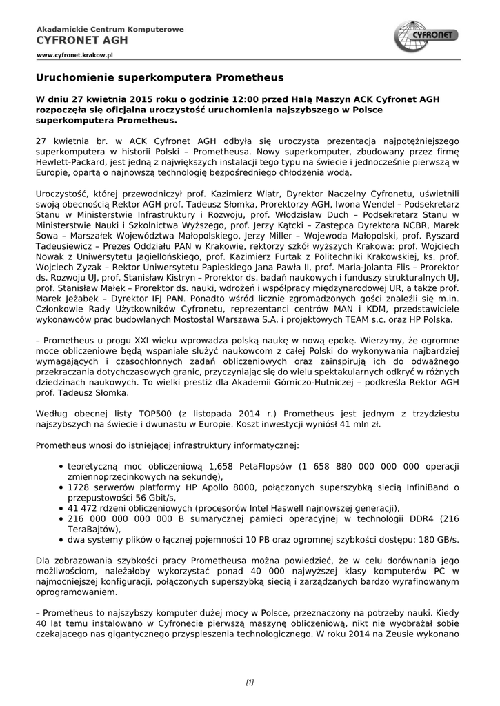 Uruchomienie superkomputera Prometheus W dniu 27 kwietnia 2015 roku o godzinie 12:00 przed Halą Maszyn ACK Cyfronet AGH rozpoczęła się oficjalna uroczystość uruchomienia najszybszego w Polsce superkomputera Prometheus. 27 kwietnia br. w ACK Cyfronet AGH odbyła się uroczysta prezentacja najpotężniejszego superkomputera w historii Polski – Prometheusa. Nowy superkomputer, zbudowany przez firmę Hewlett-Packard, jest jedną z największych instalacji tego typu na świecie i jednocześnie pierwszą w Europie, opartą o najnowszą technologię bezpośredniego chłodzenia wodą. Uroczystość, której przewodniczył prof. Kazimierz Wiatr, Dyrektor Naczelny Cyfronetu, uświetnili swoją obecnością Rektor AGH prof. Tadeusz Słomka, Prorektorzy AGH, Iwona Wendel – Podsekretarz Stanu w Ministerstwie Infrastruktury i Rozwoju, prof. Włodzisław Duch – Podsekretarz Stanu w Ministerstwie Nauki i Szkolnictwa Wyższego, prof. Jerzy Kątcki – Zastępca Dyrektora NCBR, Marek Sowa – Marszałek Województwa Małopolskiego, Jerzy Miller – Wojewoda Małopolski, prof. Ryszard Tadeusiewicz – Prezes Oddziału PAN w Krakowie, rektorzy szkół wyższych Krakowa: prof. Wojciech Nowak z Uniwersytetu Jagiellońskiego, prof. Kazimierz Furtak z Politechniki Krakowskiej, ks. prof. Wojciech Zyzak – Rektor Uniwersytetu Papieskiego Jana Pawła II, prof. Maria-Jolanta Flis – Prorektor ds. Rozwoju UJ, prof. Stanisław Kistryn – Prorektor ds. badań naukowych i funduszy strukturalnych UJ, prof. Stanisław Małek – Prorektor ds. nauki, wdrożeń i współpracy międzynarodowej UR, a także prof. Marek Jeżabek – Dyrektor IFJ PAN. Ponadto wśród licznie zgromadzonych gości znaleźli się m.in. Członkowie Rady Użytkowników Cyfronetu, reprezentanci centrów MAN i KDM, przedstawiciele wykonawców prac budowlanych Mostostal Warszawa S.A. i projektowych TEAM s.c. oraz HP Polska. – Prometheus u progu XXI wieku wprowadza polską naukę w nową epokę. Wierzymy, że ogromne moce obliczeniowe będą wspaniale służyć naukowcom z całej Polski do wykonywania najbardziej wymagających i czasochłonnych zadań obliczeniowych oraz zainspirują ich do odważnego przekraczania dotychczasowych granic, przyczyniając się do wielu spektakularnych odkryć w różnych dziedzinach naukowych. To wielki prestiż dla Akademii Górniczo-Hutniczej – podkreśla Rektor AGH prof. Tadeusz Słomka. Według obecnej listy TOP500 (z listopada 2014 r.) Prometheus jest jednym z trzydziestu najszybszych na świecie i dwunastu w Europie. Koszt inwestycji wyniósł 41 mln zł. Prometheus wnosi do istniejącej infrastruktury informatycznej: teoretyczną moc obliczeniową 1,658 PetaFlopsów (1 658 880 000 000 000 operacji zmiennoprzecinkowych na sekundę), 1728 serwerów platformy HP Apollo 8000, połączonych superszybką siecią InfiniBand o przepustowości 56 Gbit/s, 41 472 rdzeni obliczeniowych (procesorów Intel Haswell najnowszej generacji), 216 000 000 000 000 B sumarycznej pamięci operacyjnej w technologii DDR4 (216 TeraBajtów), dwa systemy plików o łącznej pojemności 10 PB oraz ogromnej szybkości dostępu: 180 GB/s. Dla zobrazowania szybkości pracy Prometheusa można powiedzieć, że w celu dorównania jego możliwościom, należałoby wykorzystać ponad 40 000 najwyższej klasy komputerów PC w najmocniejszej konfiguracji, połączonych superszybką siecią i zarządzanych bardzo wyrafinowanym oprogramowaniem. – Prometheus to najszybszy komputer dużej mocy w Polsce, przeznaczony na potrzeby nauki. Kiedy 40 lat temu instalowano w Cyfronecie pierwszą maszynę obliczeniową, nikt nie wyobrażał sobie czekającego nas gigantycznego przyspieszenia technologicznego. W roku 2014 na Zeusie wykonano [1] obliczenia dla prawie 8 milionów zadań o łącznym czasie obliczeń prawie 13 000 lat. Prowadzone obliczenia dotyczą wszystkich dziedzin: modelowanie nowych materiałów czy symulacje dynamiki molekularnej to jeden z przykładów ciężkich czyli bardzo „obliczeniożernych" obliczeń prowadzonych przy wykorzystaniu superkomputerów Cyfronetu. Te obliczenia służą badaniom bardzo blisko związanym z życiem każdego z nas. Gdy zrozumiemy, jak zachodzi proces fałdowania białka, będziemy bliżej skutecznego leczenia choroby Alzheimera. Takich badań wspieranych obliczeniami jest bardzo wiele i wymagają one olbrzymich mocy obliczeniowych. Jeśli chcemy, żeby polska nauka miała swoje ważne miejsce w świecie i aby z nauki polskiej mogła czerpać nasza gospodarka, musimy budować dla niej zaplecze informatyczne. To właśnie staramy się robić w ramach działalności Cyfronetu! – mówi prof. Kazimierz Wiatr. Dzięki innowacyjnej technologii bezpośredniego chłodzenia wodą procesorów i modułów pamięci operacyjnej, Prometheus stanie się jednocześnie jednym z najbardziej energooszczędnych komputerów tej klasy na świecie. Do utrzymania odpowiedniej temperatury cieczy w naszym klimacie wystarczą tanie w eksploatacji tzw. dry-coolery, zamiast generatorów wody lodowej, konsumujących duże ilości energii elektrycznej. Rozwiązanie to pozytywnie wpłynie nie tylko na niezawodność, ale także pozwoli uzyskać wydajność znacznie większą niż dla analogicznej instalacji opartej o klasyczne chłodzenie powietrzem. W praktyce oznacza to, że komputer będzie pobierał mniej mocy elektrycznej w przeliczeniu na 1 TeraFlops. Ponadto, chłodzenie cieczą umożliwia osiągnięcie ekstremalnie wysokiej gęstości instalacji 144 serwerów obliczeniowych w pojedynczej szafie, dzięki czemu ważąca ponad trzydzieści ton część obliczeniowa mieści się w zaledwie piętnastu szafach (na powierzchni 13 m2). Dla zobrazowania funkcjonalności przyjętego rozwiązania, wystarczy porównać gęstość upakowania w szafach do zastosowania tradycyjnego chłodzenia powietrzem. Prometheus zajmowałby wówczas znacznie więcej miejsca! W technologii Zeusa byłoby to już 120 szaf, a w technologii niedawn