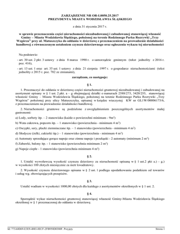 ZARZĄDZENIE NR OR-I.0050.25.2017 PREZYDENTA MIASTA WODZISŁAWIA ŚLĄSKIEGO z dnia 31 stycznia 2017 r. w sprawie przeznaczenia części nieruchomości niezabudowanej i zabudowanej stanowiącej własność Gminy – Miasta Wodzisławia Śląskiego, położonej na terenie Rodzinnego Parku Rozrywki „Trzy Wzgórza” przy ul. Matuszczyka do oddania w dzierżawę z przeznaczeniem na prowadzenie działalności handlowej z równoczesnym ustaleniem czynszu dzierżawnego oraz ogłoszenia wykazu tej nieruchomości Na podstawie: - art. 30 ust. 2 pkt. 3 ustawy z dnia 8 marca 1990 r. o samorządzie gminnym (tekst jednolity z 2016 r. poz. 416), - art. 13 ust. 1 oraz art. 35 ust. 1 ustawy z dnia 21 sierpnia 1997 r. o gospodarce nieruchomościami (tekst jednolity z 2015 r. poz. 782 ze zmianami), zarządzam, co następuje: § 1. 1. Przeznaczyć do oddania w dzierżawę części nieruchomości gruntowej niezabudowanej i zabudowanej na asortyment opisany w § 1 ust. 2 pkt. a – g obejmującej działki o numerach 2588/273, 3420/255, stanowiącej własność Gminy – Miasta Wodzisławia Śląskiego, położonej na terenie Rodzinnego Parku Rozrywki „Trzy Wzgórza” położonej przy ulicy Matuszczyka, opisanej w księdze wieczystej KW nr GL1W/00006173/6, z przeznaczeniem na prowadzenie działalności handlowej. 2. Nieruchomości gruntowe są podzielone z uwzględnieniem poszczególnych asortymentów małej gastronomi: a) Lody, sorbety itp. – 2 stanowiska (każde o powierzchni minimum - 9m2) b) Wata cukrowa, popcorn itp. – 1 stanowisko (powierzchnia - minimum 4 m2) c) Oscypki, sery, placki ziemniaczane itp. – 1 stanowisko (powierzchnia - minimum 4 m2) d) Słodycze (żelki, cukierki itp.) – 1 stanowisko (powierzchnia - minimum 4 m2) e) Automaty sprzedające gorące napoje oraz zimne napoje i przekąski - 2 automaty (minimum 2 m2) f) Zabawki, balony itp. - 1 stanowisko (powierzchnia minimum 2 m2) g) Napoje ciepłe - 1 stanowisko (powierzchnia minimum 4 m2) § 2. 1. Ustalić wywoławczą wysokość czynszu dzierżawy za nieruchomość opisaną w § 1 ust.2 pkt a.) - g.) w wysokości 100 złotych miesięcznie za metr kwadratowy. 2. Wysokość czynszu dzierżawnego opisana w § 2 ust. 1 podlega opodatkowaniu podatkiem od towarów i usług wg. obowiązujących przepisów. § 3. Ustalić wadium w wysokości 1000,00 złotych dla każdego z asortymentów określonych w § 1 ust. 2. § 4. Sporządzić wykaz nieruchomości gruntowej stanowiącej własność Gminy-Miasta Wodzisławia Śląskiego określonej w § 1 przeznaczonej do oddania w dzierżawę. Id: 773A0D69-E3E9-4803-8ECF-2FB950D0380F. Przyjęty Strona 1 § 5. Podać do publicznej wiadomości wykaz nieruchomości, o którym mowa w § 3 niniejszego zarządzenia poprzez wywieszenie na okres 21 dni na tablicy ogłoszeń w siedzibie Urzędu Miasta Wodzisławia Śl. ul. Bogumińska 4b, opublikować w prasie o zasięgu lokalnym informacji o wywieszeniu wykazu oraz zamieścić wykaz na stronie internetowej Urzędu Miasta. § 6. Stawka czynszu za dzierżawę wzrośnie automatycznie po upływie każdego roku kalendarzowego według średniorocznego wskaźnika cen towarów i usług konsumpcyjnych za rok ubiegły według danych ogłaszanych przez Główny Urząd Statystyczny w Monitorze Polskim. § 7. Zarządzenie wchodzi w życie z dniem podjęcia. Prezydent Miasta Mieczysław Kieca Id: 773A0D69-E3E9-4803-8ECF-2FB950D0380F. Przyjęty Strona 2