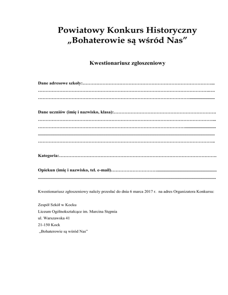 Powiatowy Konkurs Historyczny „Bohaterowie są wśród Nas” Kwestionariusz zgłoszeniowy Dane adresowe szkoły:…………………………………………………………………………... ………………………………………………………………………………………………….…. ………………………………………………………………………………………...................... Dane uczniów (imię i nazwisko, klasa):…………………………………………………………. ……………………………………………………………………………………………………... ……………………………………………………………………………………........................... .......................................................................................................................................................... …………………………………………………………………………………………………….. Kategoria:…………………………………………………………………………………………. Opiekun (imię i nazwisko, tel. e-mail)………………………….................................................... ........................................................................................................................................................... Kwestionariusz zgłoszeniowy należy przesłać do dnia 6 marca 2017 r. na adres Organizatora Konkursu: Zespół Szkół w Kocku Liceum Ogólnokształcące im. Marcina Stępnia ul. Warszawska 41 21-150 Kock „Bohaterowie są wśród Nas”