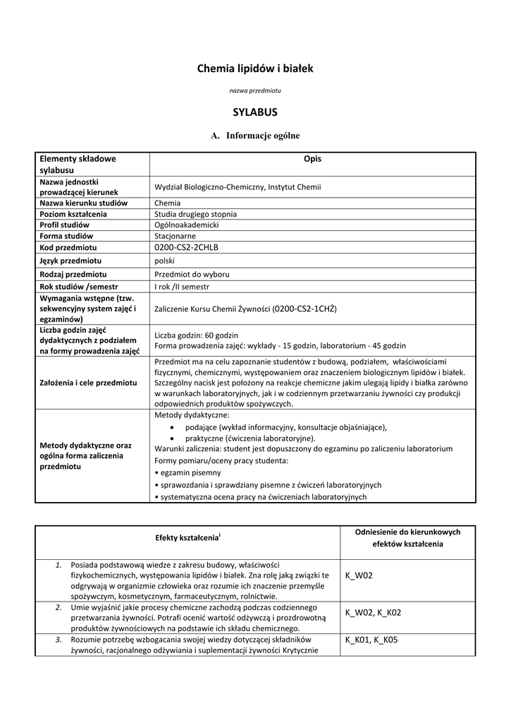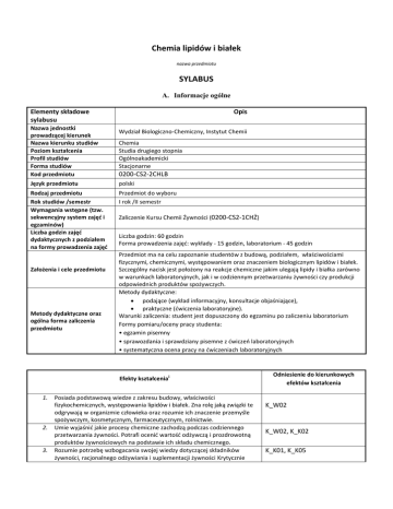Chemia lipidów i białek nazwa przedmiotu SYLABUS A. Informacje ogólne Elementy składowe sylabusu Nazwa jednostki prowadzącej kierunek Nazwa kierunku studiów Poziom kształcenia Profil studiów Forma studiów Kod przedmiotu Opis Wydział Biologiczno-Chemiczny, Instytut Chemii Chemia Studia drugiego stopnia Ogólnoakademicki Stacjonarne 0200-CS2-2CHLB Język przedmiotu polski Rodzaj przedmiotu Rok studiów /semestr Wymagania wstępne (tzw. sekwencyjny system zajęć i egzaminów) Liczba godzin zajęć dydaktycznych z podziałem na formy prowadzenia zajęć Przedmiot do wyboru I rok /II semestr Założenia i cele przedmiotu Metody dydaktyczne oraz ogólna forma zaliczenia przedmiotu Zaliczenie Kursu Chemii Żywności (0200-CS2-1CHŻ) Liczba godzin: 60 godzin Forma prowadzenia zajęć: wykłady - 15 godzin, laboratorium - 45 godzin Przedmiot ma na celu zapoznanie studentów z budową, podziałem, właściwościami fizycznymi, chemicznymi, występowaniem oraz znaczeniem biologicznym lipidów i białek. Szczególny nacisk jest położony na reakcje chemiczne jakim ulegają lipidy i białka zarówno w warunkach laboratoryjnych, jak i w codziennym przetwarzaniu żywności czy produkcji odpowiednich produktów spożywczych. Metody dydaktyczne: podające (wykład informacyjny, konsultacje objaśniające), praktyczne (ćwiczenia laboratoryjne). Warunki zaliczenia: student jest dopuszczony do egzaminu po zaliczeniu laboratorium Formy pomiaru/oceny pracy studenta: • egzamin pisemny • sprawozdania i sprawdziany pisemne z ćwiczeń laboratoryjnych • systematyczna ocena pracy na ćwiczeniach laboratoryjnych Efekty kształceniai 1. 2. 3. Posiada podstawową wiedze z zakresu budowy, właściwości fizykochemicznych, występowania lipidów i białek. Zna rolę jaką związki te odgrywają w organizmie człowieka oraz rozumie ich znaczenie przemyśle spożywczym, kosmetycznym, farmaceutycznym, rolnictwie. Umie wyjaśnić jakie procesy chemiczne zachodzą podczas codziennego przetwarzania żywności. Potrafi ocenić wartość odżywczą i prozdrowotną produktów żywnościowych na podstawie ich składu chemicznego. Rozumie potrzebę wzbogacania swojej wiedzy dotyczącej składników żywności, racjonalnego odżywiania i suplementacji żywności Krytycznie Odniesienie do kierunkowych efektów kształcenia K_W02 K_W02, K_K02 K_K01, K_K05 4. podchodzi do informacji rozpowszechnianych w mediach, szczególnie z zakresu chemii żywności, chemii kosmetycznej. Planuje i wykonuje eksperymenty z zachowaniem podstawowych zasad BHP. Umie przedstawić i wyjaśnić rezultaty przeprowadzonych badań. K_W07, K_U01, K_U07 Punkty ECTS 5 Bilans nakładu pracy ii studenta Ogólny nakład pracy studenta: 125 godz. w tym: udział w zajęciach: 60 godz.; przygotowanie się do zajęć, zaliczeń i egzaminu: 57,5 godz.; udział w konsultacjach, zaliczeniach, egzaminie: 7,5 godz. iii Wskaźniki ilościowe Data opracowania: Nakład pracy studenta związany z zajęciami : Liczba godzin Punkty ECTS wymagającymi bezpośredniego udziału nauczyciela 67,5 2,7 o charakterze praktycznym 110,0 4,4 2015-02-12 Koordynator przedmiotu: Dr hab. Agnieszka Wojtkielewicz SYLABUS B. Informacje szczegółowe Elementy składowe sylabusu Nazwa przedmiotu Kod przedmiotu Nazwa kierunku Nazwa jednostki prowadzącej kierunek Język przedmiotu Rok studiów/ semestr Liczba godzin zajęć dydaktycznych oraz forma prowadzenia zajęć Prowadzący Treści merytoryczne przedmiotu Efekty kształcenia wraz ze sposobem ich weryfikacji Opis Chemia lipidów i białek 0200-CS2-2CHLB Chemia Wydział Biologiczno-Chemiczny, Instytut Chemii polski I rok/ II semestr Liczba godzin: 15 godz. Forma prowadzenia zajęć: wykład Dr hab. Agnieszka Wojtkielewicz Lipidy – definicja, podział, występowanie, rola biologiczna, metody izolacji i oczyszczania. Kwasy tłuszczowe i lipidy proste (woski, acyloglicerole) – budowa, podział, nomenklatura, właściwości i fizykochemiczne, rola biologiczna, reakcje chemiczne (w tym przemiany chemiczne zachodzące w czasie obróbki (np. smażenie) i przechowywania żywności (jełczenie), zastosowanie w przemyśle olechemicznym. Antyoksydanty Lipidy złożone (fosfolipidy, glikolipidy i inne np. sulfolipidy) - budowa i właściwości i fizykochemiczne, rola biologiczna Pochodne lipidów (kwasy tłuszczowe, sterole, alkohole lipidowe, węglowodory (np. karotenoidy), witaminy rozpuszczalne w tłuszczach (A, D, E, K) - budowa i właściwości i fizykochemiczne, rola biologiczna. Aminokwasy - klasyfikacja, występowanie, właściwości fizyczne i chemiczne, ulepszacze żywności. Peptydy i białka – podział, nomenklatura, budowa (I-IV rzęd. struktura), właściwości fizyczne, reakcje chemiczne (w tym przemiany chemiczne zachodzące w czasie obróbki i przechowywania żywności (np. reakcja Maillarda) oraz stosowane w przetwórstwie spożywczym). Posiada podstawową wiedze z zakresu budowy, właściwości, występowania lipidów i białek. Zna i rozumie rolę jaką związki te odgrywają w organizmie człowieka oraz w przemyśle spożywczym, kosmetycznym, farmaceutycznym, rolnictwie. Prawidłowo objaśnia przemiany chemiczne biomolekuł. Prawidłowo interpretuje zależność właściwości biomolekuł od ich budowy chemicznej. Potrafi ocenić wartość odżywczą i prozdrowotną produktów żywnościowych na podstawie ich składu chemicznego. Rozumie potrzebę wzbogacania swojej wiedzy dotyczącej składników żywności, racjonalnego odżywiania i suplementacji żywność. Efekty kształcenia będą sprawdzane na podstawie oceny egzaminu pisemnego. Forma i warunki zaliczenia przedmiotu Wykaz literatury podstawowej i uzupełniającej Warunki zaliczenia: student jest dopuszczony do egzaminu po zaliczeniu laboratorium. Obecność na wykładach nie jest warunkiem koniecznym do przystąpienia do egzaminu. 1. 2. 3. 4. „Chemia Żywności” (tom 2) pod red. Z. E.Sikorskiego WNT Warszawa 2002 A. Kołodziejczyk “Naturalne Związ