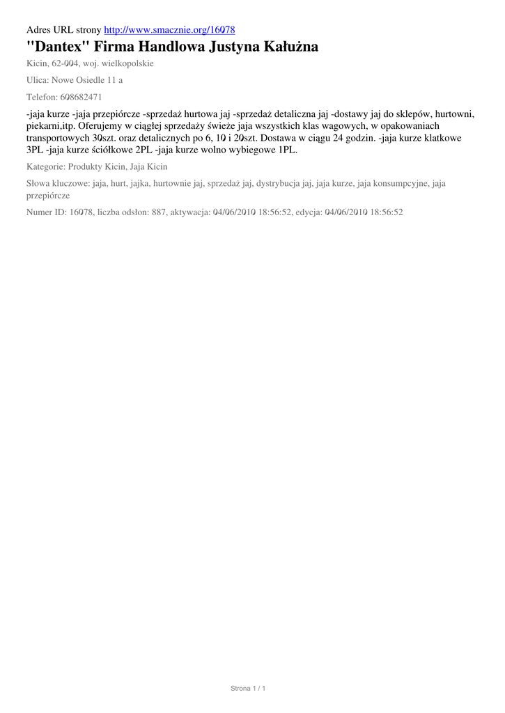 Adres URL strony http://www.smacznie.org/16078 "Dantex" Firma Handlowa Justyna Kałużna Kicin, 62-004, woj. wielkopolskie Ulica: Nowe Osiedle 11 a Telefon: 608682471 -jaja kurze -jaja przepiórcze -sprzedaż hurtowa jaj -sprzedaż detaliczna jaj -dostawy jaj do sklepów, hurtowni, piekarni,itp. Oferujemy w ciągłej sprzedaży świeże jaja wszystkich klas wagowych, w opakowaniach transportowych 30szt. oraz detalicznych po 6, 10 i 20szt. Dostawa w ciągu 24 godzin. -jaja kurze klatkowe 3PL -jaja kurze ściółkowe 2PL -jaja kurze wolno wybiegowe 1PL. Kategorie: Produkty Kicin, Jaja Kicin Słowa kluczowe: jaja, hurt, jajka, hurtownie jaj, sprzedaż jaj, dystrybucja jaj, jaja kurze, jaja konsumpcyjne, jaja przepiórcze Numer ID: 16078, liczba odsłon: 887, aktywacja: 04/06/2010 18:56:52, edycja: 04/06/2010 18:56:52 Strona 1 / 1