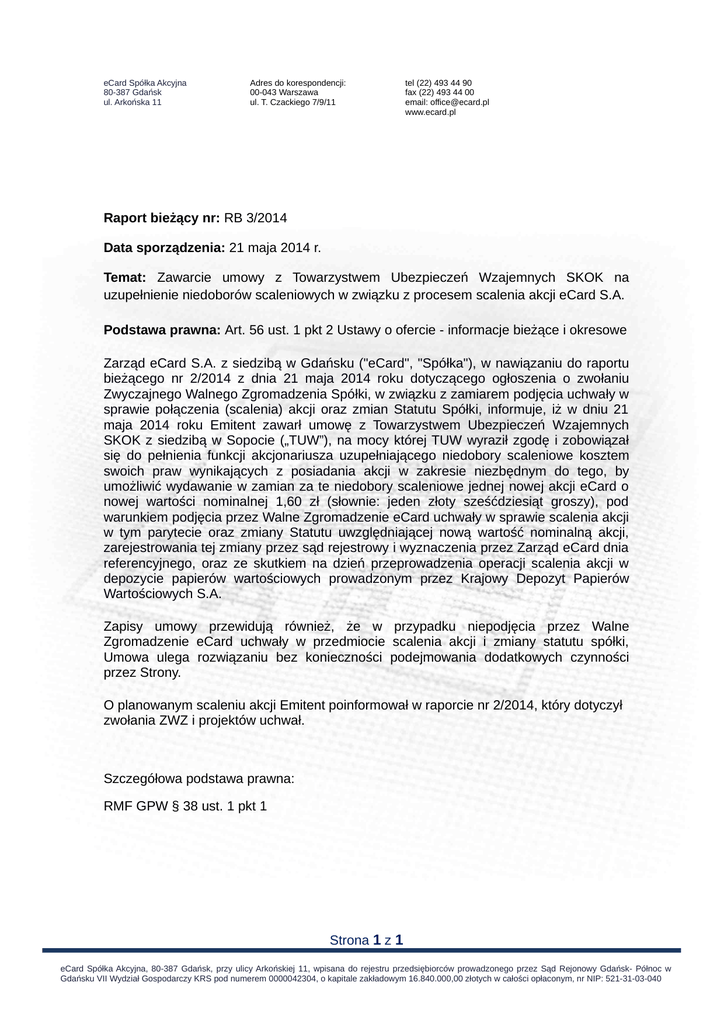 eCard Spółka Akcyjna 80-387 Gdańsk ul. Arkońska 11 Adres do korespondencji: 00-043 Warszawa ul. T. Czackiego 7/9/11 tel (22) 493 44 90 fax (22) 493 44 00 email: [email protected] www.ecard.pl Raport bieżący nr: RB 3/2014 Data sporządzenia: 21 maja 2014 r. Temat: Zawarcie umowy z Towarzystwem Ubezpieczeń Wzajemnych SKOK na uzupełnienie niedoborów scaleniowych w związku z procesem scalenia akcji eCard S.A. Podstawa prawna: Art. 56 ust. 1 pkt 2 Ustawy o ofercie - informacje bieżące i okresowe Zarząd eCard S.A. z siedzibą w Gdańsku ("eCard", "Spółka"), w nawiązaniu do raportu bieżącego nr 2/2014 z dnia 21 maja 2014 roku dotyczącego ogłoszenia o zwołaniu Zwyczajnego Walnego Zgromadzenia Spółki, w związku z zamiarem podjęcia uchwały w sprawie połączenia (scalenia) akcji oraz zmian Statutu Spółki, informuje, iż w dniu 21 maja 2014 roku Emitent zawarł umowę z Towarzystwem Ubezpieczeń Wzajemnych SKOK z siedzibą w Sopocie („TUW”), na mocy której TUW wyraził zgodę i zobowiązał się do pełnienia funkcji akcjonariusza uzupełniającego niedobory scaleniowe kosztem swoich praw wynikających z posiadania akcji w zakresie niezbędnym do tego, by umożliwić wydawanie w zamian za te niedobory scaleniowe jednej nowej akcji eCard o nowej wartości nominalnej 1,60 zł (słownie: jeden złoty sześćdziesiąt groszy), pod warunkiem podjęcia przez Walne Zgromadzenie eCard uchwały w sprawie scalenia akcji w tym parytecie oraz zmiany Statutu uwzględniającej nową wartość nominalną akcji, zarejestrowania tej zmiany przez sąd rejestrowy i wyznaczenia przez Zarząd eCard dnia referencyjnego, oraz ze skutkiem na dzień przeprowadzenia operacji scalenia akcji w depozycie papierów wartościowych prowadzonym przez Krajowy Depozyt Papierów Wartościowych S.A. Zapisy umowy przewidują również, że w przypadku niepodjęcia przez Walne Zgromadzenie eCard uchwały w przedmiocie scalenia akcji i zmiany statutu spółki, Umowa ulega rozwiązaniu bez konieczności podejmowania dodatkowych czynności przez Strony. O planowanym scaleniu akcji Emitent poinformował w raporcie nr 2/2014, który dotyczył zwołania ZWZ i projektów uchwał. Szczegółowa podstawa prawna: RMF GPW § 38 ust. 1 pkt 1 Strona 1 z 1 eCard Spółka Akcyjna, 80-387 Gdańsk, przy ulicy Arkońskiej 11, wpisana do rejestru przedsiębiorców prowadzonego przez Sąd Rejonowy Gdańsk- Północ w Gdańsku VII Wydział Gospodarczy KRS pod numerem 0000042304, o kapitale zakładowym 16.840.000,00 złotych w całości opłaconym, nr NIP: 521-31-03-040