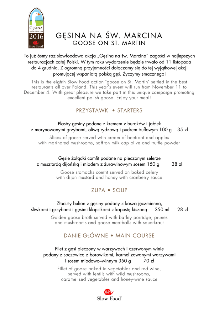G Ę S I N A N A Ś W. M A R C I N A G O O S E O N ST. M A RT I N To już ósmy raz slowfoodowa akcja „Gęsina na św. Marcina” zagości w najlepszych restauracjach całej Polski. W tym roku wydarzenie będzie trwało od 11 listopada do 4 grudnia. Z ogromną przyjemności dołączamy się do tej wyjątkowej akcji promującej wspaniałą polską gęś. Życzymy smacznego! This is the eighth Slow Food action "goose on St. Martin" settled in the best restaurants all over Poland. This year's event will run from November 11 to December 4. With great pleasure we take part in this unique campaign promoting excellent polish goose. Enjoy your meal! PRZYSTAWKI • STARTERS Plastry gęsiny podane z kremem z buraków i jabłek z marynowanymi grzybami, oliwą rydzową i pudrem truflowym 100 g 35 zł Slices of goose served with cream of beetroot and apples with marinated mushrooms, saffron milk cap olive and truffle powder Gęsie żołądki comfit podane na pieczonym selerze z musztardą dijońską i miodem z żurawinowym sosem 150 g 38 zł Goose stomachs comfit served on baked celery with dijon mustard and honey with cranberry sauce ZUPA • SOUP Złocisty bulion z gęsiny podany z kaszą jęczmienną, śliwkami i grzybami i gęsimi klopsikami z kapustą kiszoną 250 ml Golden goose broth served with barley porridge, prunes and mushrooms and goose meatballs with sauerkraut DANIE GŁÓWNE • MAIN COURSE Filet z gęsi pieczony w warzywach i czerwonym winie podany z soczewicą z borowikami, karmelizowanymi warzywami i sosem miodowo–winnym 350 g 70 zł Fillet of goose baked in vegetables and red wine, served with lentils with wild mushrooms, caramelised vegetables and honey-wine sauce 28 zł