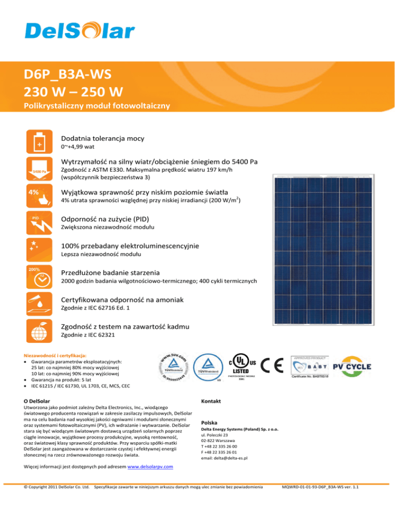 D6P_B3A-WS 230 W – 250 W Polikrystaliczny moduł fotowoltaiczny Dodatnia tolerancja mocy 0~+4,99 wat Wytrzymałość na silny wiatr/obciążenie śniegiem do 5400 Pa Zgodność z ASTM E330. Maksymalna prędkość wiatru 197 km/h (współczynnik bezpieczeństwa 3) Wyjątkowa sprawność przy niskim poziomie światła 2 4% utrata sprawności względnej przy niskiej irradiancji (200 W/m ) Odporność na zużycie (PID) Zwiększona niezawodność modułu 100% przebadany elektroluminescencyjnie Lepsza niezawodność modułu Przedłużone badanie starzenia 2000 godzin badania wilgotnościowo-termicznego; 400 cykli termicznych Certyfikowana odporność na amoniak Zgodnie z IEC 62716 Ed. 1 Zgodność z testem na zawartość kadmu Zgodnie z IEC 62321 Niezawodność i certyfikacja: • Gwarancja parametrów eksploatacyjnych: 25 lat: co najmniej 80% mocy wyjściowej 10 lat: co najmniej 90% mocy wyjściowej • Gwarancja na produkt: 5 lat • IEC 61215 / IEC 61730, UL 1703, CE, MCS, CEC O DelSolar Kontakt Utworzona jako podmiot zależny Delta Electronics, Inc., wiodącego światowego producenta rozwiązań w zakresie zasilaczy impulsowych, DelSolar ma na celu badania nad wysokiej jakości ogniwami i modułami słonecznymi oraz systemami fotowoltaicznymi (PV), ich wdrażanie i wytwarzanie. DelSolar stara się być wiodącym światowym dostawcą urządzeń solarnych poprzez ciągłe innowacje, wyjątkowe procesy produkcyjne, wysoką rentowność, oraz światowej klasy sprawność produktów. Przy wsparciu spółki-matki DelSolar jest zaangażowana w dostarczanie czystej i efektywnej energii słonecznej na rzecz zrównoważonego rozwoju świata. Polska Delta Energy Systems (Poland) Sp. z o.o. ul. Poleczki 23 02-822 Warszawa T +48 22 335 26 00 F +48 22 335 26 01 email: [email protected] Więcej informacji jest dostępnych pod adresem www.delsolarpv.com © Copyright 2011 DelSolar Co. Ltd. Specyfikacje zawarte w niniejszym arkuszu danych mogą ulec zmianie bez powiadomienia MQWRD-01-01-93-D6P_B3A-WS ver. 1.1 Dane elektryczne Widok od przodu i widok od tyłu Model D6P230B3A D6P235B3A D6P240B3A D6P245B3A D6P250B3A Maksymalna moc znamionowa (Pmax) 230 W 235 W 240 W 245 W 250 W Sprawność modułu 14,1% 14,4% 14,7% 15,0% 15,3% Napięcie obwodu otwartego (Voc) 36,33 V 36,82 V 36,96 V 37,10 V 37,37 V Napięcie przy mocy maksymalnej (Vpm) 29,53 V 29,71 V 30,20 V 30,65 V 30,95 V Prąd zwarciowy (Isc) 8,35 A 8,44 A 8,49 A 8,54 A 8,63A Prąd przy mocy maksymalnej (Ipm) 7,79 A 7,91 A 7,97 A 8,02 A 8,12 A • Dane elektryczne zgodnie ze standardowymi warunkami badań (STC): temperatura ogniwa 25oC, 2 irradiancja 1000 W/m , AM 1,5 • Wartości bez tolerancji to wartości typowe Dane mechaniczne Pozycja Specyfikacja Wymiary 1650 mm (dł.) x 990 mm (szer.) x 42 mm (gł.) / 65” (dł.) x 39” (szer.) x 1,65” (gł.) Masa 18,5 kg / 41 lbs Ogniwo słoneczne 60 polikrystalicznych ogniw silikonowych 6” (156 x 156 mm) Szyba przednia Antyrefleksyjne hartowane szkło solarne, grubość 3,2 mm Hermetyzowanie ogniw EVA (Ethylene-Vinyl-Acetate) Pokrycie tylne Kompozytowe, białe Skrzynka połączeniowa Zgodna z IP 65 Rama Ocynkowana rama aluminiowa, kolor naturalny lub czarny Zależność od temperatury Warunki eksploatacji Pozycja Specyfikacja Obciążenie mechaniczne 5400 Pa (certyfikowane przez TÜV Rheinland) Maksymalne napięcie systemu IEC: DC 1000 V / UL: DC 600 V Prąd nominalny bezpiecznika dla połączenia szeregowego 15 A Temperatura pracy -40 do +85 oC Charakterystyka temperaturowa Pozycja Normalna pracy ogniwa Zależność od irradiancji Specyfikacja temperatura 44,1 oC ± 2 oC Współczynnik temperaturowy Isc 0,05 %/oC Współczynnik temperaturowy Voc -0,35 %/oC Współczynnik temperaturowy Pmax -0,46 %/oC o • Normalna temperatura pracy ogniwa (NOCT): irrandiancja 800 W/m2, temperatura otoczenia 20 C, prędkość wiatru 1 m/s • Przed rozpoczęciem korzystania z produktu należy zapoznać się ze Standardową Instrukcją Montażu Modułów DelSolar • Spadek sprawności przy zmniejszeniu z 1000 W/m2 do 200 W/m2 przy 25 oC: 4% ±2% © Copyright 2011 DelSolar Co. Ltd. Specyfikacje zawarte w niniejszym arkuszu danych mogą ulec zmianie bez powiadomienia MQWRD-01-01-93-D6P_B3A-WS ver. 1.1