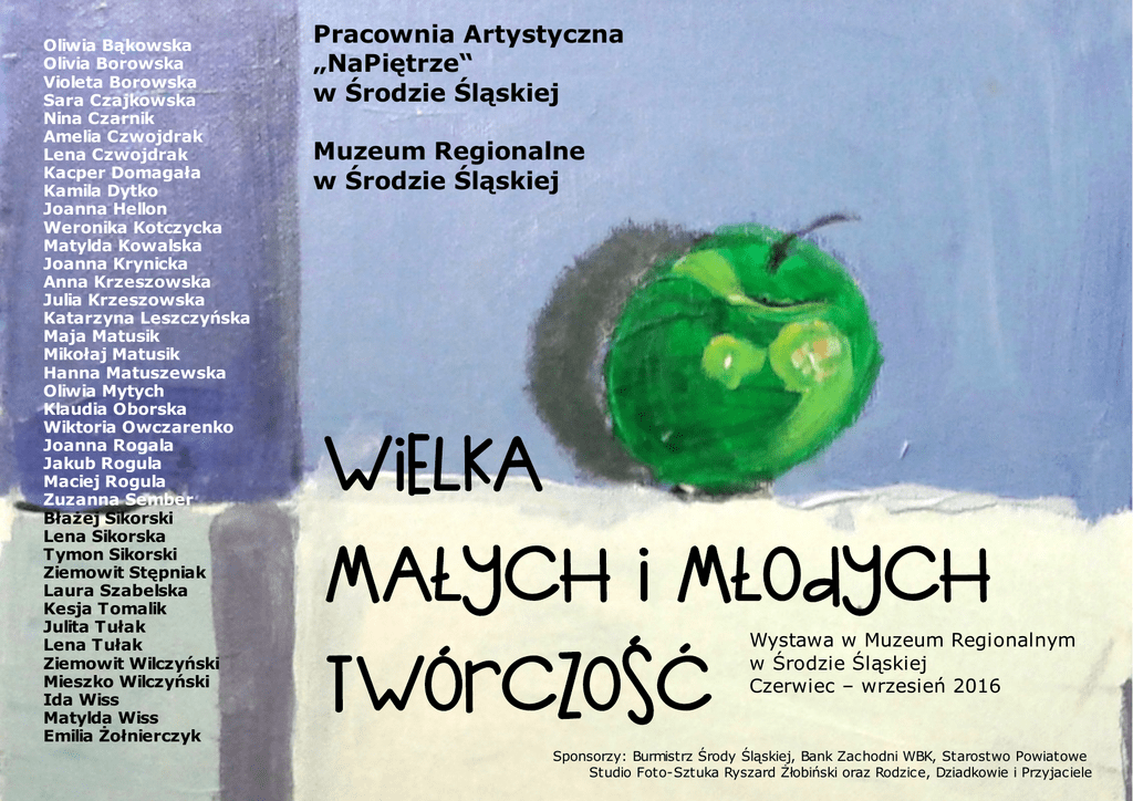 Oliwia Bąkowska Olivia Borowska Violeta Borowska Sara Czajkowska Nina Czarnik Amelia Czwojdrak Lena Czwojdrak Kacper Domagała Kamila Dytko Joanna Hellon Weronika Kotczycka Matylda Kowalska Joanna Krynicka Anna Krzeszowska Julia Krzeszowska Katarzyna Leszczyńska Maja Matusik Mikołaj Matusik Hanna Matuszewska Oliwia Mytych Klaudia Oborska Wiktoria Owczarenko Joanna Rogala Jakub Rogula Maciej Rogula Zuzanna Sember Błażej Sikorski Lena Sikorska Tymon Sikorski Ziemowit Stępniak Laura Szabelska Kesja Tomalik Julita Tułak Lena Tułak Ziemowit Wilczyński Mieszko Wilczyński Ida Wiss Matylda Wiss Emilia Żołnierczyk Pracownia Artystyczna „NaPiętrze“ w Środzie Śląskiej Muzeum Regionalne w Środzie Śląskiej WIELKA MAŁYCH I MŁODYCH TWÓRCZOŚĆ Wystawa w Muzeum Regionalnym w Środzie Śląskiej Czerwiec – wrzesień 2016 Sponsorzy: Burmistrz Środy Śląskiej, Bank Zachodni WBK, Starostwo Powiatowe Studio Foto-Sztuka Ryszard Żłobiński oraz Rodzice, Dziadkowie i Przyjaciele
