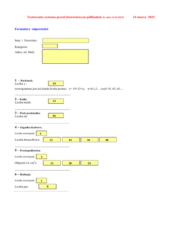 Testowanie systemu przed internetowym półfinałem (w dniu 21.03.2015) Formularz odpowiedzi Imię i Nazwisko: Kategoria: Adres, tel. Mail: 1 – Rachunek. 19 Liczba x : rozwiązaniem jest też każda liczba postaci x= 19+23×n, n=0,1,2… czyli 19, 42, 65,… 2 – Kulki. 12 Liczba kulek: 3 – Wiek pradziadka. 96 Liczba lat: 4 – Zagadka liczbowa. Liczba rozwiązań: 4 Liczba dwucyfrowa: 12 24 36 12 20 24 5 – Prostopadłościan. Liczba rozwiązań: 3 Objętość (w cm3): 6 – Kolacja. Liczba rozwiązań: Liczba par: 1 8 48 14 marca 2015