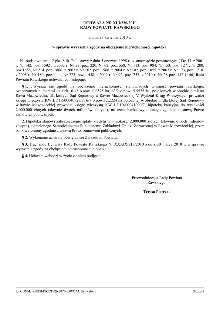 UCHWAŁA NR XLI/220/2010 RADY POWIATU RAWSKIEGO z dnia 23 kwietnia 2010 r. w sprawie wyrażenia zgody na obciążenie nieruchomości hipoteką Na podstawie art. 12 pkt. 8 lit. "a" ustawy z dnia 5 czerwca 1998 r. o samorządzie powiatowym ( Dz. U. z 2001 r. Nr 142, poz. 1592 , z 2002 r. Nr 23, poz. 220, Nr 62, poz. 558, Nr 113, poz. 984, Nr 153, poz. 1271, Nr 200, poz.1688, Nr 214, poz. 1806, z 2003 r. Nr 162, poz. 1568, z 2004 r. Nr 102, poz. 1055, z 2007 r. Nr 173, poz. 1218, z 2008 r. Nr 180, poz.1111, Nr 223, poz. 1458, z 2009 r. Nr 92, poz. 753, z 2010 r. Nr 28 poz. 142 i 146) Rada Powiatu Rawskiego uchwala, co następuje: § 1. 1. Wyraża się zgodę na obciążenie nieruchomości stanowiących własność powiatu rawskiego, oznaczonych numerami działek: 61/2 o pow. 0,0575 ha, 63/2 o pow. 5,5575 ha, położonych w obrębie 6 miasta Rawa Mazowiecka, dla których Sąd Rejonowy w Rawie Mazowieckiej V Wydział Ksiąg Wieczystych prowadzi księgę wieczystą KW LD1R/00040929/8; 6/7 o pow.12,2224 ha położonej w obrębie 5, dla której Sąd Rejonowy w Rawie Mazowieckiej prowadzi księgę wieczystą KW LD1R/00041000/7, hipoteką kaucyjną do wysokości 2.000.000 złotych (słownie dwóch milionów złotych), na rzecz banku wyłonionego zgodnie z ustawą Prawo zamówień publicznych. 2. Hipoteka stanowi zabezpieczenie spłaty kredytu w wysokości 2.000.000 złotych (słownie dwóch milionów złotych), udzielonego Samodzielnemu Publicznemu Zakładowi Opieki Zdrowotnej w Rawie Mazowieckiej, przez bank wyłoniony zgodnie z ustawą Prawo zamówień publicznych. § 2. Wykonanie uchwały powierza się Zarządowi Powiatu. § 3. Traci moc Uchwała Rady Powiatu Rawskiego Nr XXXIX/213/2010 z dnia 30 marca 2010 r. w sprawie wyrażenia zgody na obciążenie nieruchomości hipoteką. § 4. Uchwała wchodzi w życie z dniem podjęcia. Przewodnicząca Rady Powiatu Rawskiego Teresa Pietrzak Id: CUNMJ-SJEEB-ITGCF-QNBUW-OWOAJ. Uchwalony Strona 1 Uzasadnienie W celu prawidłowego funkcjonowania Samodzielnego Publicznego Zakładu Opieki Zdrowotnej w Rawie Mazowieckiej (w tym Szpitala Św. Ducha), podjęta została decyzja o zaciągnięciu kredytu hipotecznego. Kredyt zaciągnięty zostanie przez SP ZOZ w Rawie Mazowieckiej. Zabezpieczeniem kredytu będzie obciążenie nieruchomości wymienionych w uchwale, stanowiących własność powiatu rawskiego, hipoteką kaucyjną, na rzecz banku, który kredytu udzieli. Id: CUNMJ-SJEEB-ITGCF-QNBUW-OWOAJ. Uchwalony Strona 1