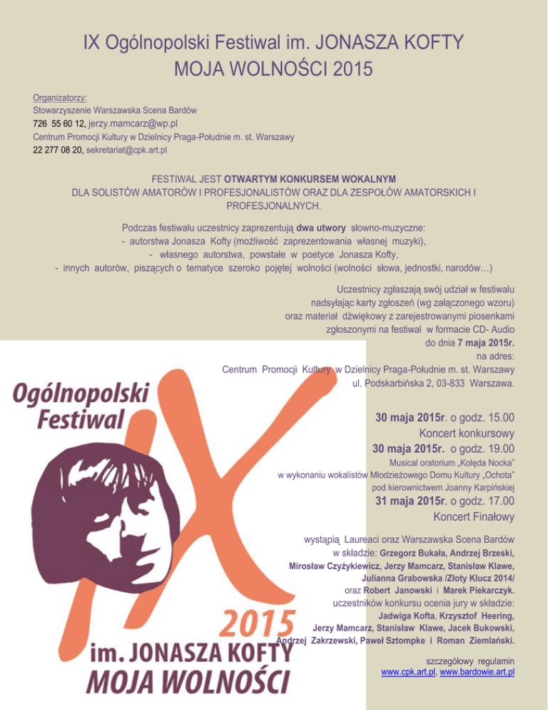 IX Ogólnopolski Festiwal im. JONASZA KOFTY MOJA WOLNOŚCI 2015 Organizatorzy: Stowarzyszenie Warszawska Scena Bardów 726 55 60 12, [email protected] Centrum Promocji Kultury w Dzielnicy Praga-Południe m. st. Warszawy 22 277 08 20, [email protected] FESTIWAL JEST OTWARTYM KONKURSEM WOKALNYM DLA SOLISTÓW AMATORÓW I PROFESJONALISTÓW ORAZ DLA ZESPOŁÓW AMATORSKICH I PROFESJONALNYCH. Podczas festiwalu uczestnicy zaprezentują dwa utwory słowno-muzyczne: - autorstwa Jonasza Kofty (możliwość zaprezentowania własnej muzyki), - własnego autorstwa, powstałe w poetyce Jonasza Kofty, - innych autorów, piszących o tematyce szeroko pojętej wolności (wolności słowa, jednostki, narodów…) Uczestnicy zgłaszają swój udział w festiwalu nadsyłając karty zgłoszeń (wg załączonego wzoru) oraz materiał dźwiękowy z zarejestrowanymi piosenkami zgłoszonymi na festiwal w formacie CD- Audio do dnia 7 maja 2015r. na adres: Centrum Promocji Kultury w Dzielnicy Praga-Południe m. st. Warszawy ul. Podskarbińska 2, 03-833 Warszawa. 30 maja 2015r. o godz. 15.00 Koncert konkursowy 30 maja 2015r. o godz. 19.00 Musical oratorium „Kolęda Nocka” w wykonaniu wokalistów Młodzieżowego Domu Kultury „Ochota” pod kierownictwem Joanny Karpińskiej 31 maja 2015r. o godz. 17.00 Koncert Finałowy wystąpią Laureaci oraz Warszawska Scena Bardów w składzie: Grzegorz Bukała, Andrzej Brzeski, Mirosław Czyżykiewicz, Jerzy Mamcarz, Stanisław Klawe, Julianna Grabowska /Złoty Klucz 2014/ oraz Robert Janowski i Marek Piekarczyk. uczestników konkursu ocenia jury w składzie: Jadwiga Kofta, Krzysztof Heering, Jerzy Mamcarz, Stanisław Klawe, Jacek Bukowski, Andrzej Zakrzewski, Paweł Sztompke i Roman Ziemlański. szczegółowy regulamin www.cpk.art.pl, www.bardowie.art.pl